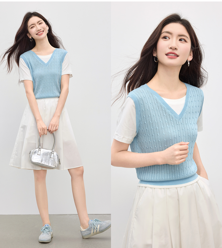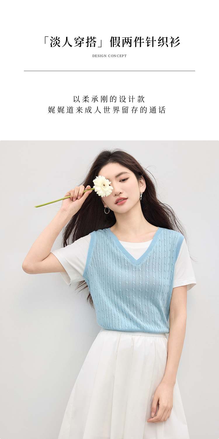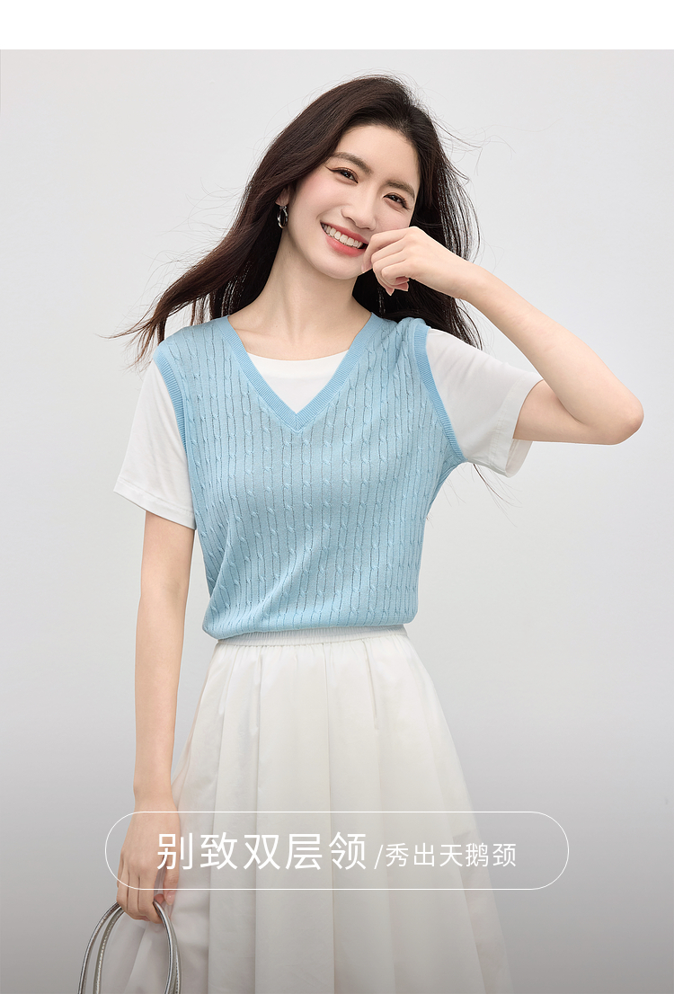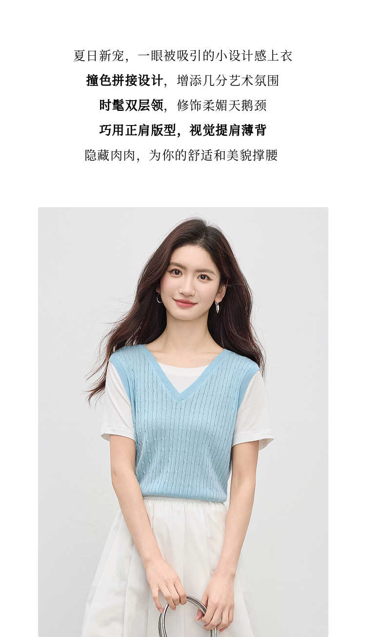 【周末秒杀】熙世界撞色短袖假两件针织衫女夏2025新款设计感正肩T恤拼接上衣