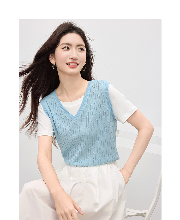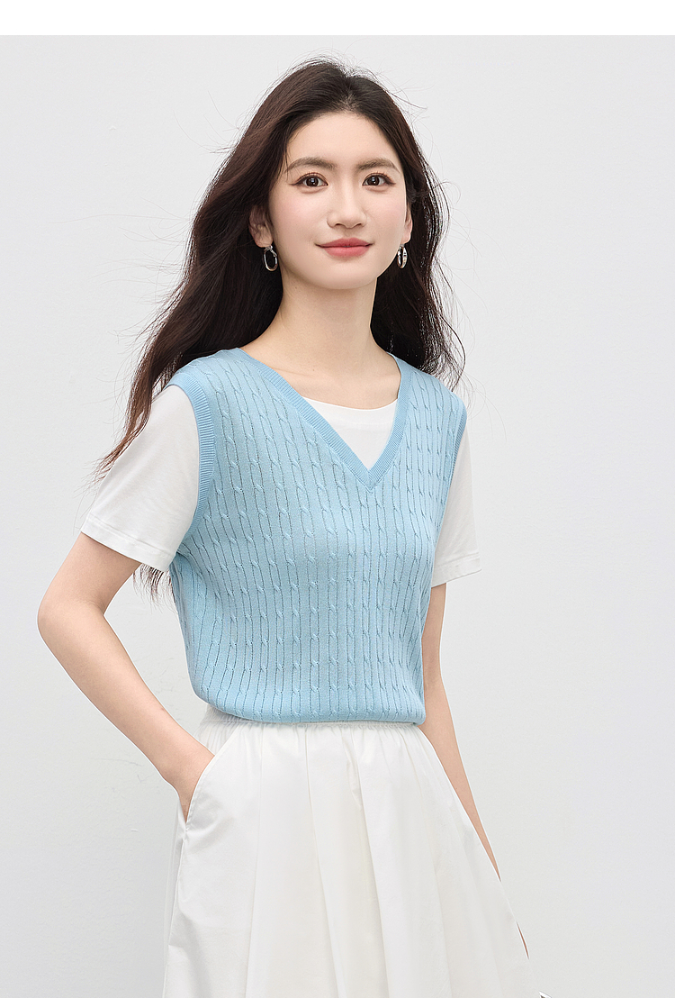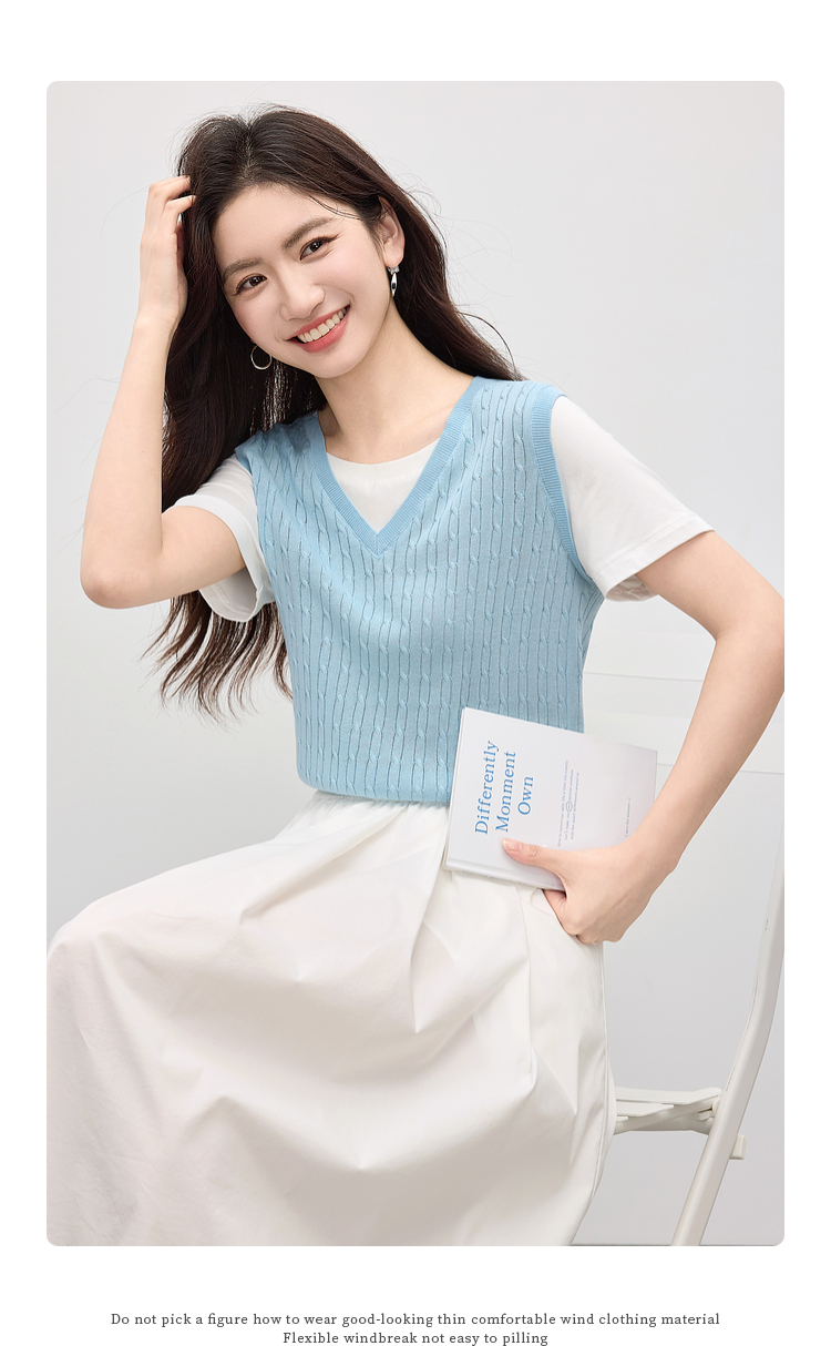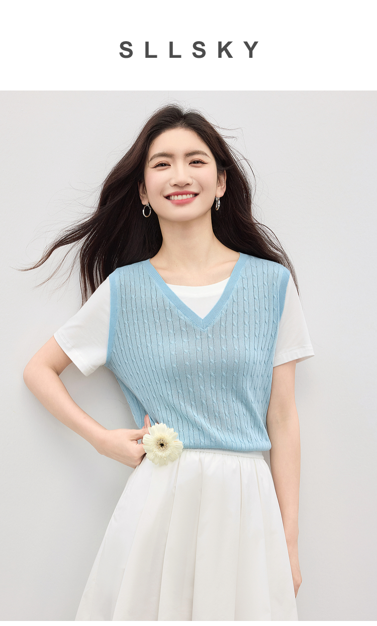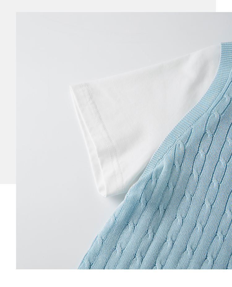 【周末秒杀】熙世界撞色短袖假两件针织衫女夏2025新款设计感正肩T恤拼接上衣