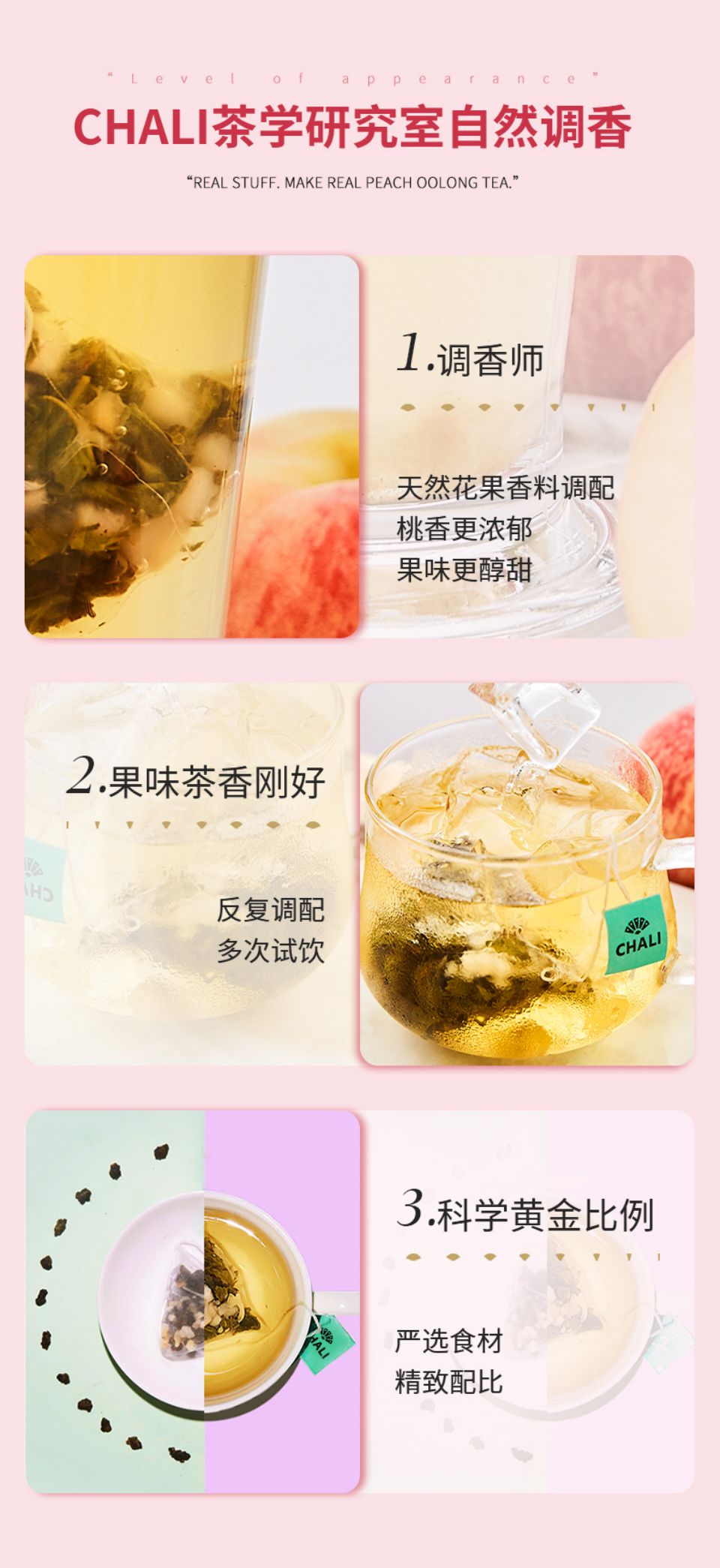 以“蜜桃乌龙”为例,茶香与果香相互交融,密不可分。为了丰富口感,CHALI特别添加了清爽的苹果干,经过百余次试饮调配最终成为首个出圈单品。“光这一款产品,每年就要用掉800吨乌龙茶。”杜珂琦介绍。