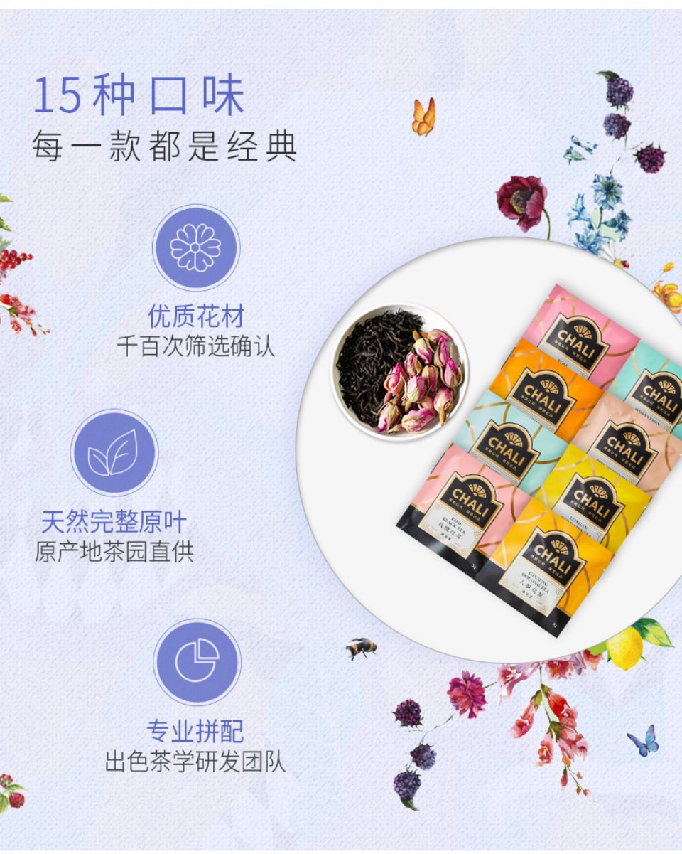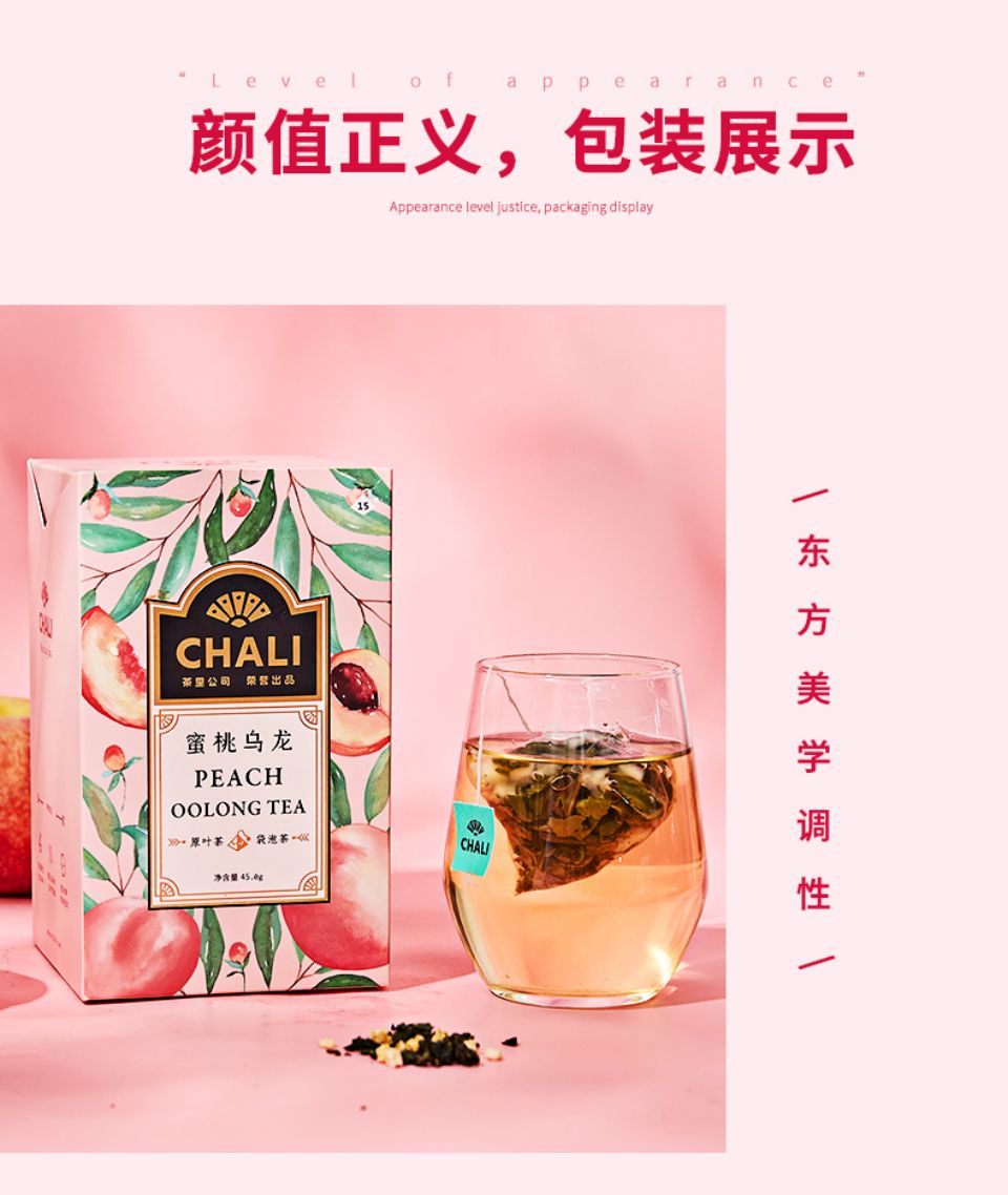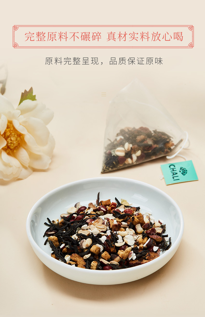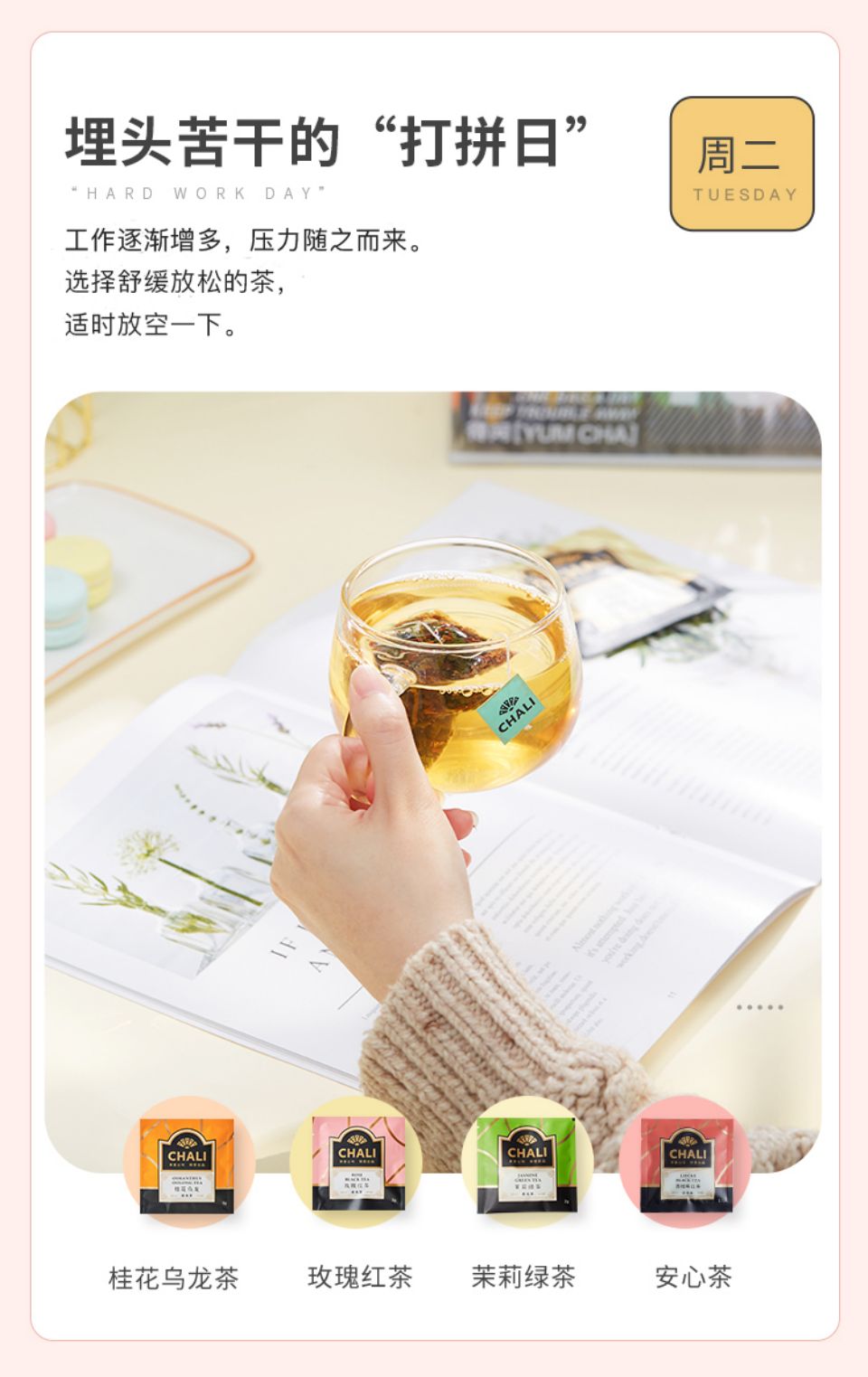 为了俘获新时代的青睐,CHALI推陈出新,以原叶茶搭配花卉、水果、草本植物,让小小茶包成为打工人的必备单品。