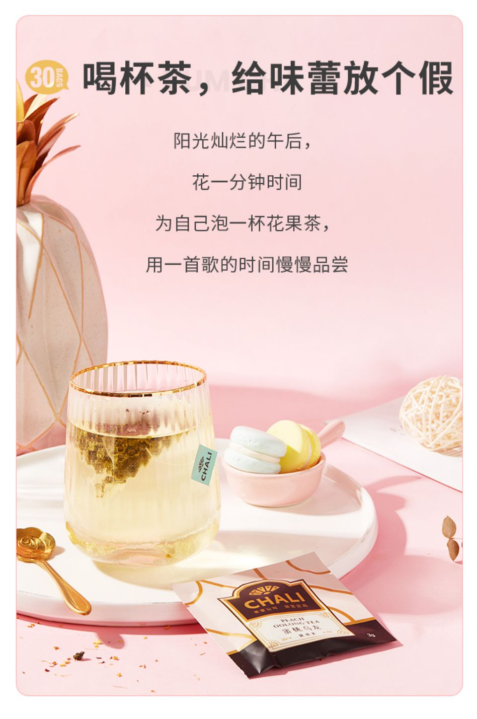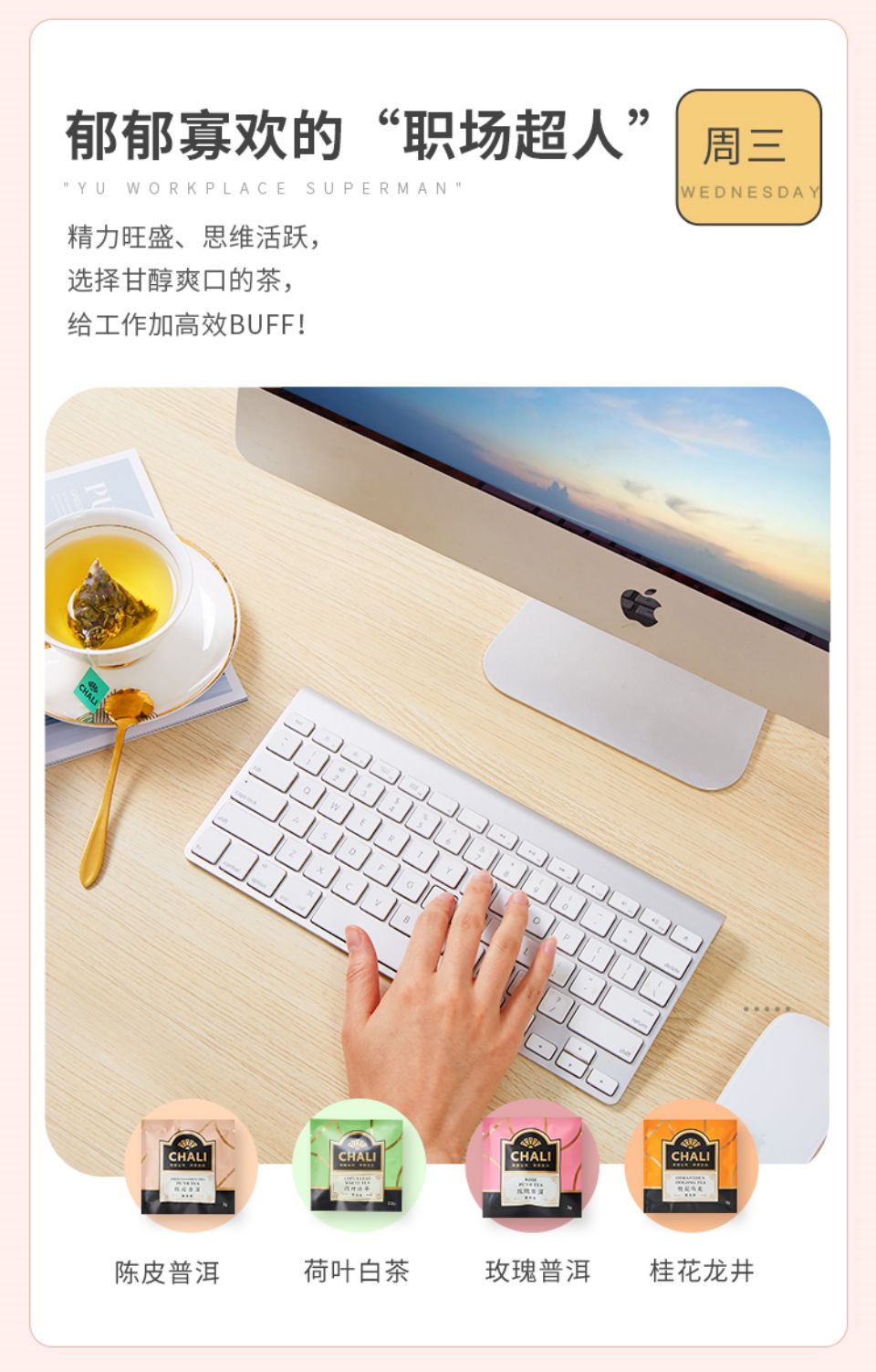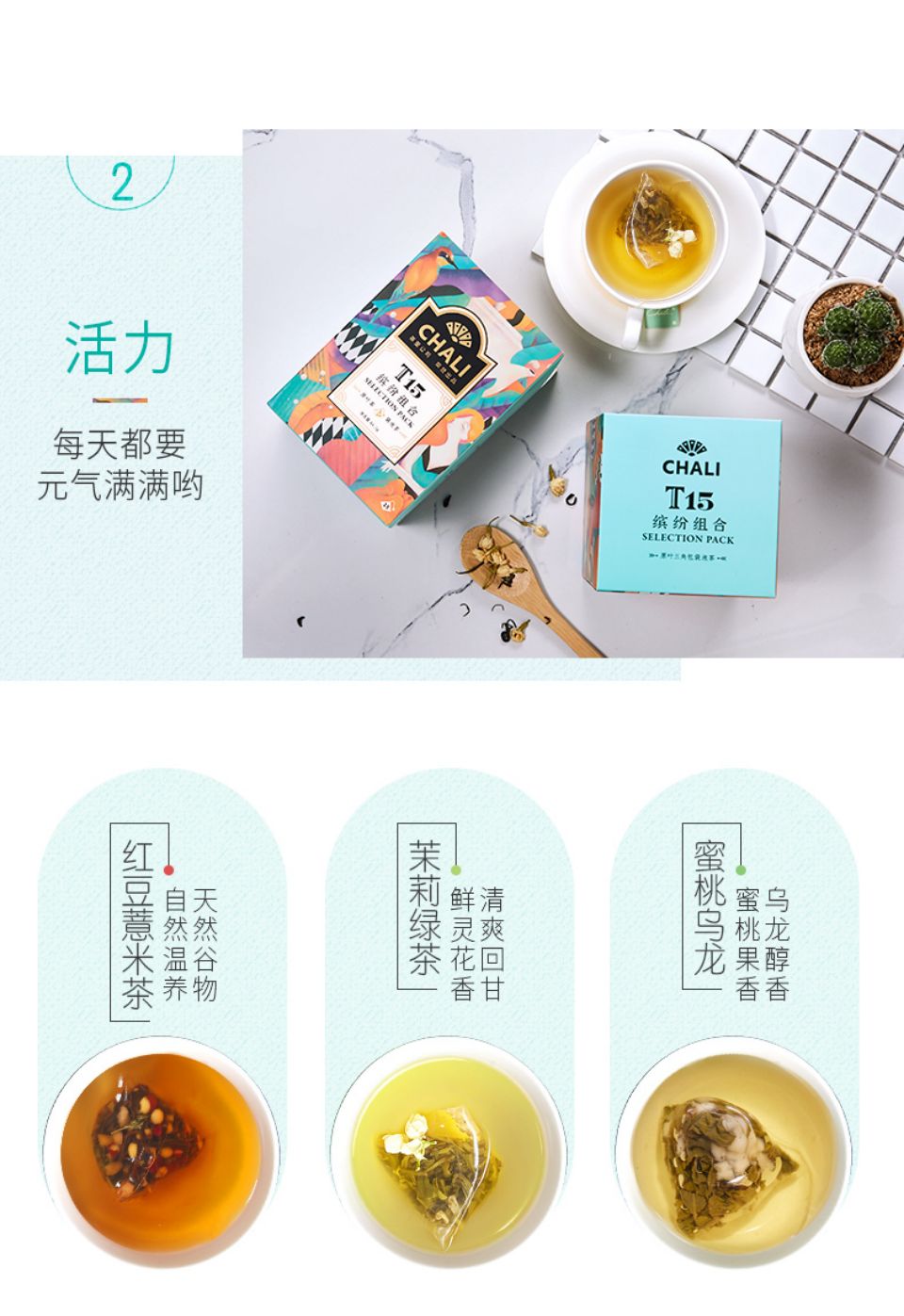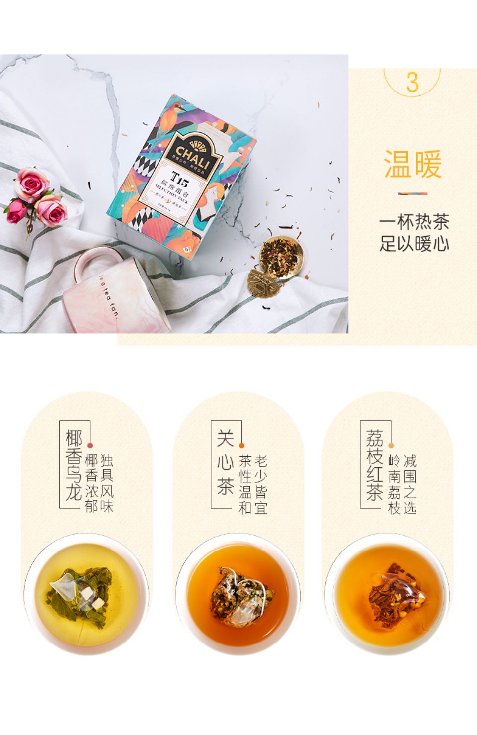 为了俘获新时代的青睐,CHALI推陈出新,以原叶茶搭配花卉、水果、草本植物,让小小茶包成为打工人的必备单品。