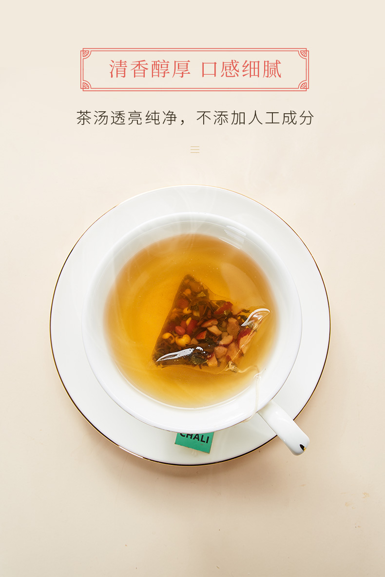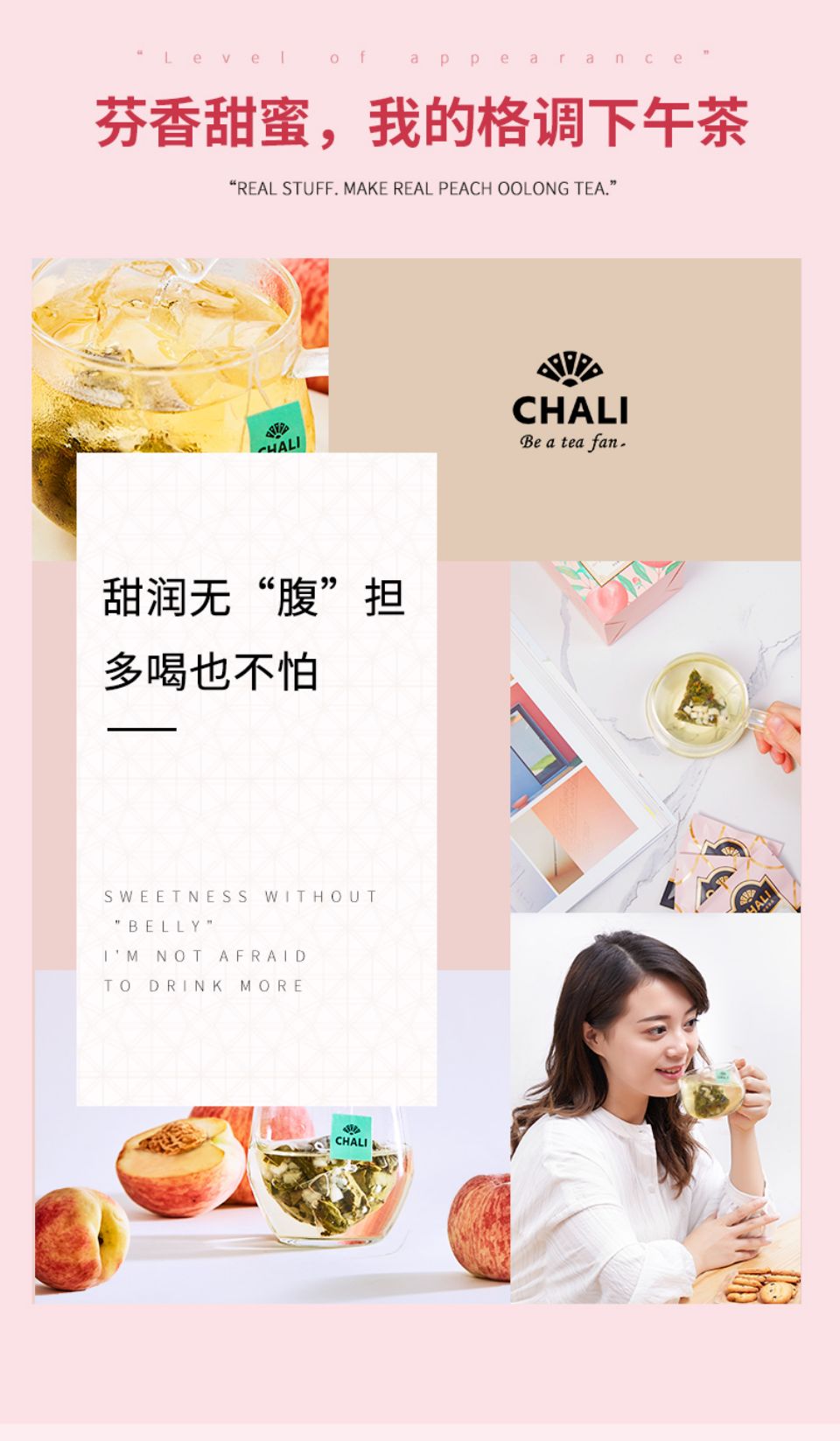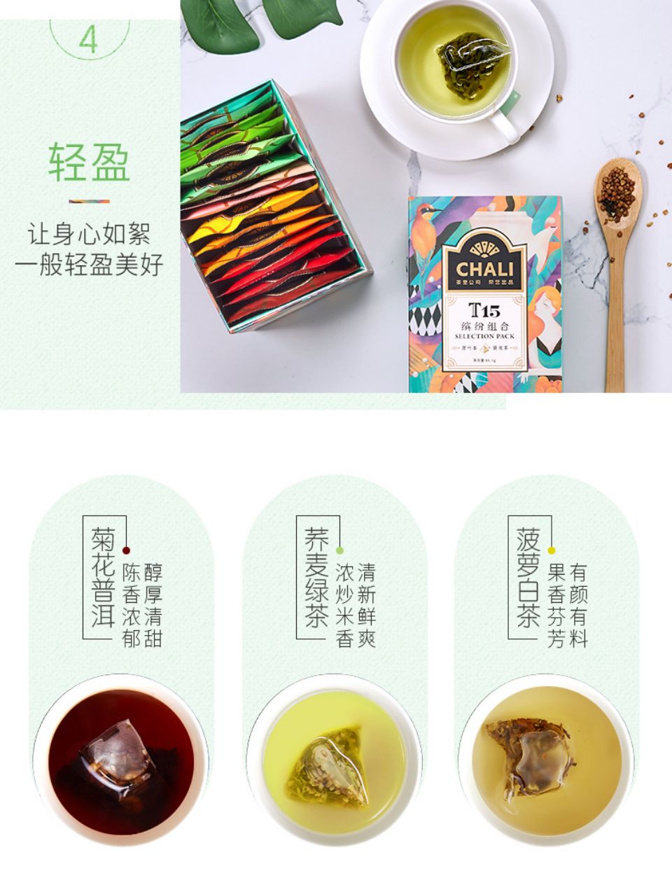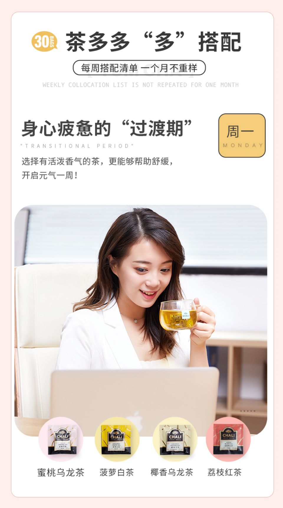 为了俘获新时代的青睐,CHALI推陈出新,以原叶茶搭配花卉、水果、草本植物,让小小茶包成为打工人的必备单品。
