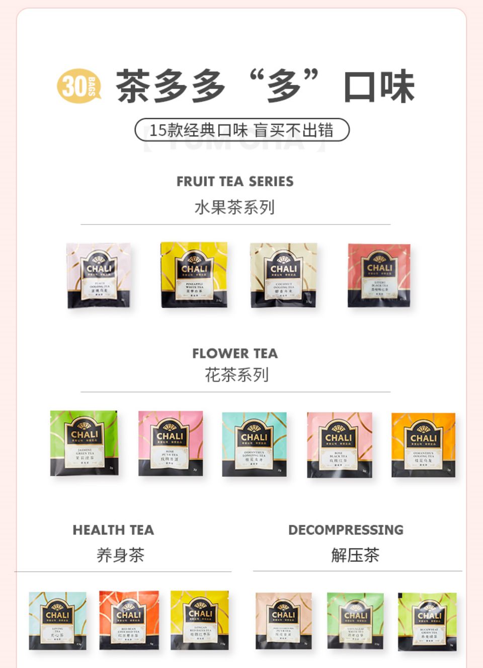 自2013年8月创立至今,CHALI目前已累计售出超过10亿个茶包。十年间,产品版图也逐渐扩大,品类包括花草茶系列、花果茶系列、冷泡茶系列、三角包系列等。这次,我们也将其中的代表产品上线至“每满生活”平台,让大家在“一撕一泡”之间感受到茶饮生活的魅力。
