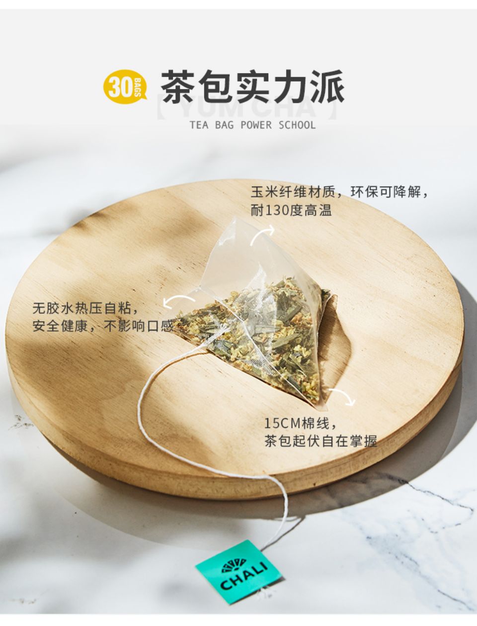CHALI为了给消费者提供一款安全健康的茶饮,CHALI选择了玉米纤维材质,冲泡后耐高温不会放射有害物质,而且易降解并不会污染环境。