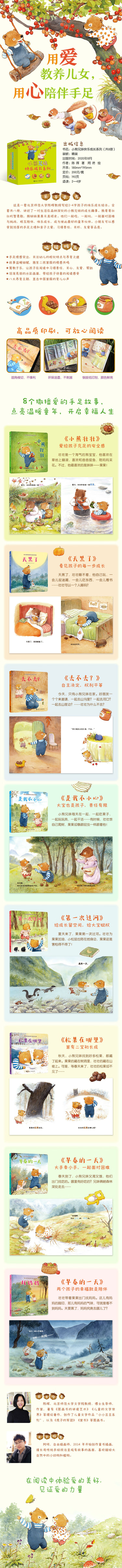 这是一套北京师范大学陈晖教授写给2-4岁孩子的快乐成长绘本。全套共八册,分别为《小熊壮壮》《天黑了》《是我不小心》《松果在哪里》《第一次过河》《去不去?》《早春的一天》《找妈妈》,讲述了一对生活在森林深处的小熊兄妹的成长趣事。熊哥哥壮壮机智勇敢,熊妹妹果果天真顽皮。他们一起吃,一起玩,一起面对困难与挑战,相互陪伴,快乐成长,成为彼此最好的童年伙伴。小朋友可以感受到浓厚的手足之情和亲子之爱,习得责任、关怀、友爱。