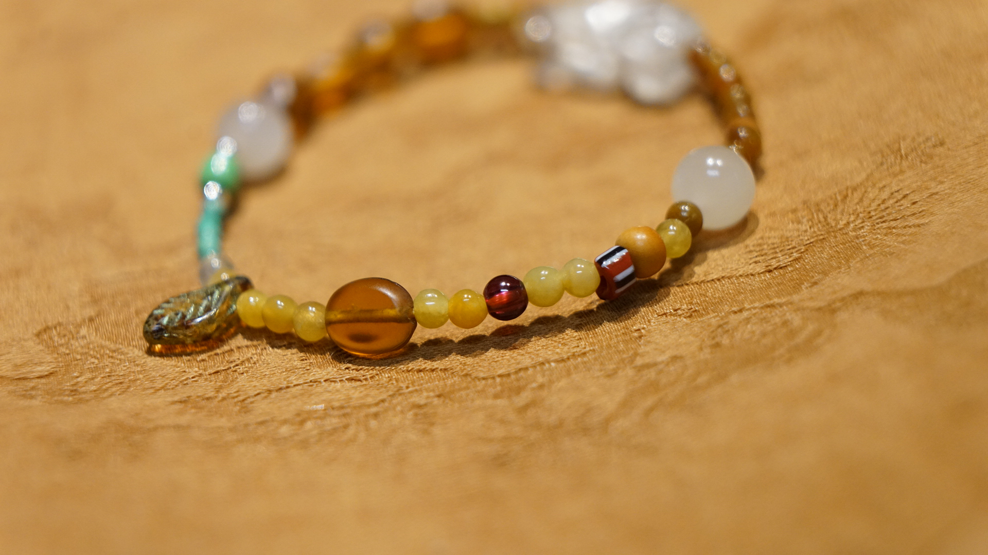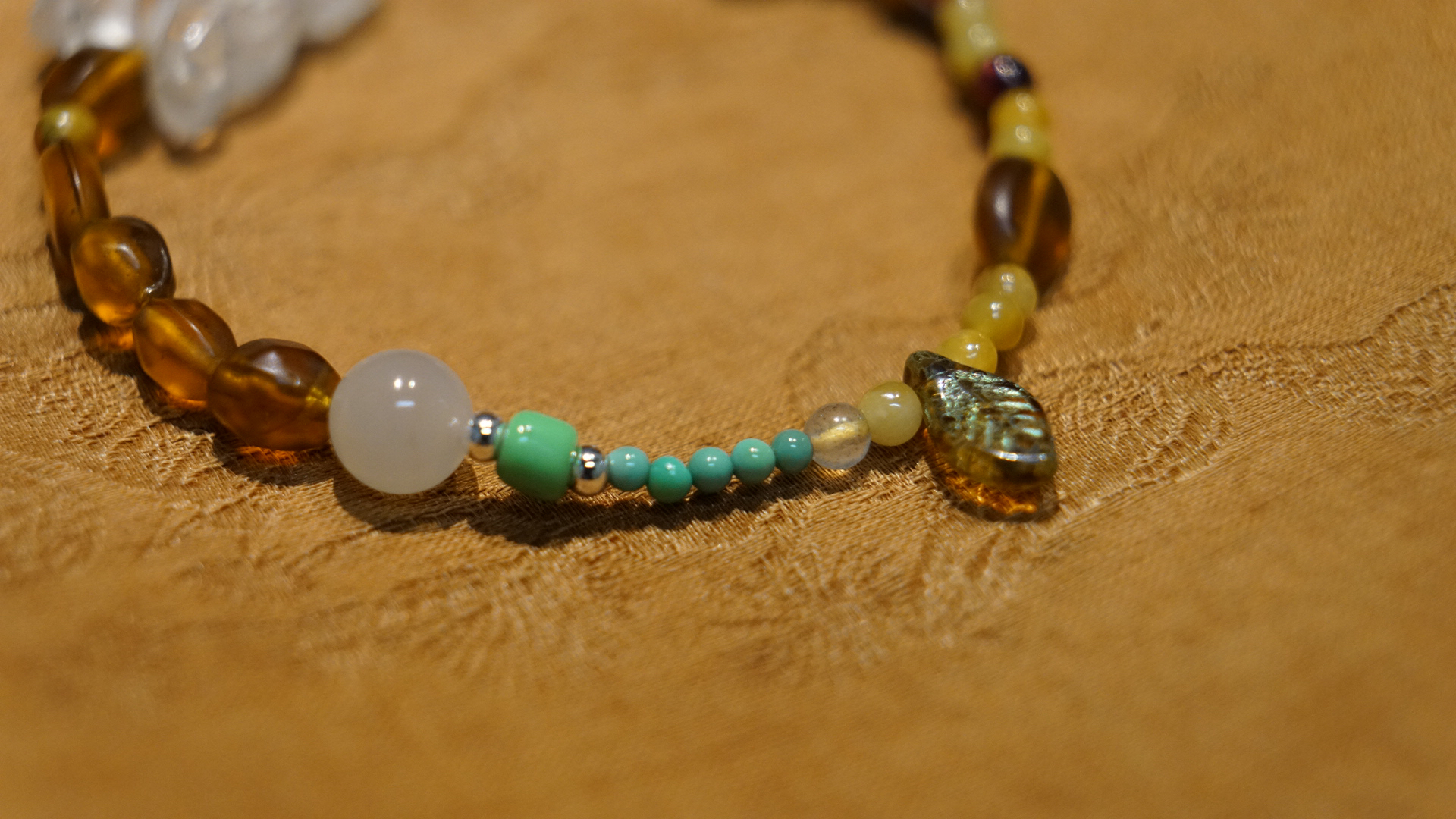 复古棕橘色老琉璃和棕橘色带种水的翡翠珠珠,还有鹅黄色的黄翡翠,在一起被原矿绿松石点亮,还有藕粉和田玉的柔和的平衡支撑着整体的秩序。相得益彰。