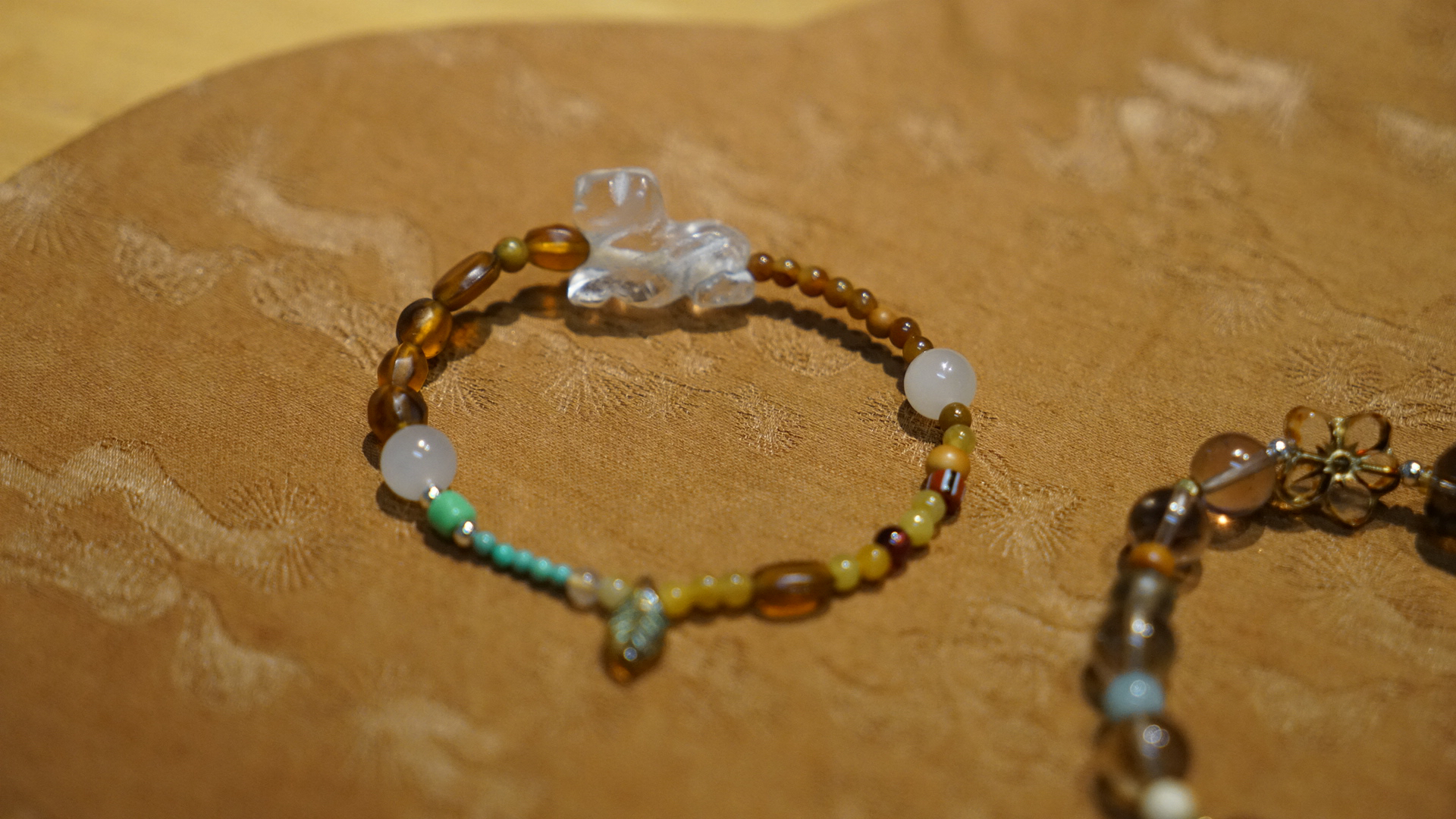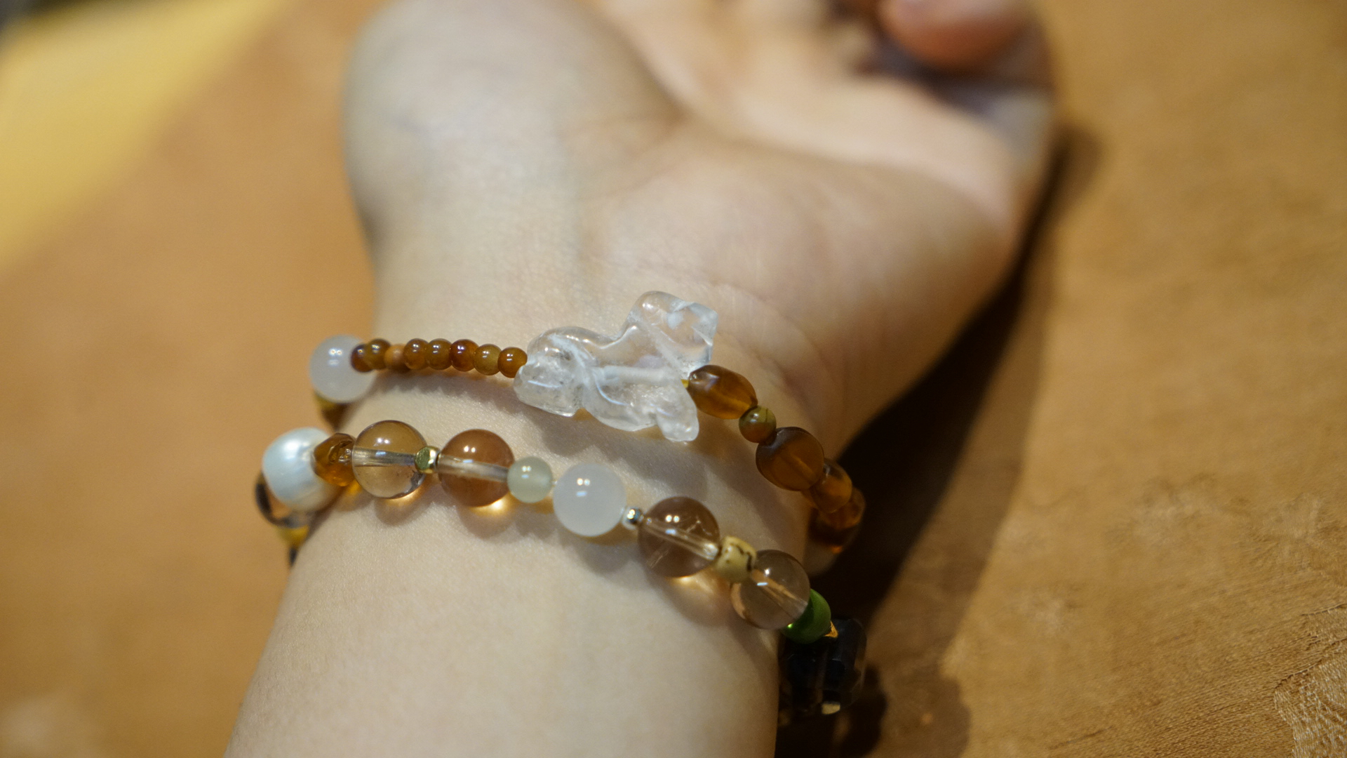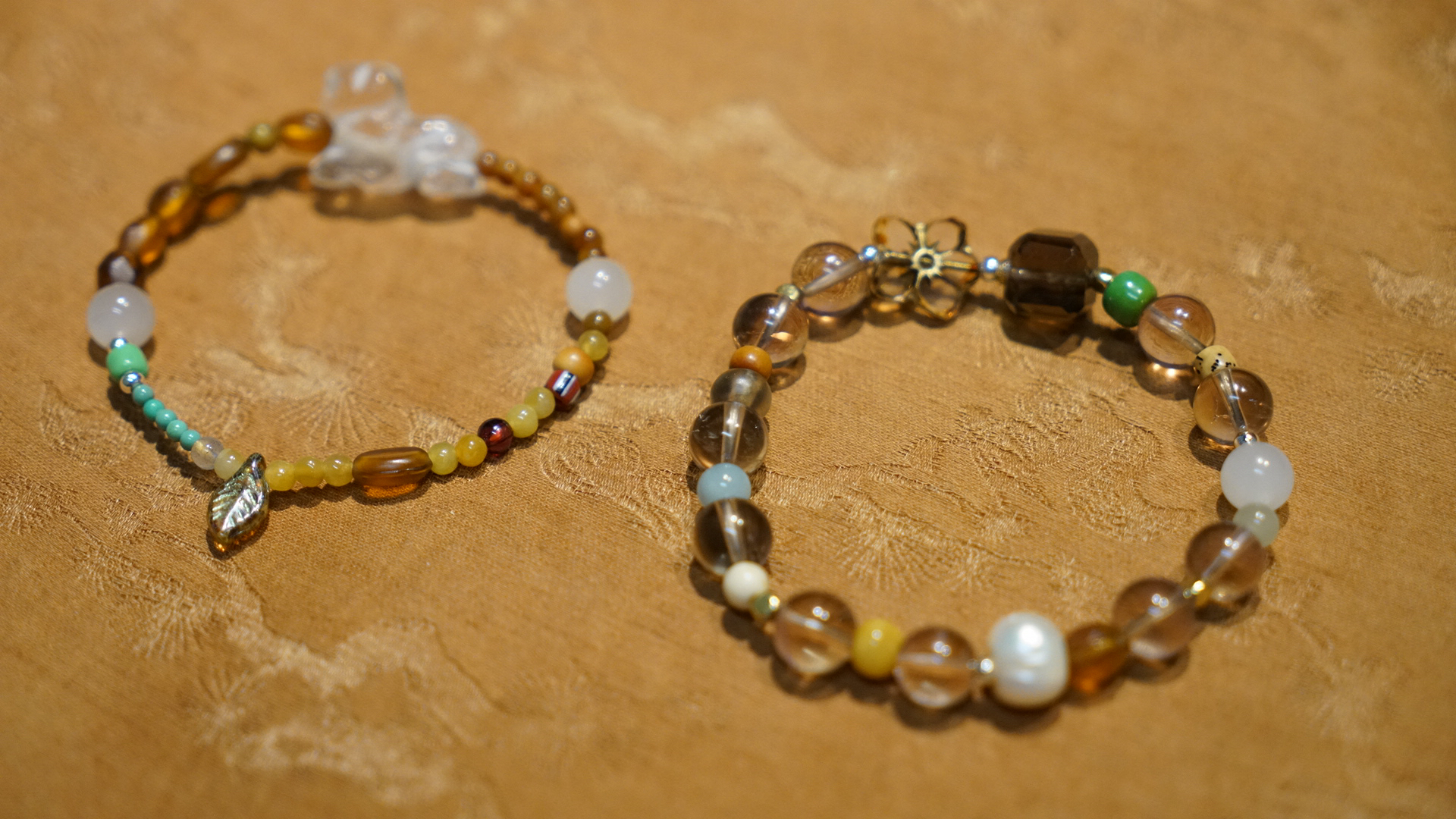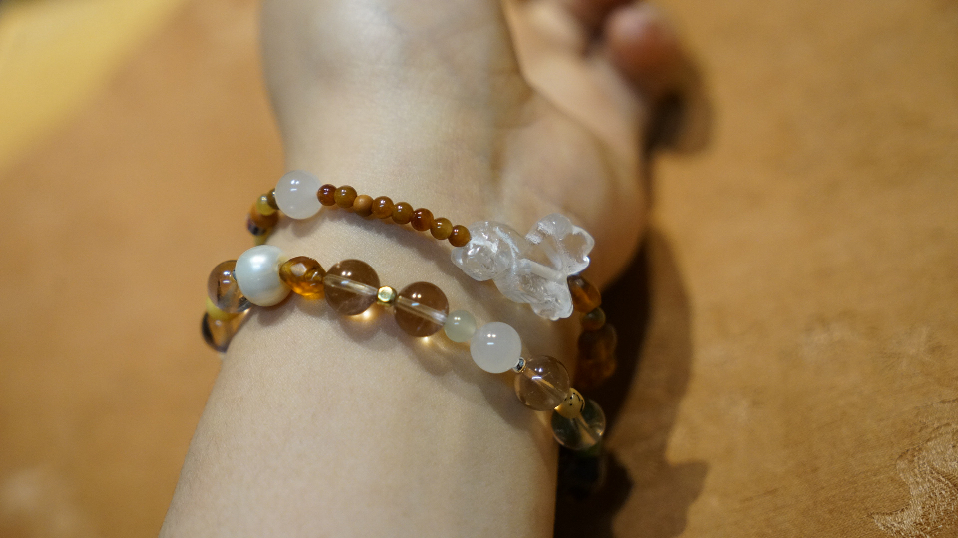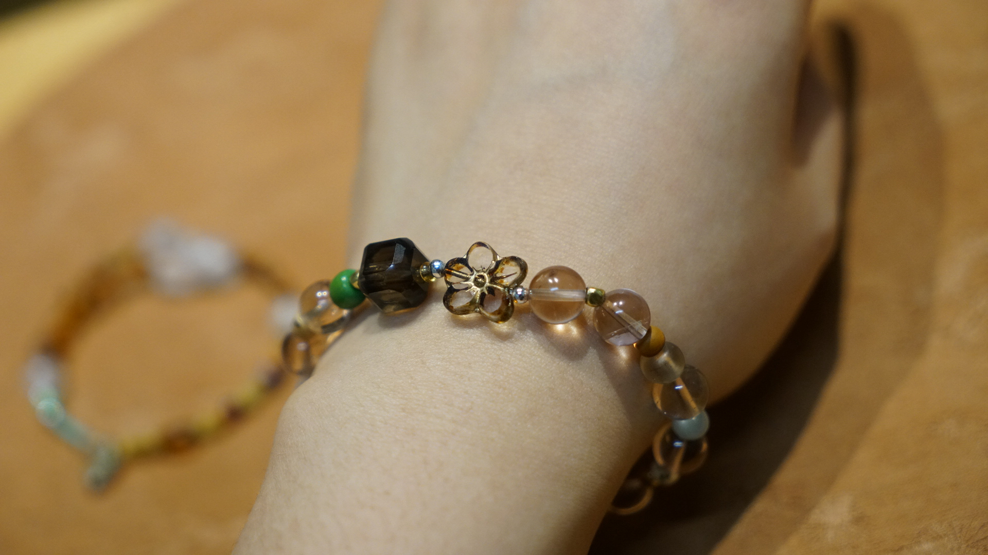 这两条是一起叠戴的设计,8mm直径黄水晶的透亮感带动了整体的流动感觉,茶晶的四方形态与捷克琉璃花朵加入整体的设计,又有一种南法碎花的风情。