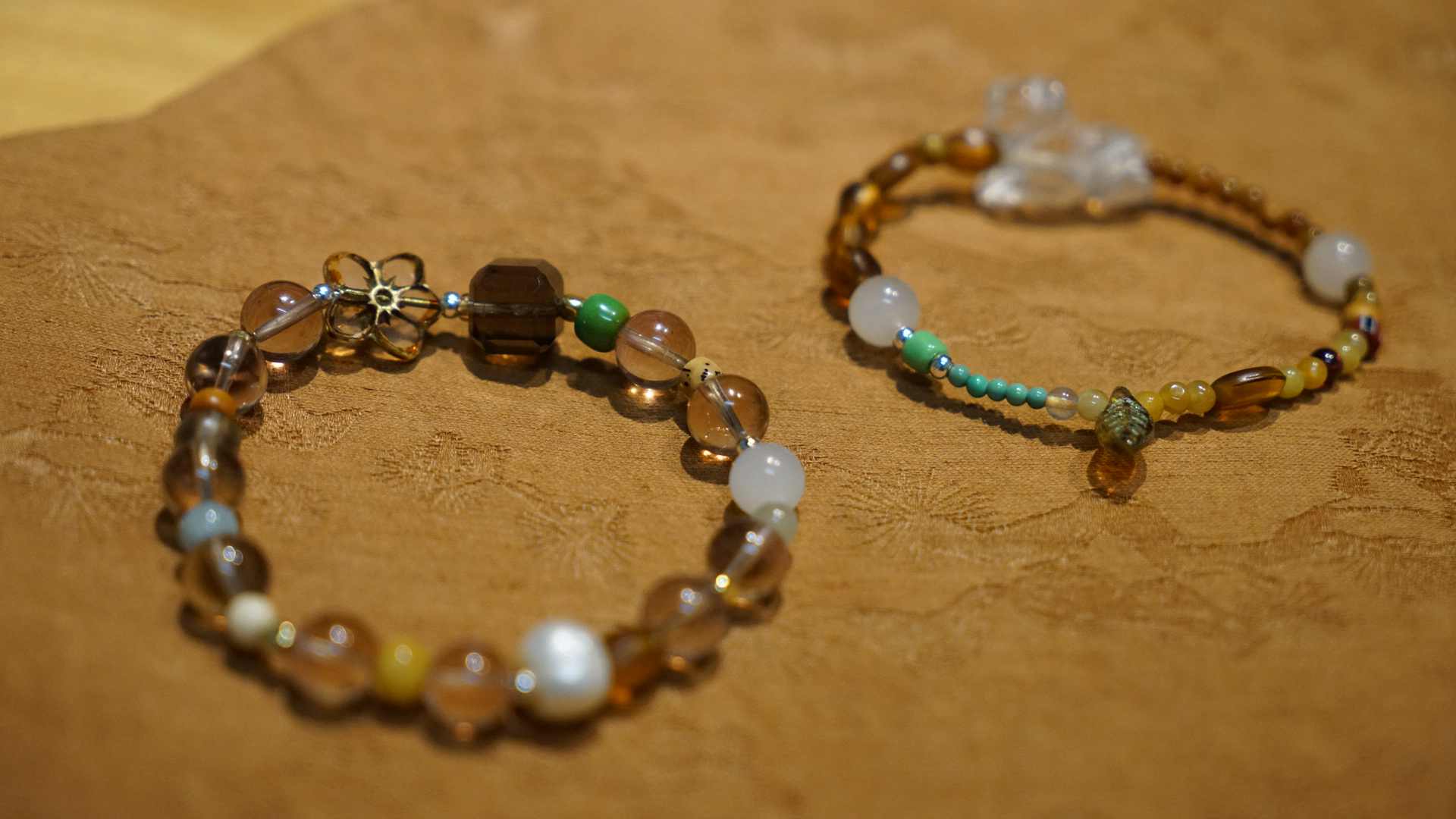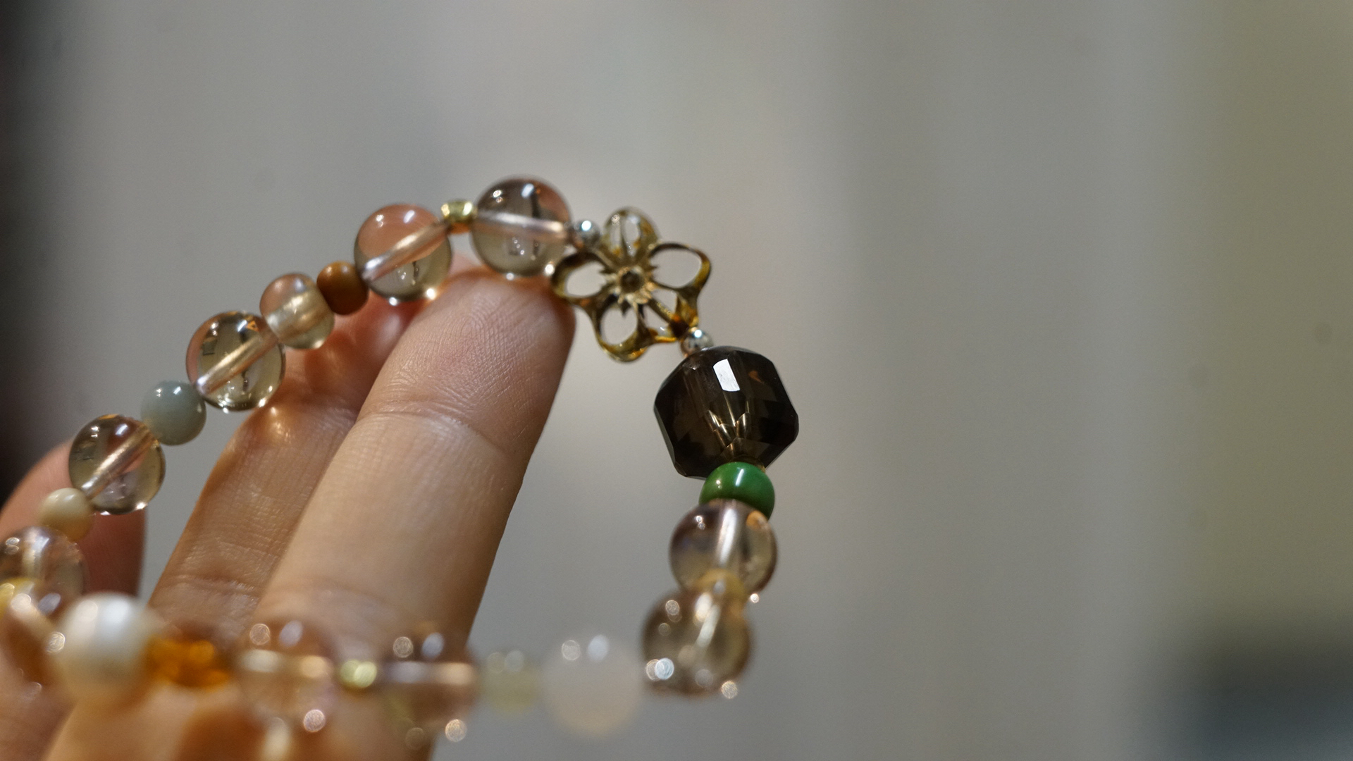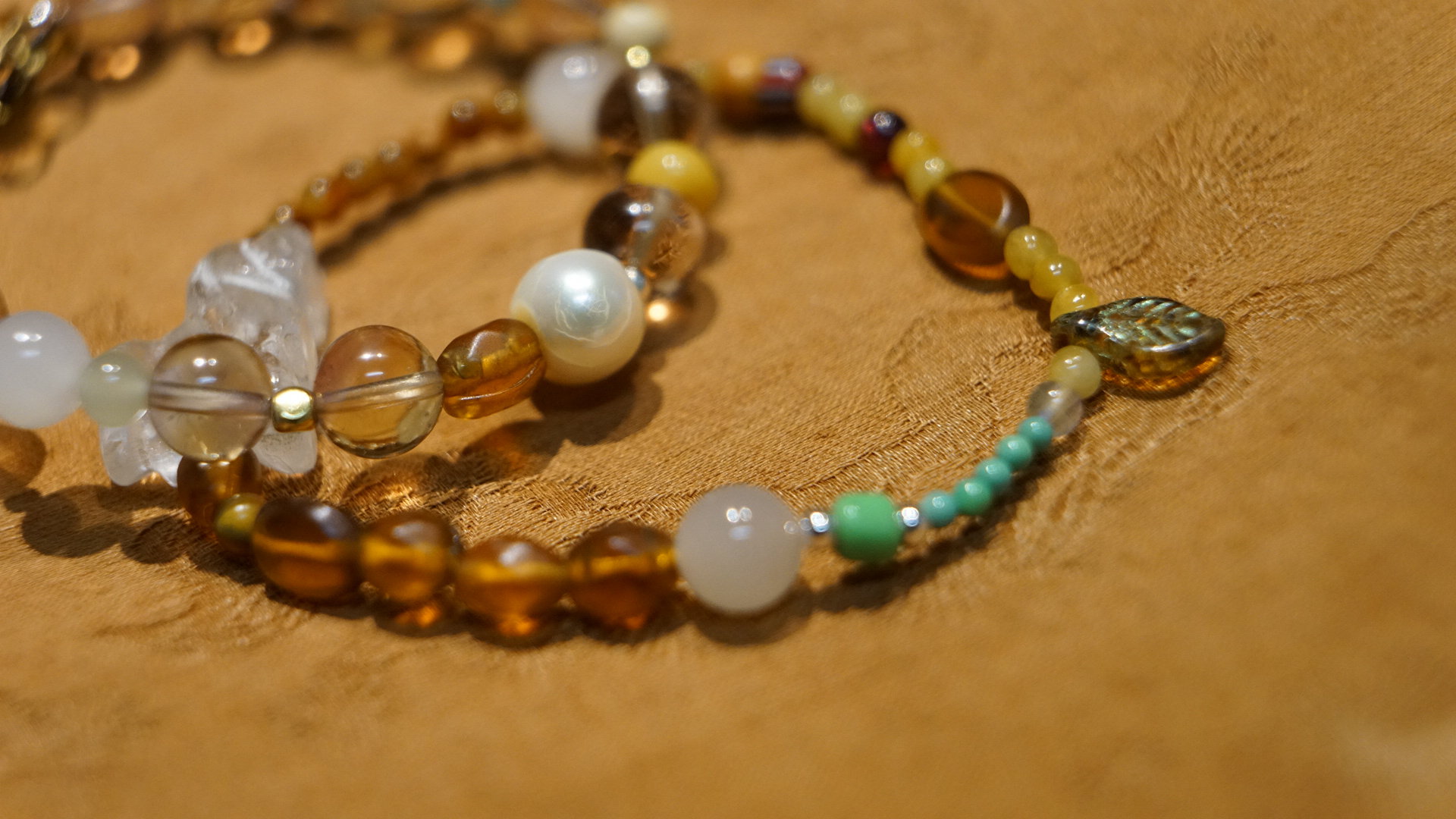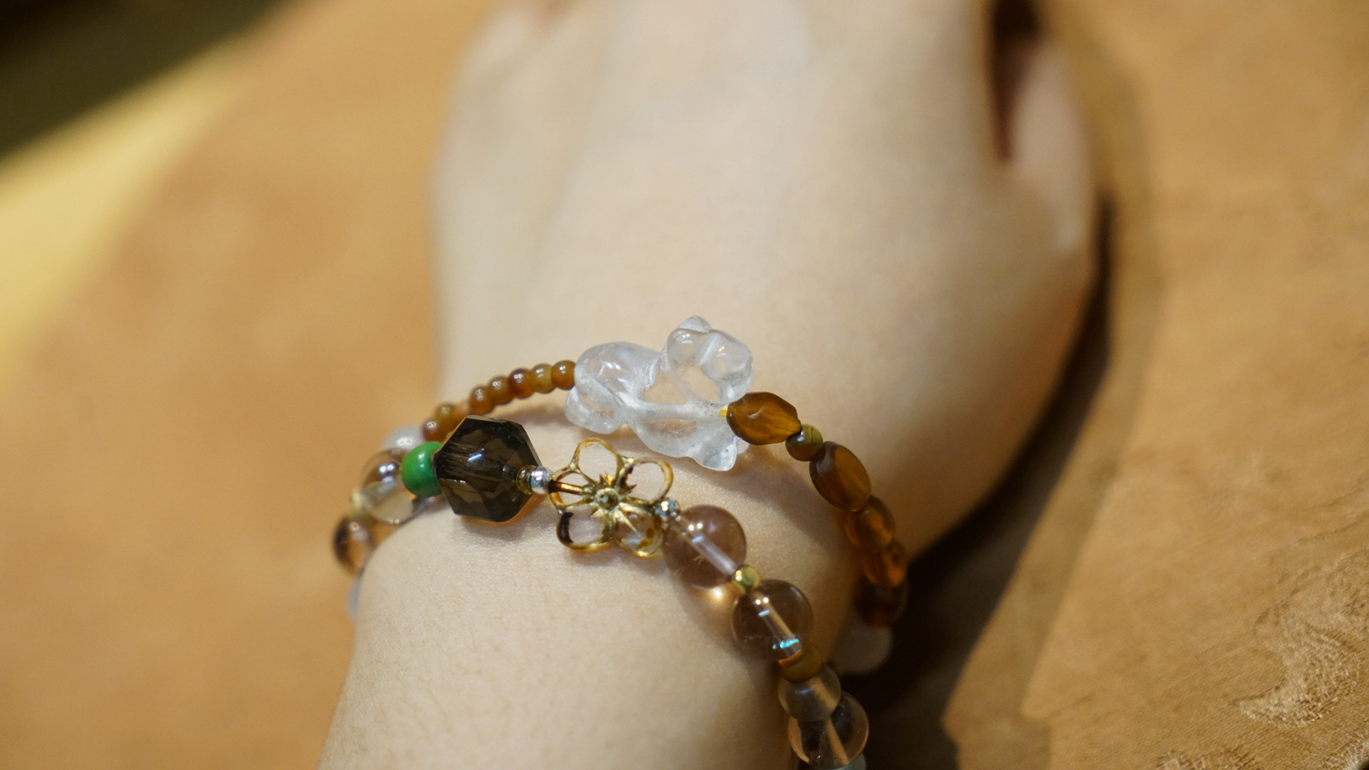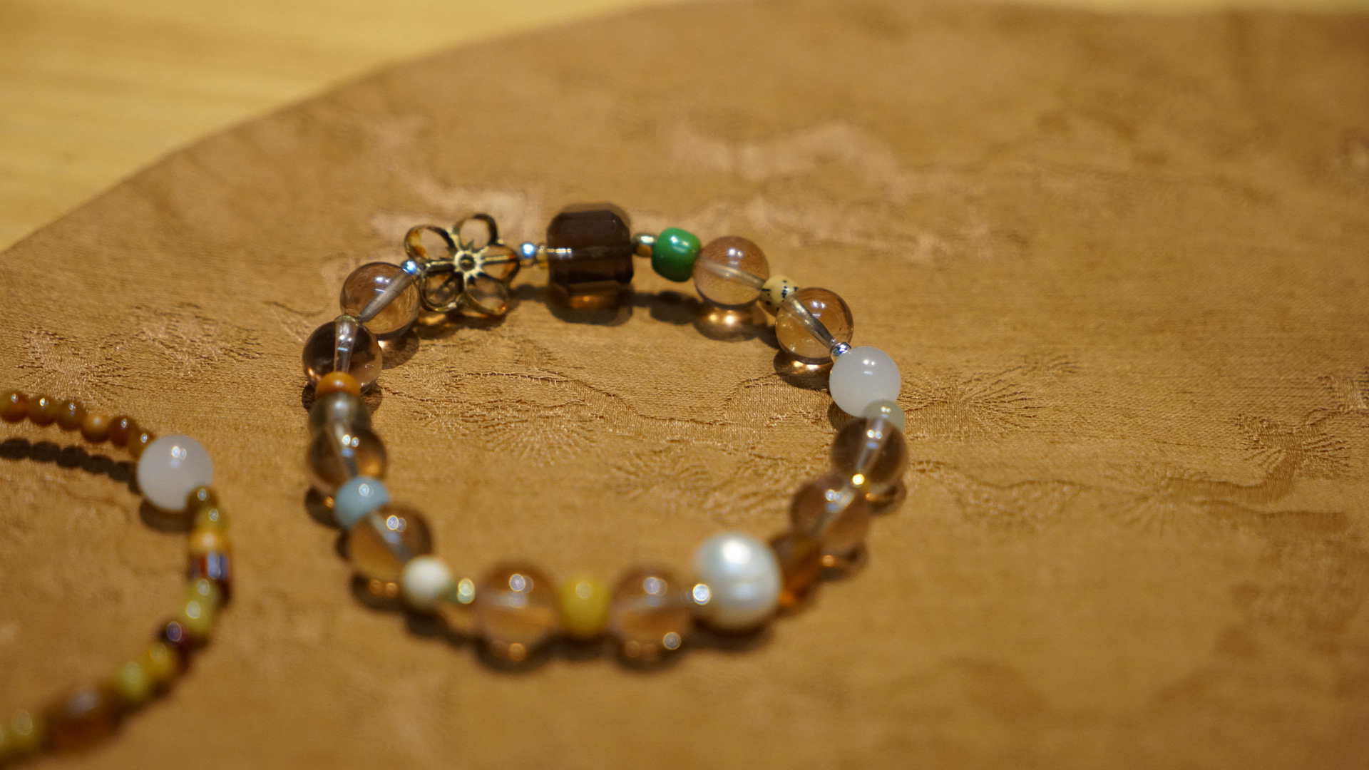 这两条是一起叠戴的设计,8mm直径黄水晶的透亮感带动了整体的流动感觉,茶晶的四方形态与捷克琉璃花朵加入整体的设计,又有一种南法碎花的风情。