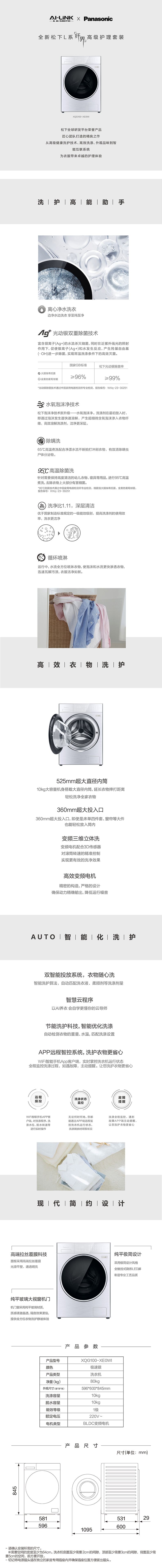 【XQG100-XE0WI】AI-LiNK智慧互联生态 松下洗衣机