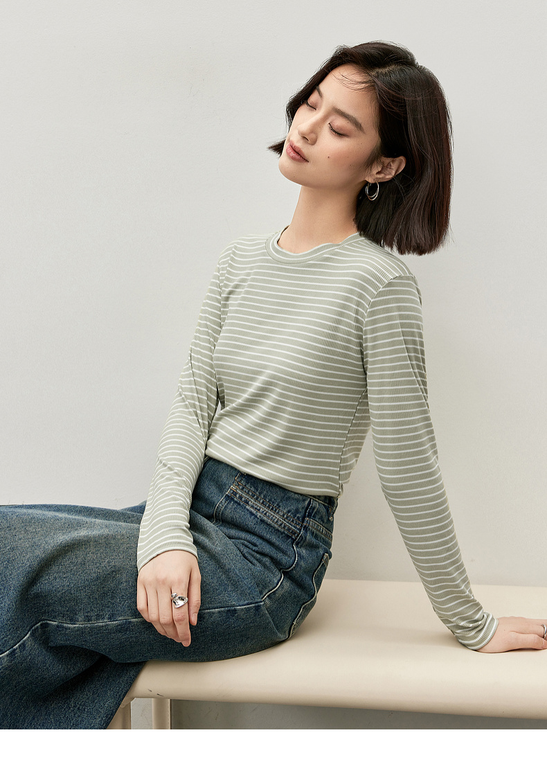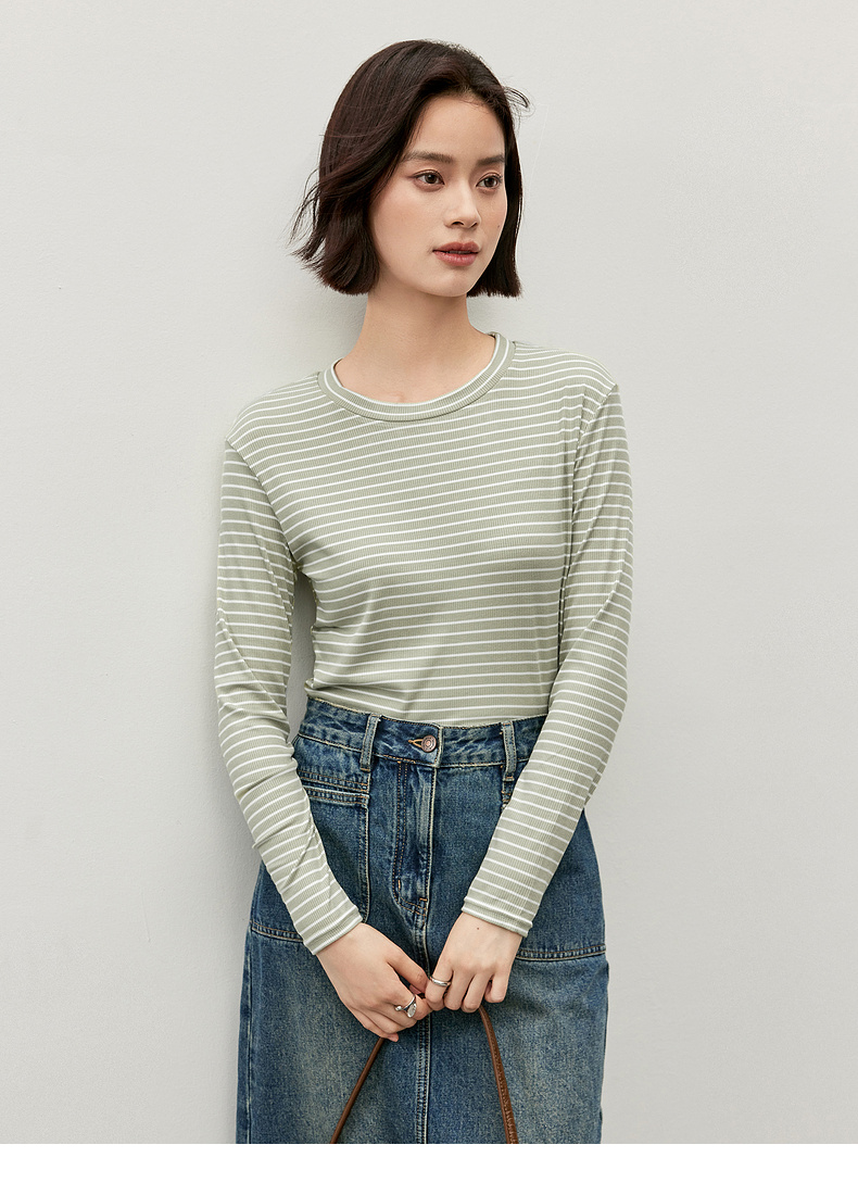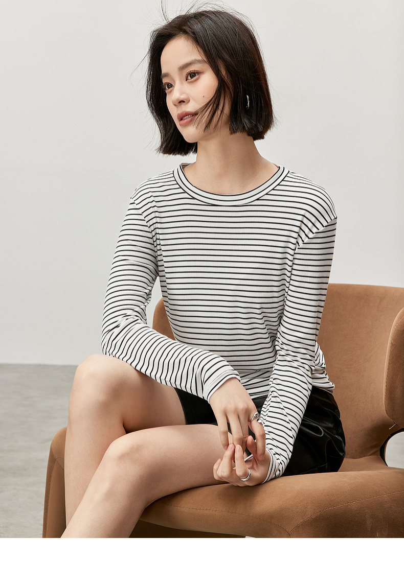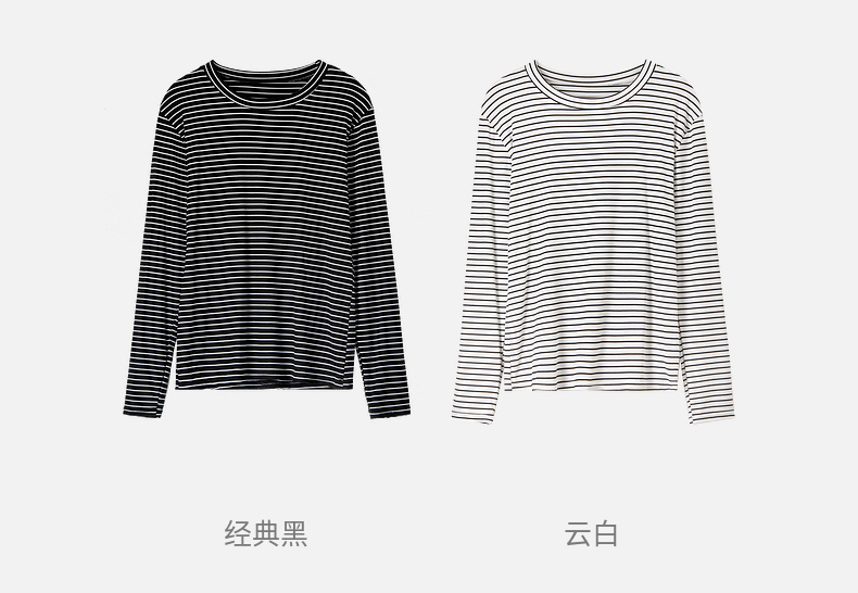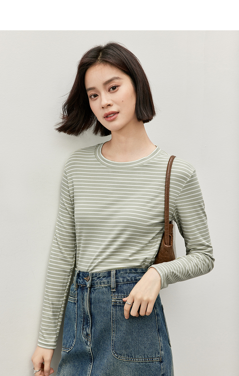【内购】尚都比拉冬新款打底衫条纹显瘦藏肉舒适简约圆领T恤长袖上衣-W51T80212X