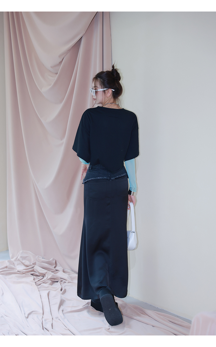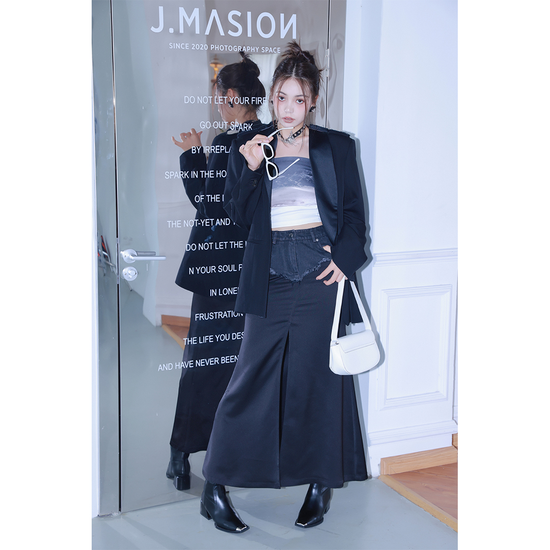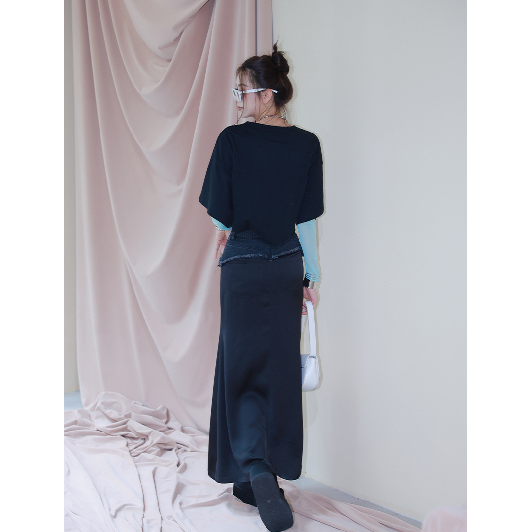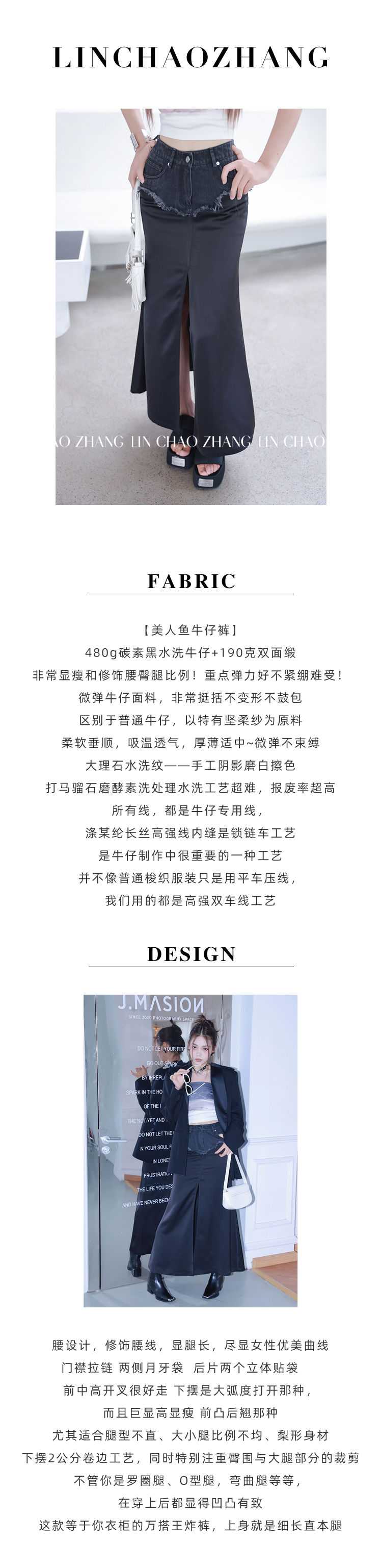 100元以内不退不换清仓捡漏 LIN CHAO ZHANG 【美人鱼牛仔裤】牛仔拼接缎面半裙