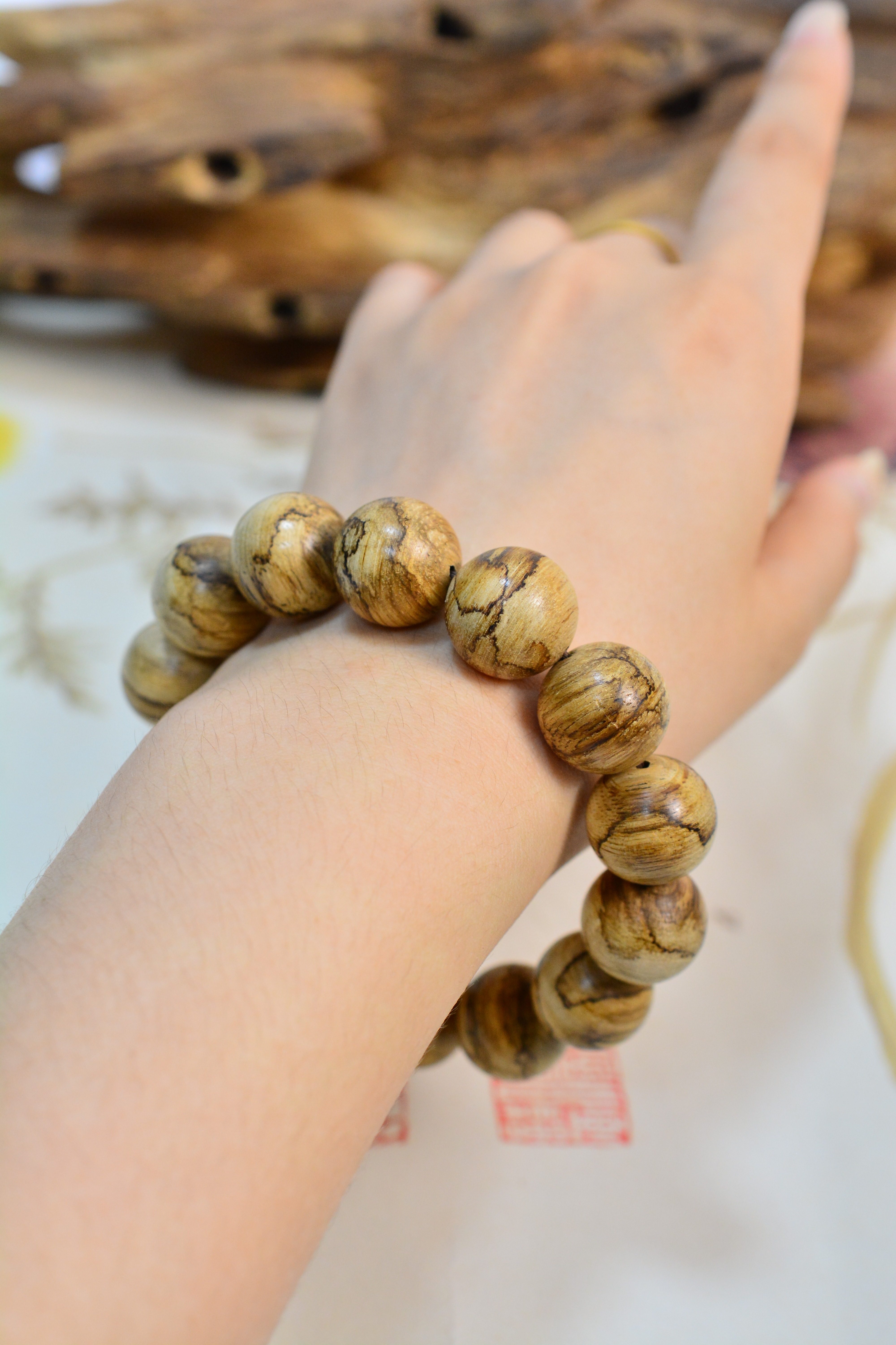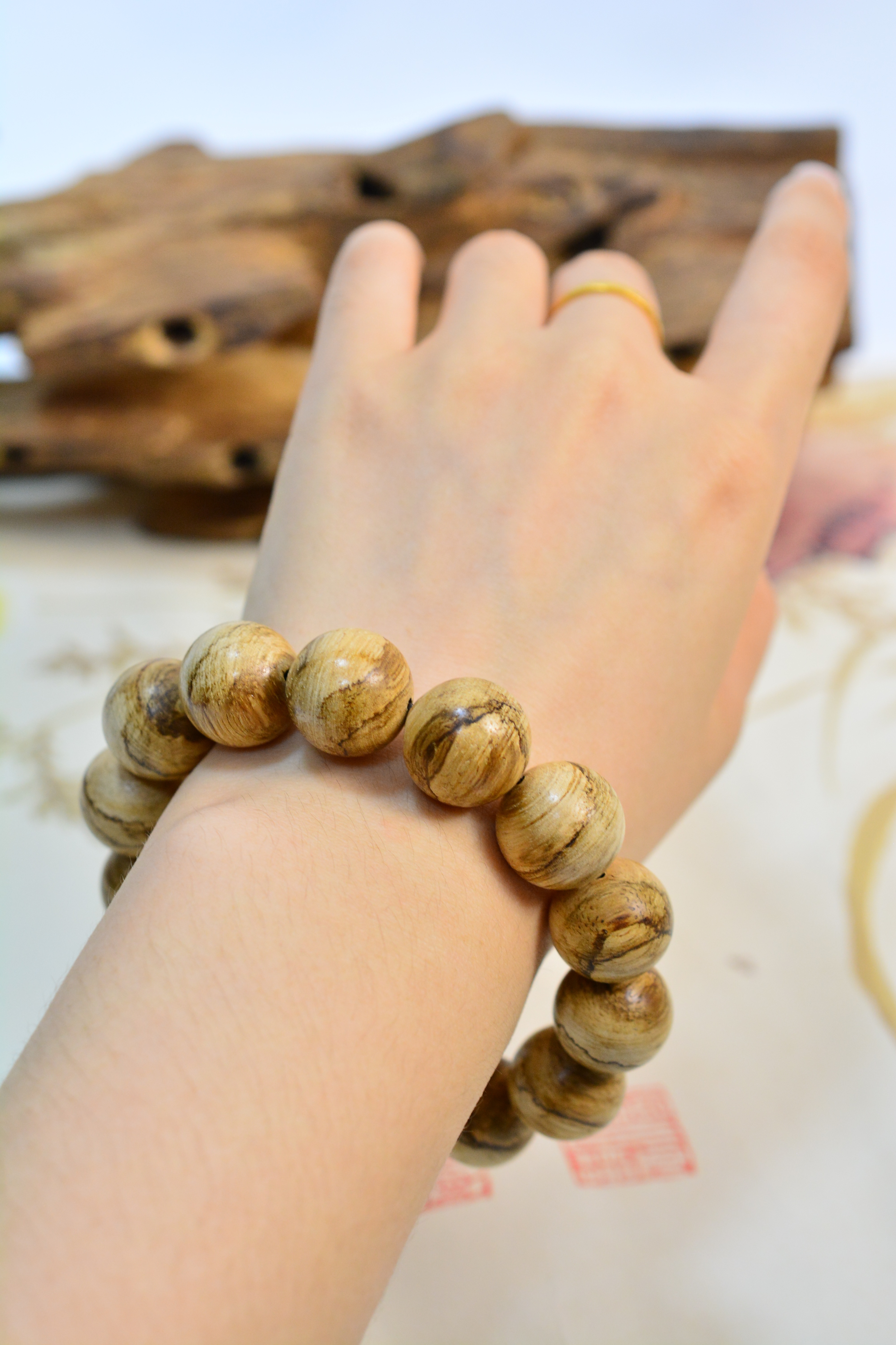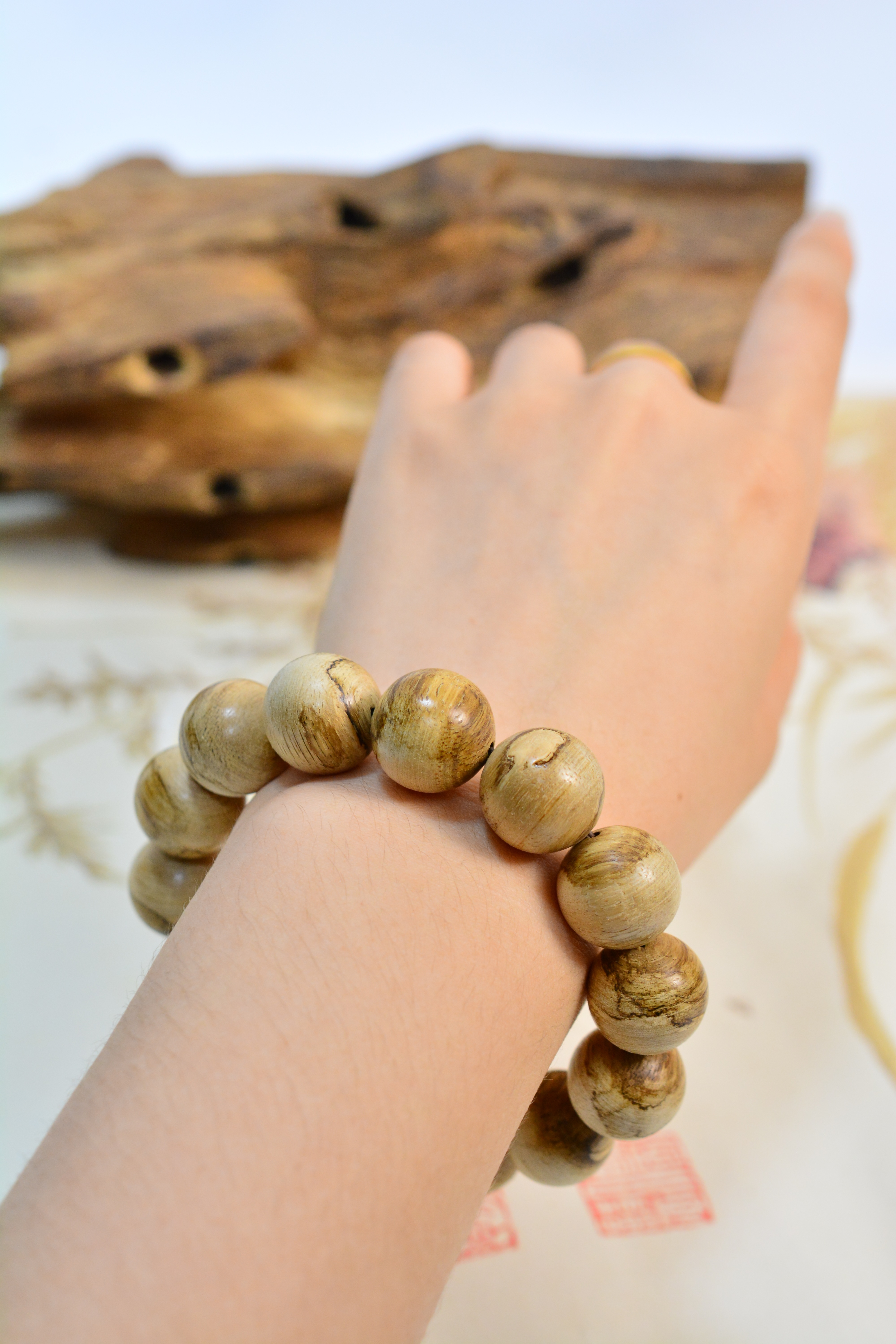 【描述】大珠径大气饱满,野料肌理苍劲,香韵清劲沉稳,凉透带药甜,自带山林旷野之气。单圈素串,不事雕琢,腕间沉稳压手,贵气藏于质朴,静气自生。