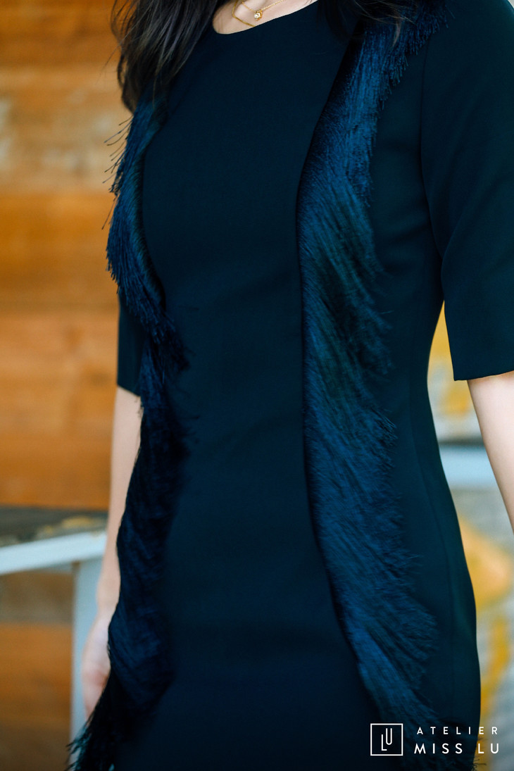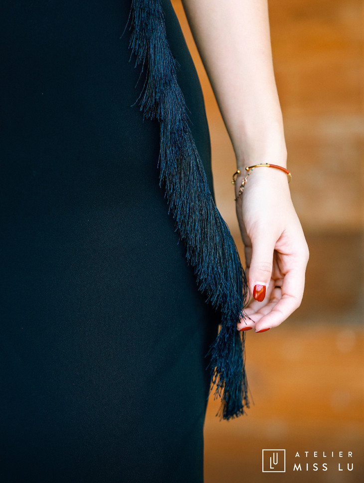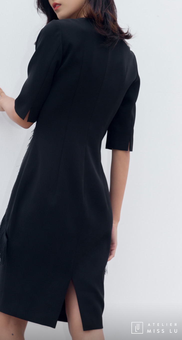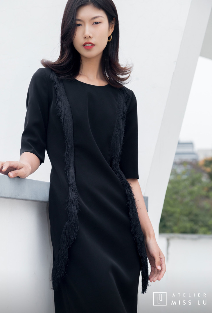 AtelierMissLu / Annet-光泽黑两侧流苏装饰连身裙
