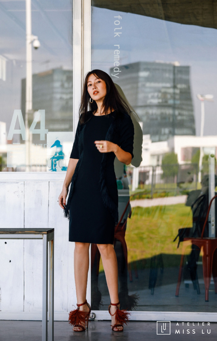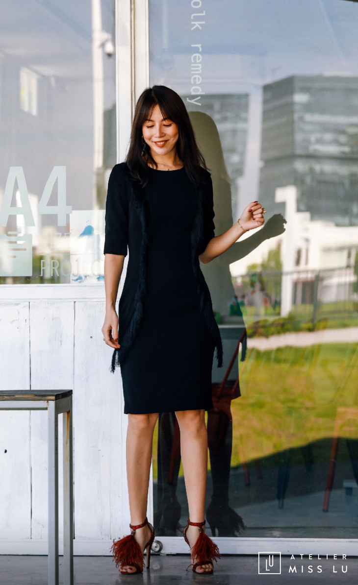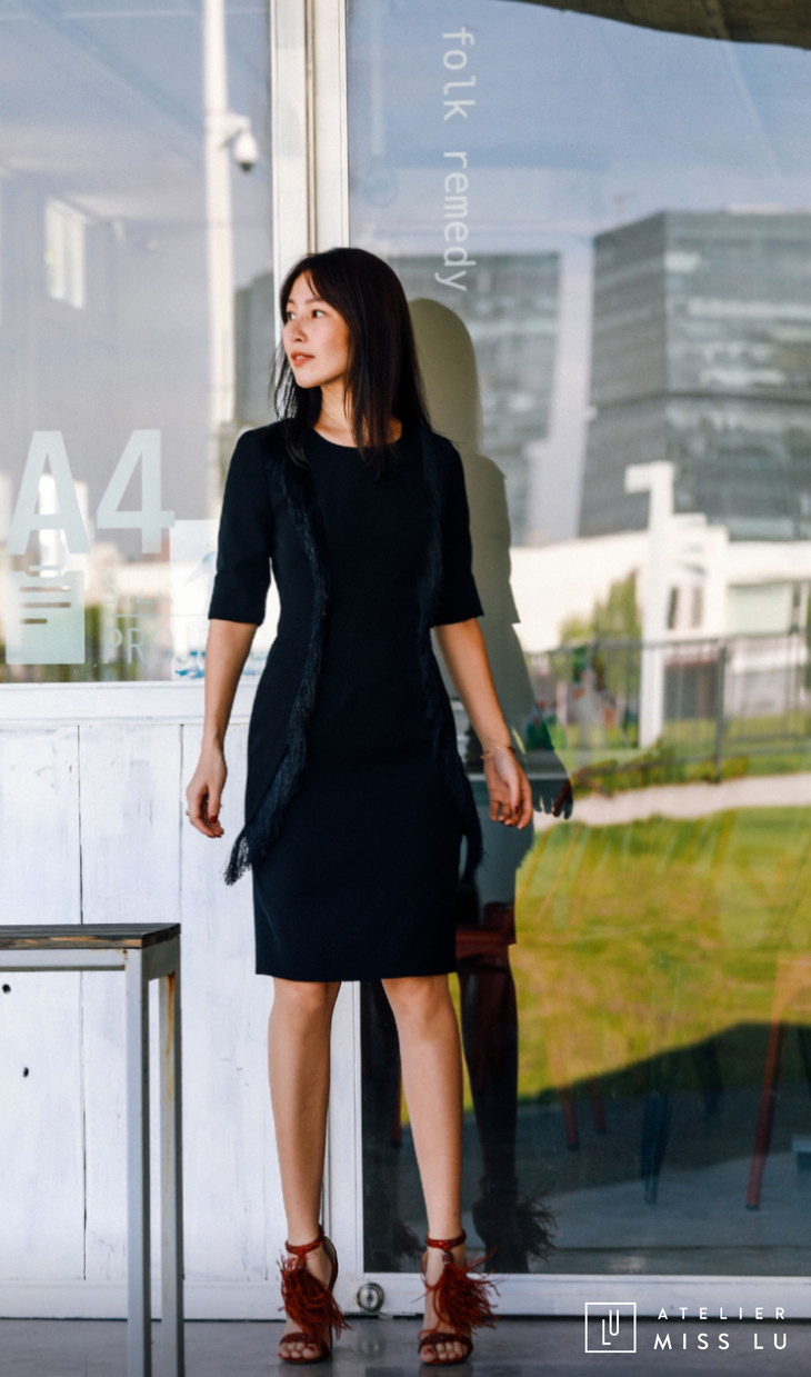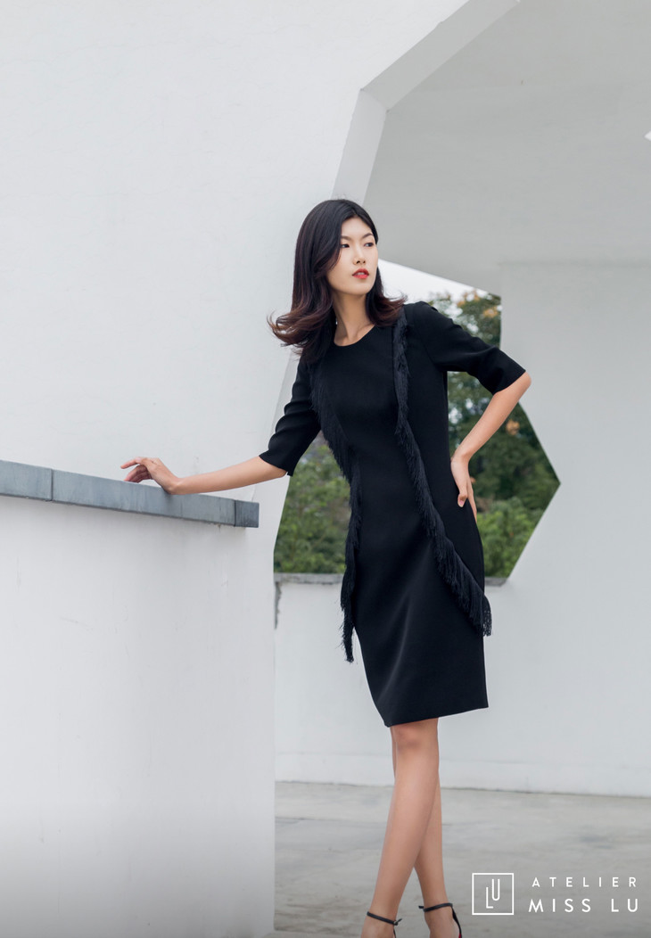 AtelierMissLu / Annet-光泽黑两侧流苏装饰连身裙