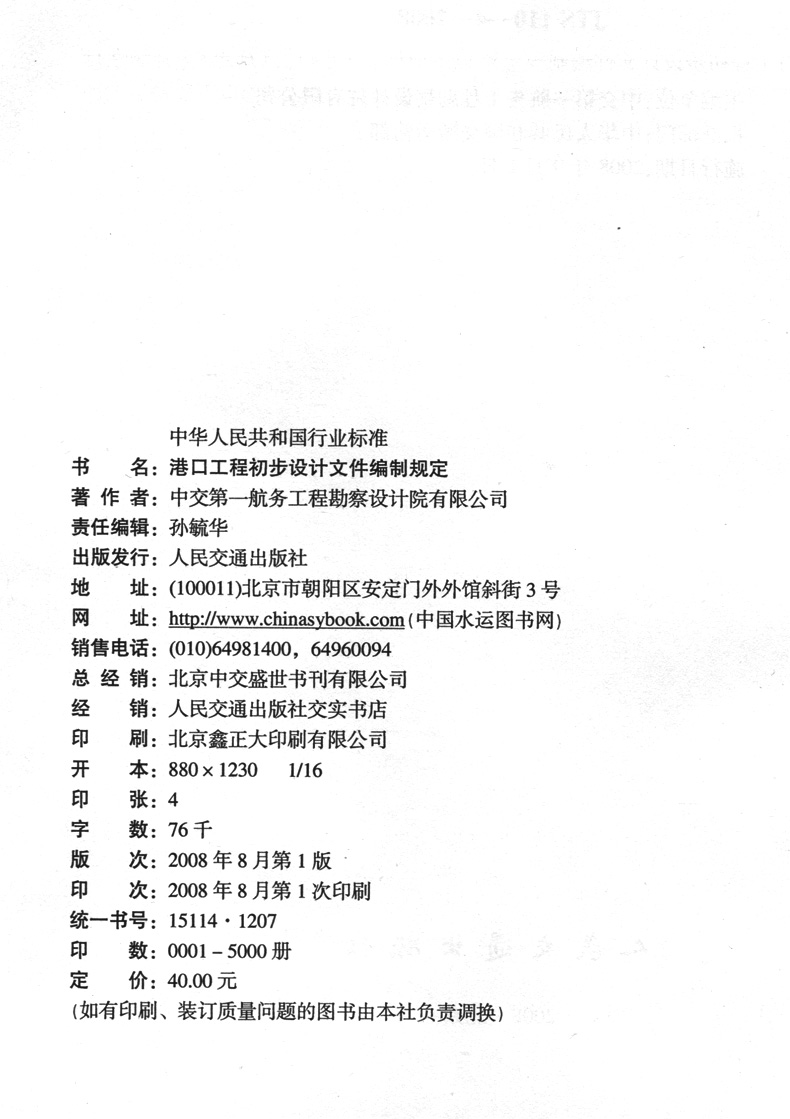 书名:港口工程初步设计文件编制规定 JTS110-4-2008