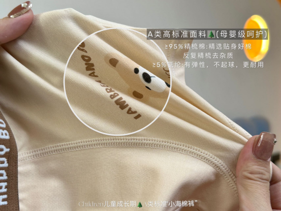 给宝宝选内裤,面料要好好「考察」!95%棉+5%氨纶科学配比, ✅堪称内裤届面料天花板,摸上去最直观的感受就是软 第二感觉是细腻,非常亲肤! 超快吸湿排汗,对于24小时都要穿的小内裤而言,真的很重要‼