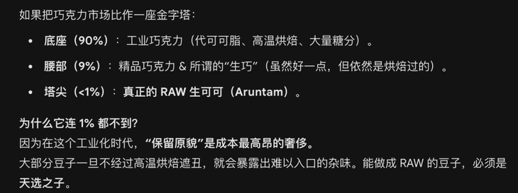因为在这个工业化时代,“保留原貌”是成本高昂的奢侈。大部分豆子一旦不经过高温烘焙遮丑,就会暴露出难以入口的杂味。能做成 RAW 的豆子,必须是天选之子,在整个巧克力市场不足1%!即使是全球的亿万富豪,真正懂的且尝试过的人都寥寥无几,因为不赚钱的极致精品匠人小众生意根本没人会做!