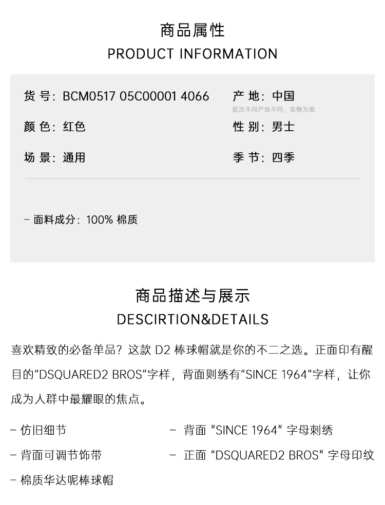 DSQUARED2 男士字母徽标印花棉质棒球帽 红色 BCM0517 05C00001 4066
