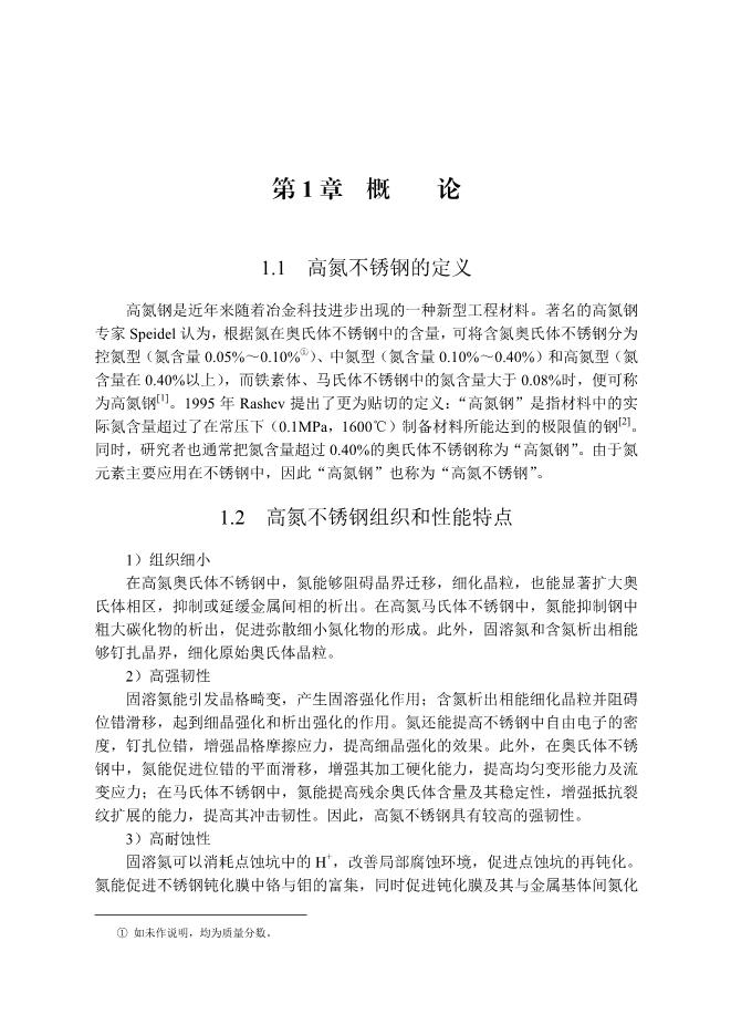 高氮钢是近年来随着冶金科技进步出现的一种新型工程材料。著名的高氮钢专家Speidel认为,根据氮在奥氏体不锈钢中的含量,可将含氮奥氏体不锈钢分为控氮型(氮含量0.05%~0.10% )、中氮型(氮含量0.10%~0.40%)和高氮型(氮含量在0.40%以上),而铁素体、马氏体不锈钢中的氮含量大于0.08%时,便可称为高氮钢[1]。1995年Rashev提出了更为贴切的定义:“高氮钢”是指材料中的实际氮含量超过了在常压下(0.1MPa,1600℃)制备材料所能达到的极限值的钢[2]。同时,研究者也通常把氮含量超过0.40%的奥氏体不锈钢称为“高氮钢”。由于氮元素主要应用在不锈钢中,因此“高氮钢”也称为“高氮不锈钢”。