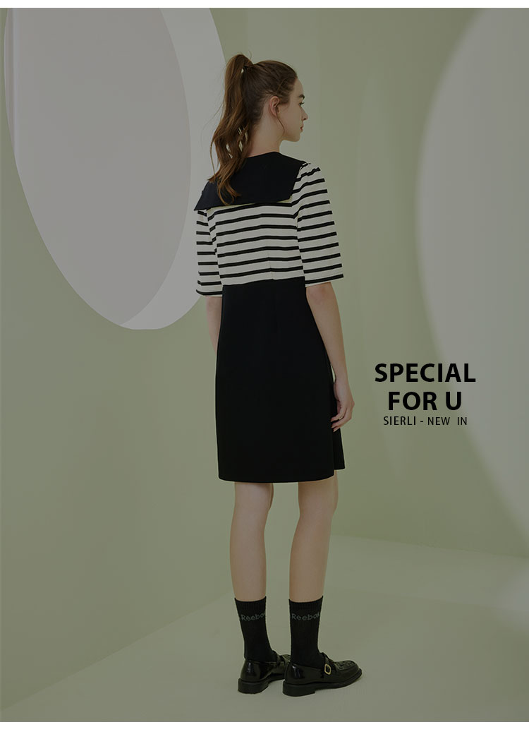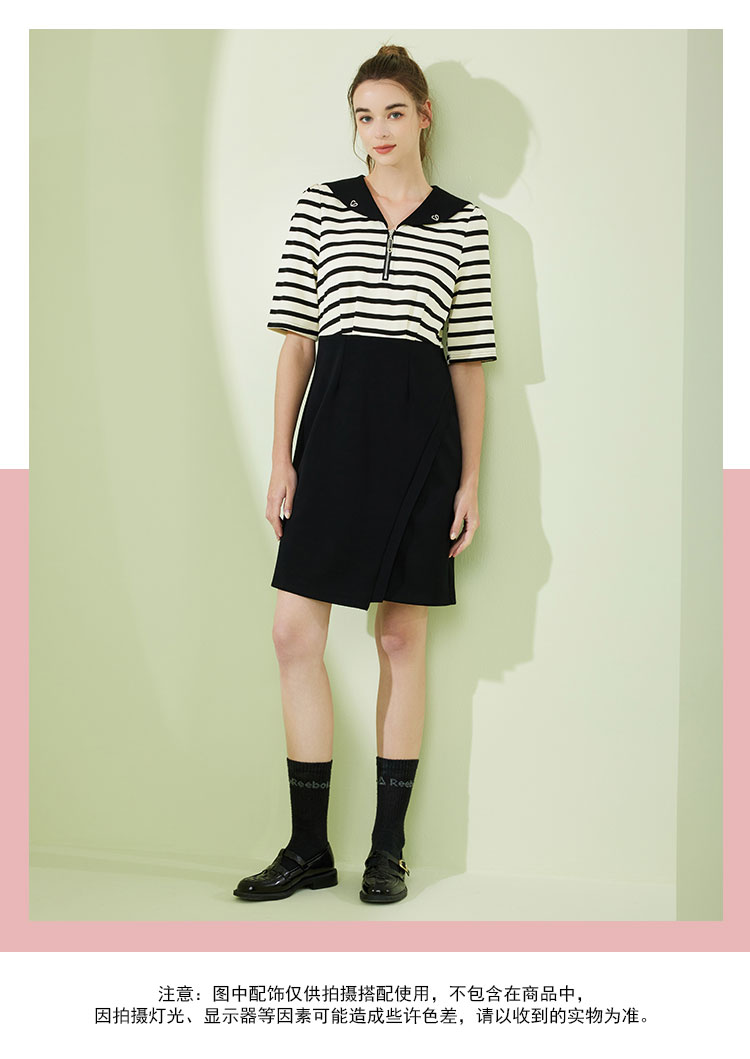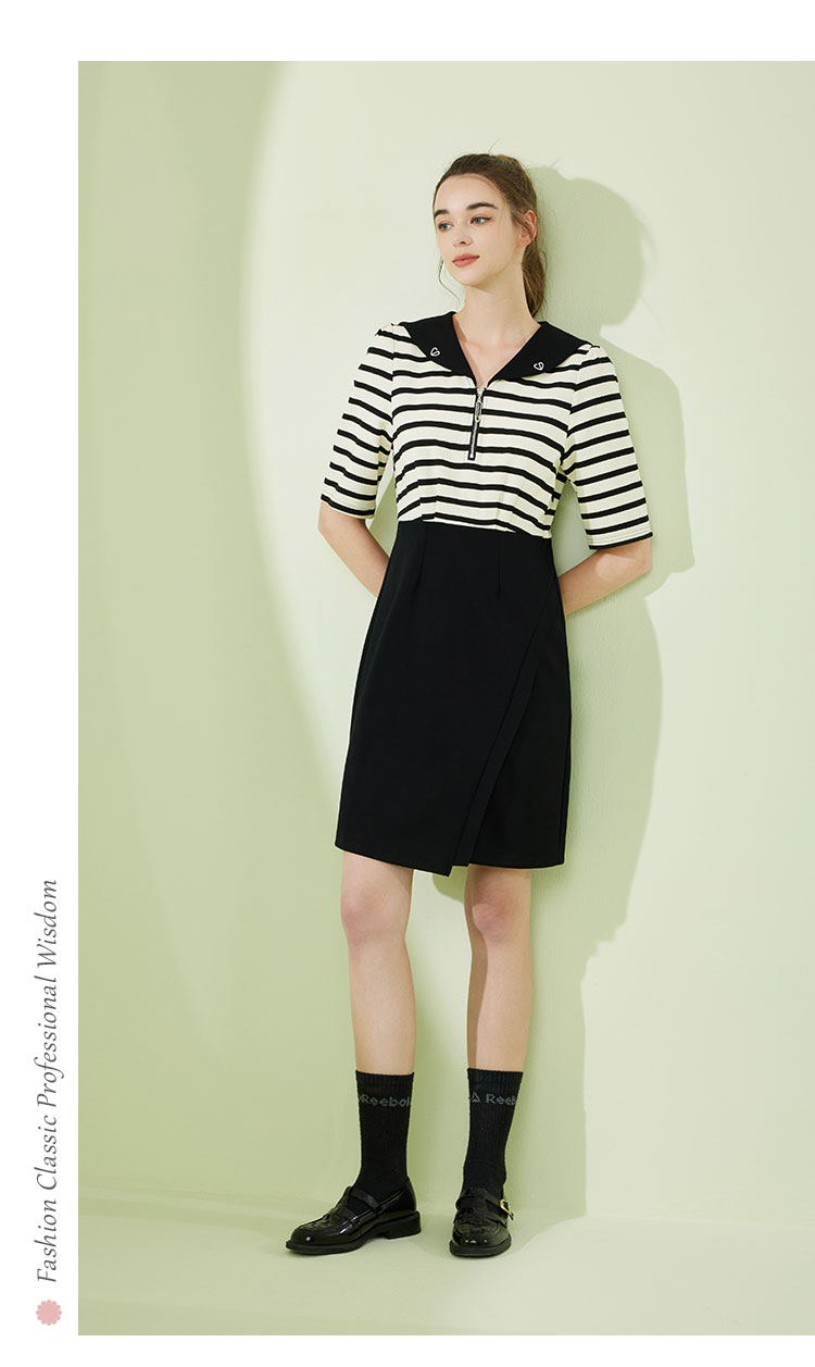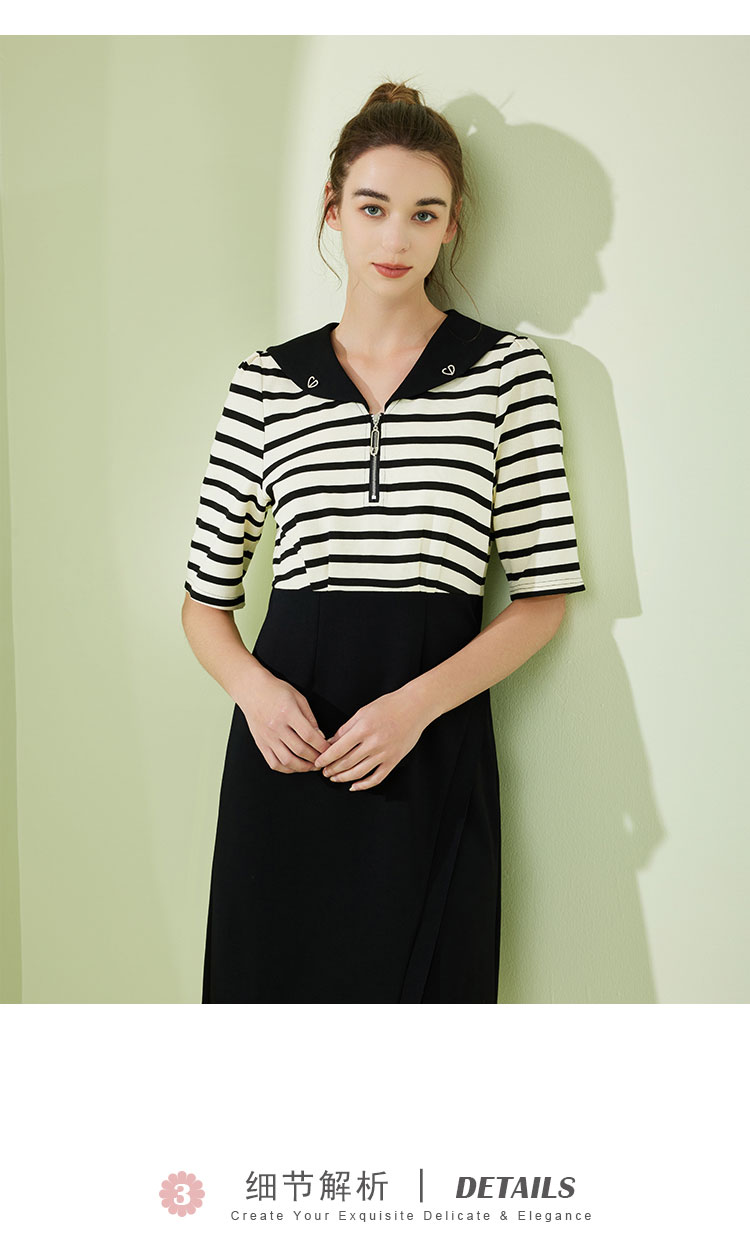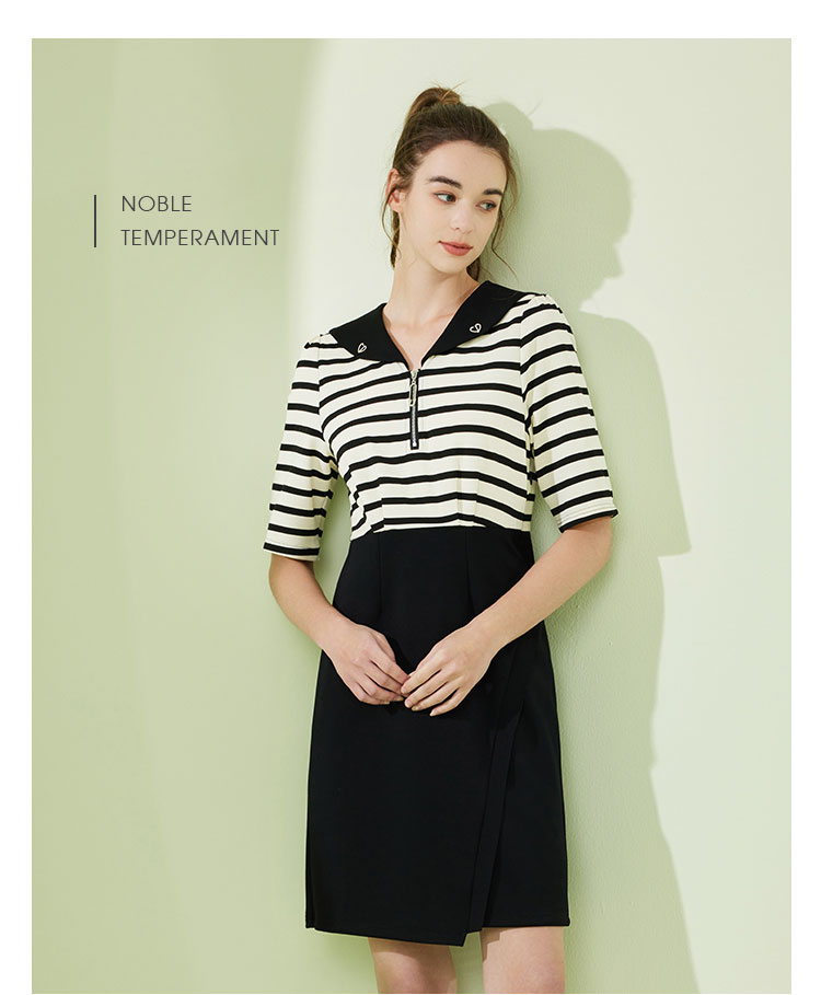 NF8W6斯尔丽瑟俪2023春季新款翻领拼接式条纹减龄通勤连衣裙