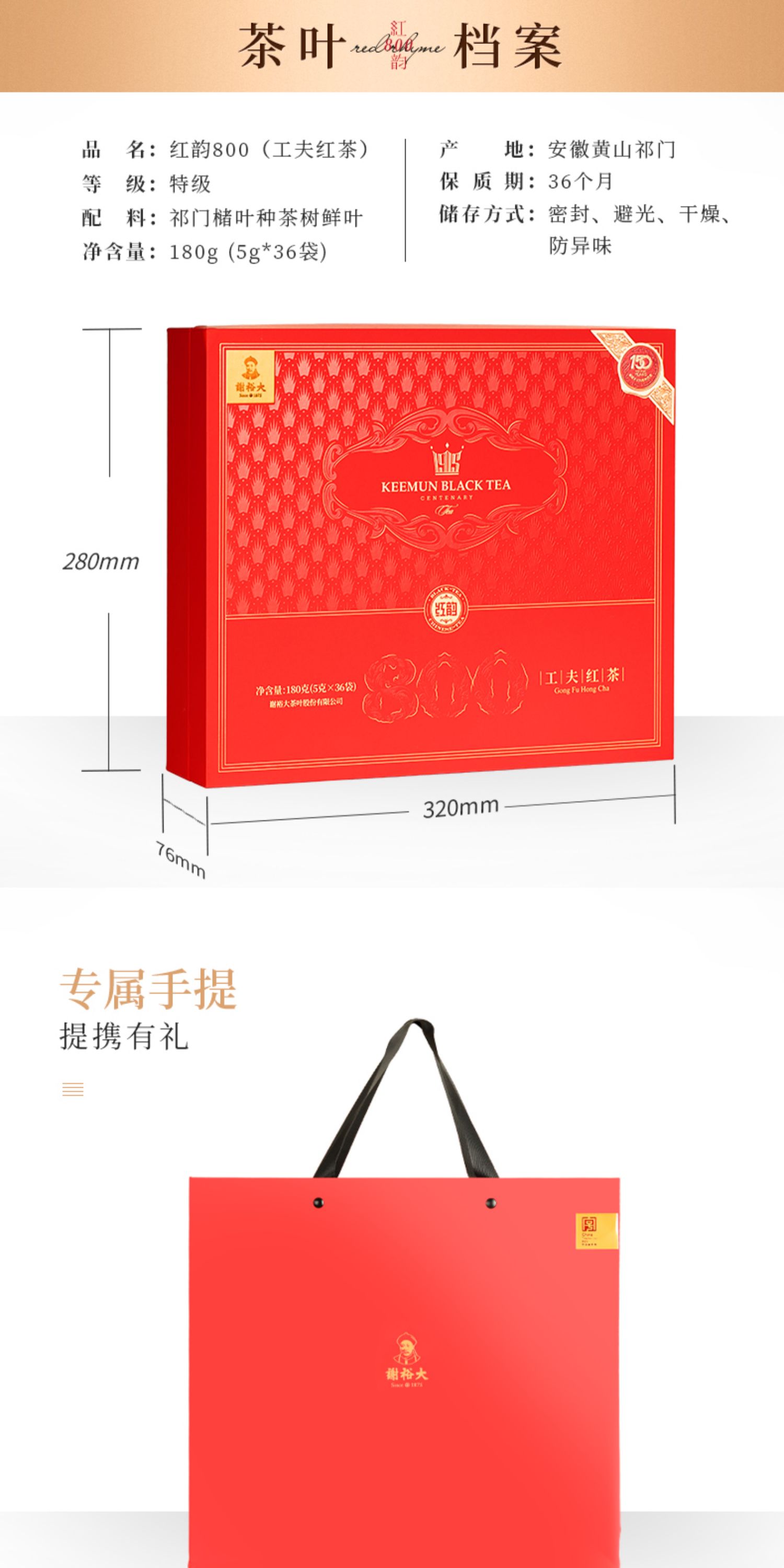 谢裕大 正宗祁门红茶工夫红茶 红韵800礼盒180g 红茶送礼推荐