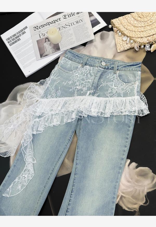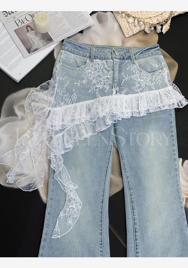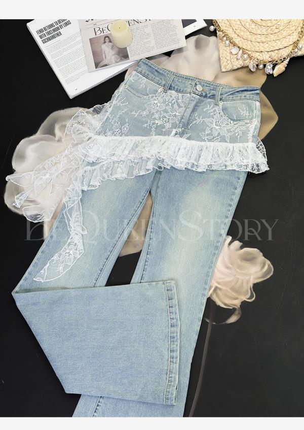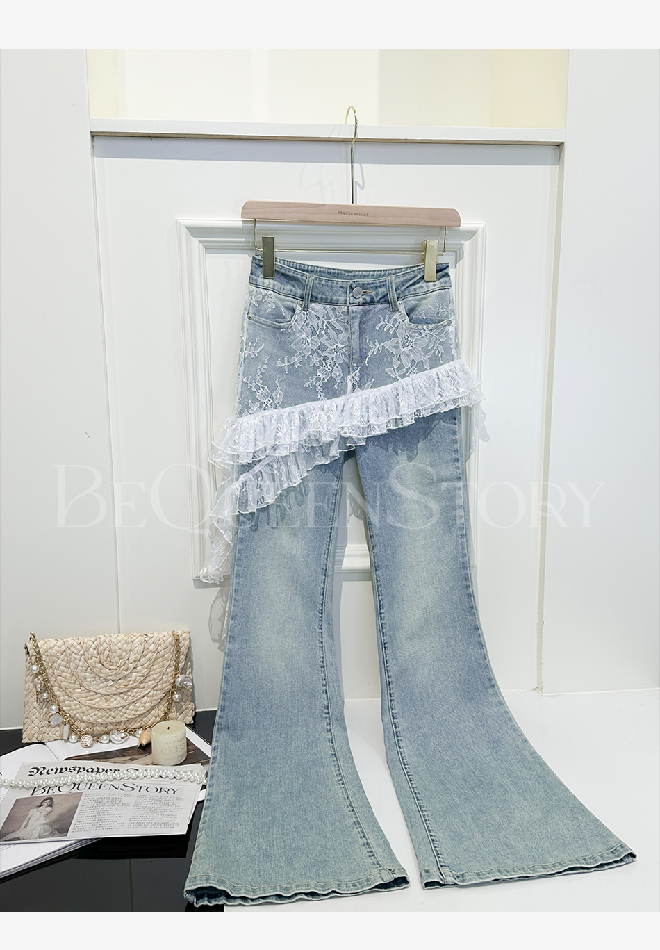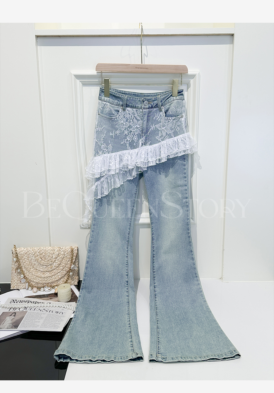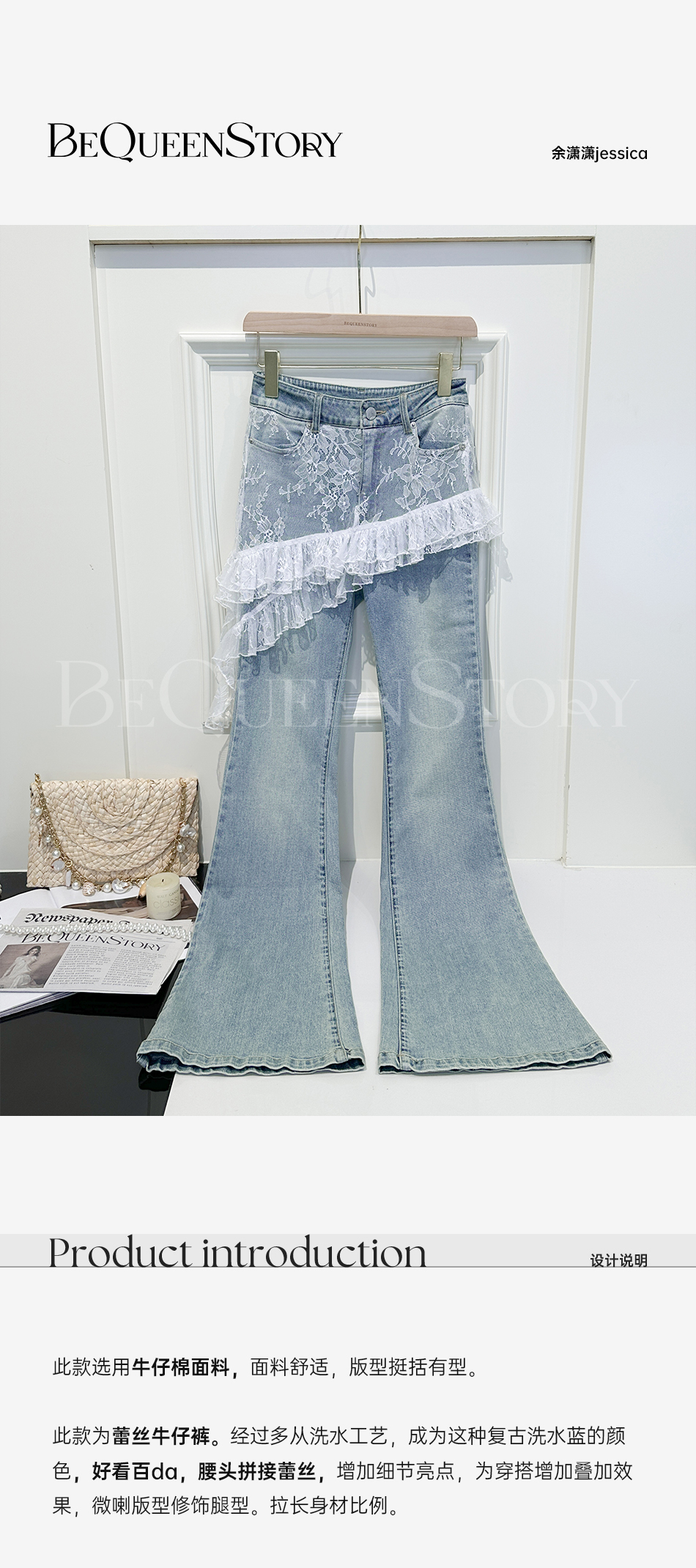 余潇潇【心动际遇】2025春装新款设计感腰头拼接精美蕾丝牛仔喇叭裤