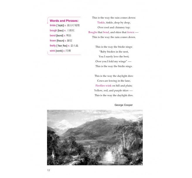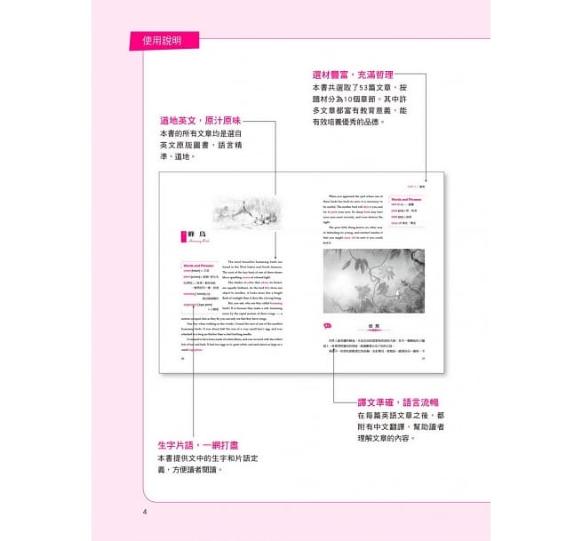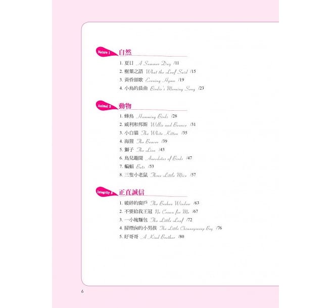 按題材分為10個章節。如:自然、動物、正直誠信、勤奮進取、自律等。共收錄53篇詩集、散文和故事,內容包羅萬象,引人入勝。