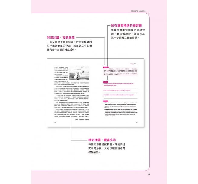 分為引導式問題和英語檢定常見題型,測驗讀者能否理解文章主旨與細節,另有是非題、選擇題、填空題等題型,幫助讀者準備考試。