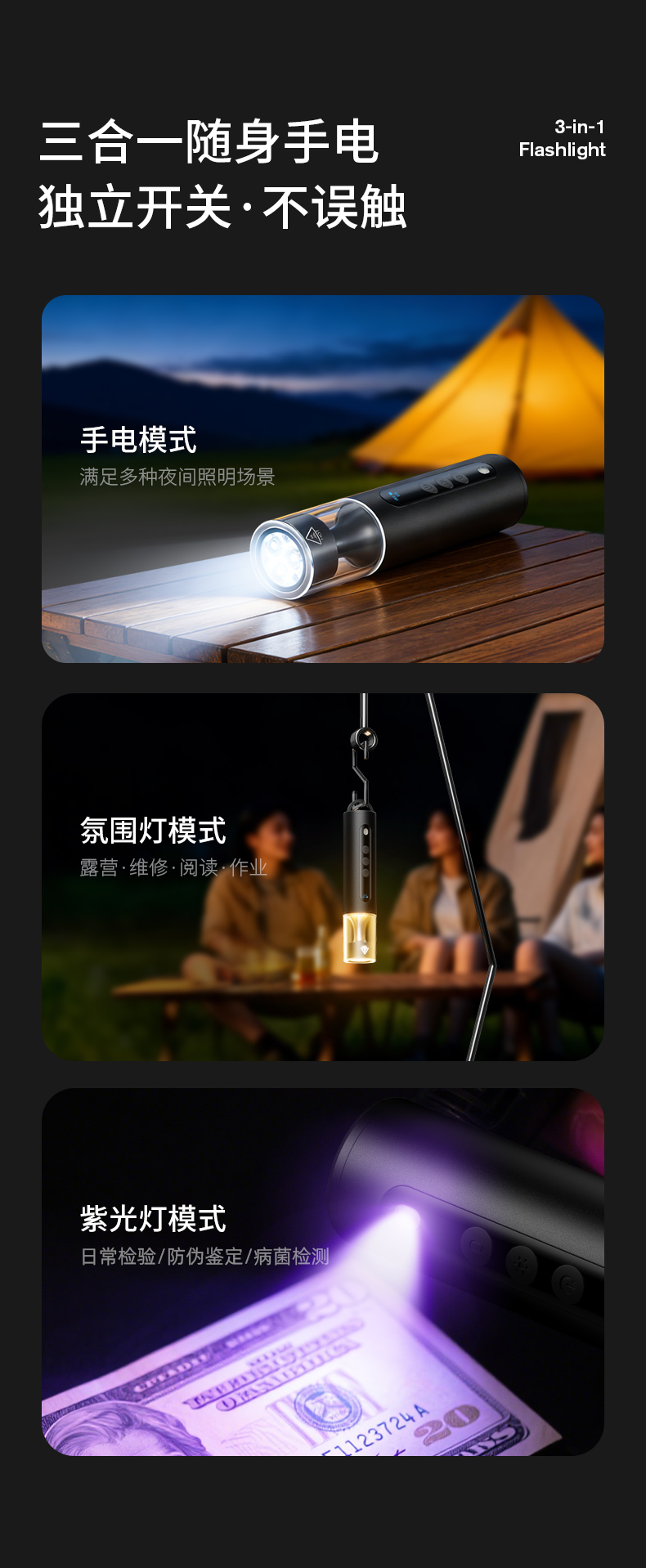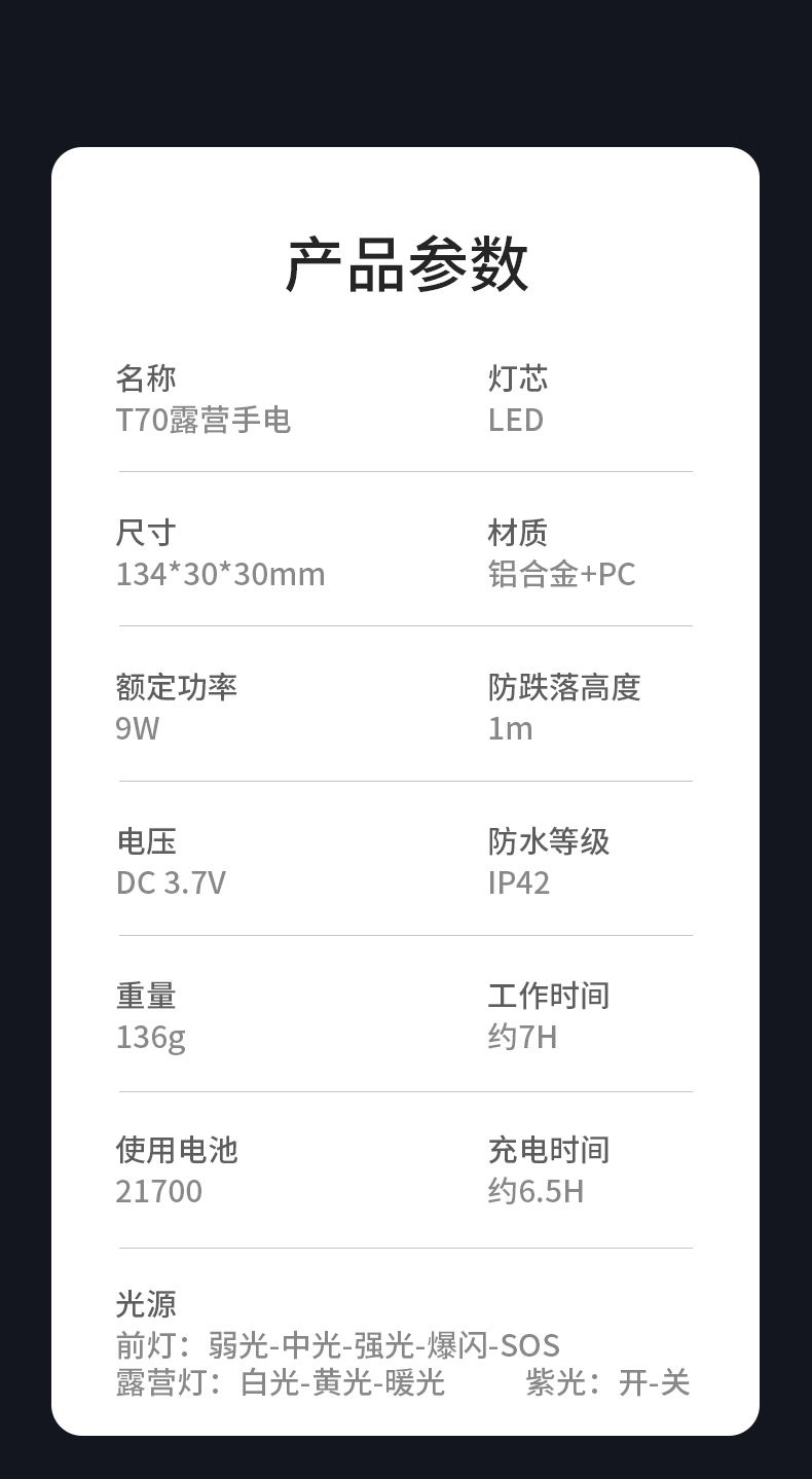 神火T70强光手电长续航多光源支架挂钩家用野外多功能露营手电筒