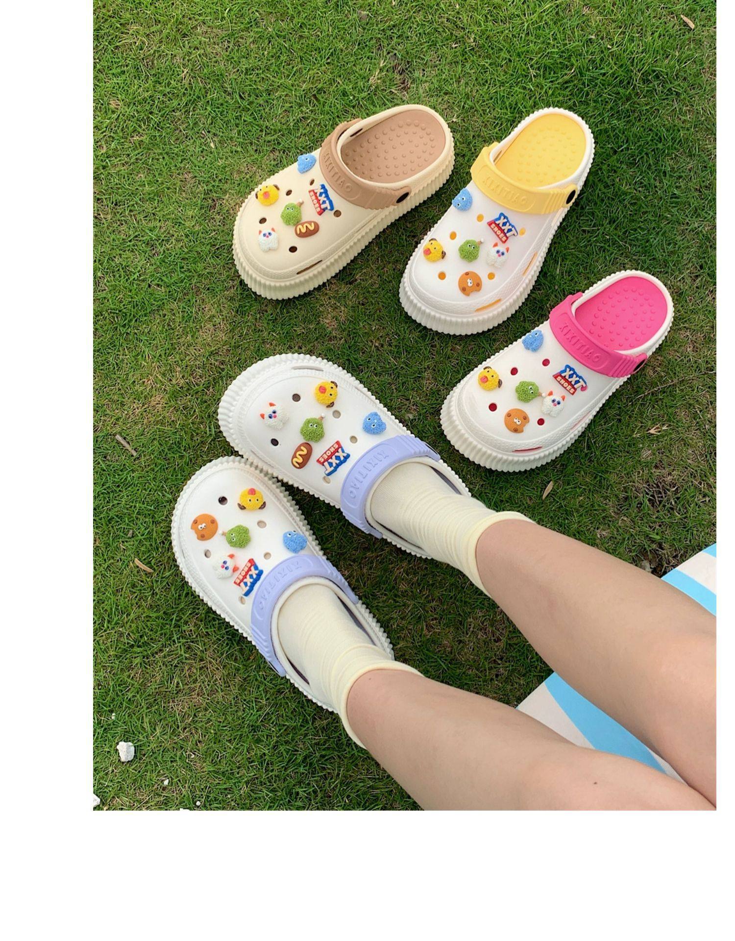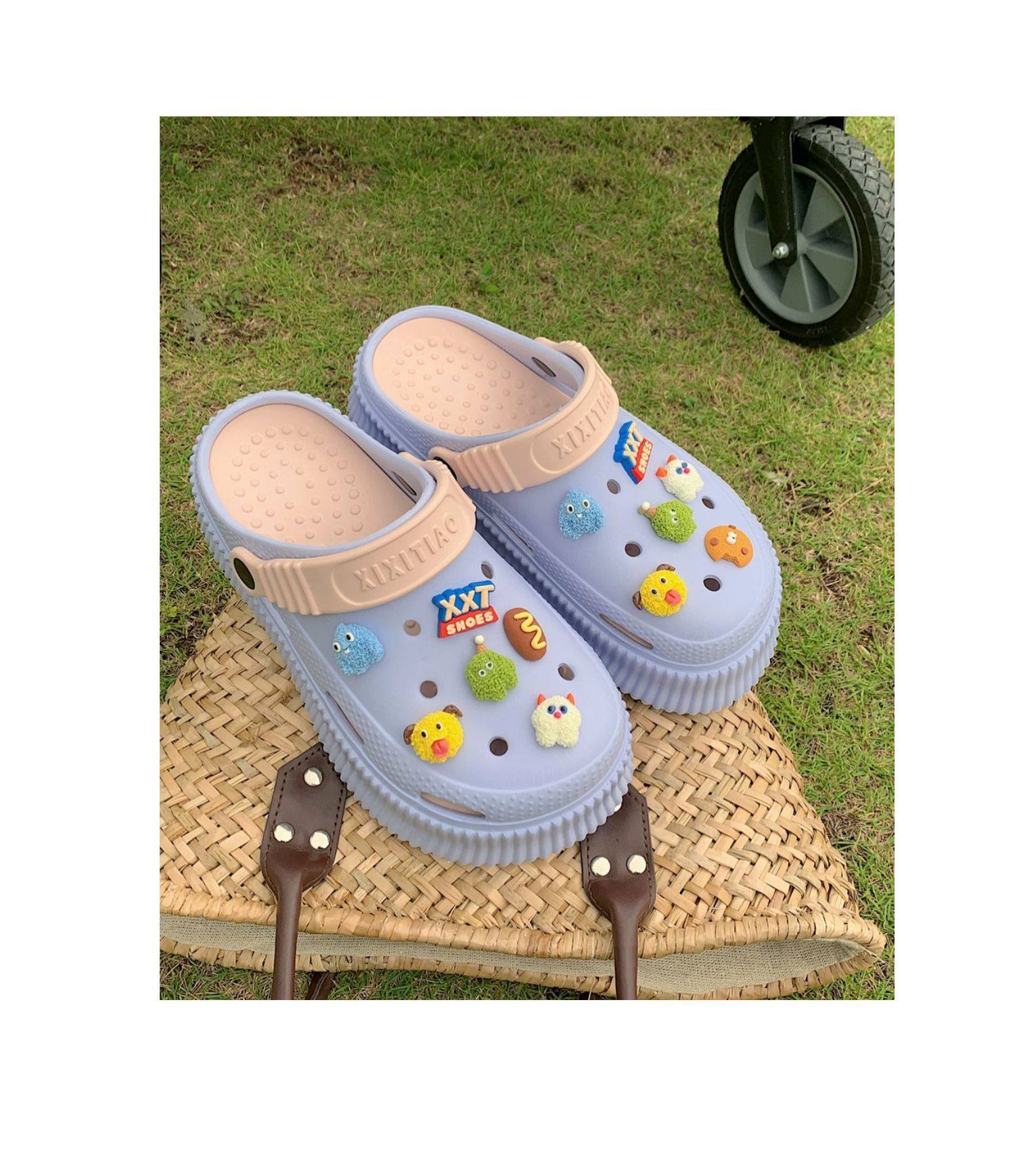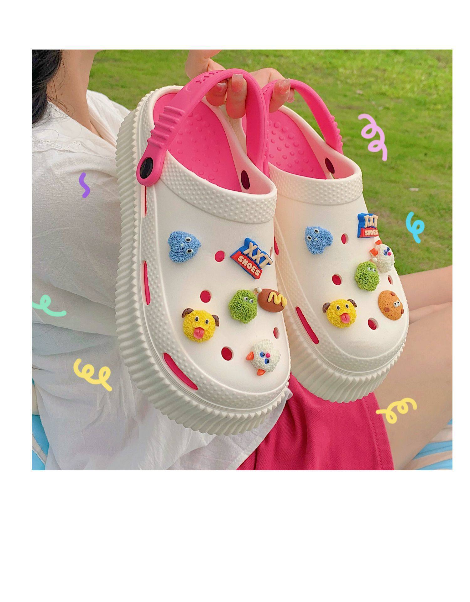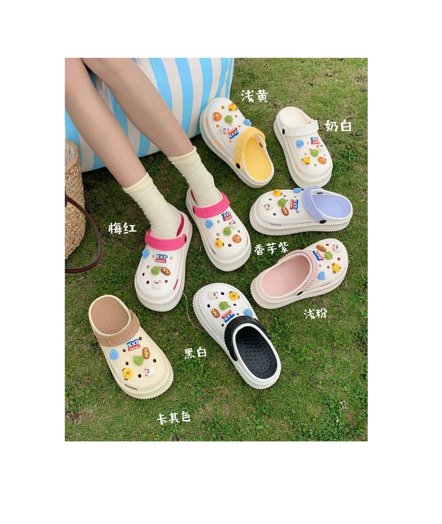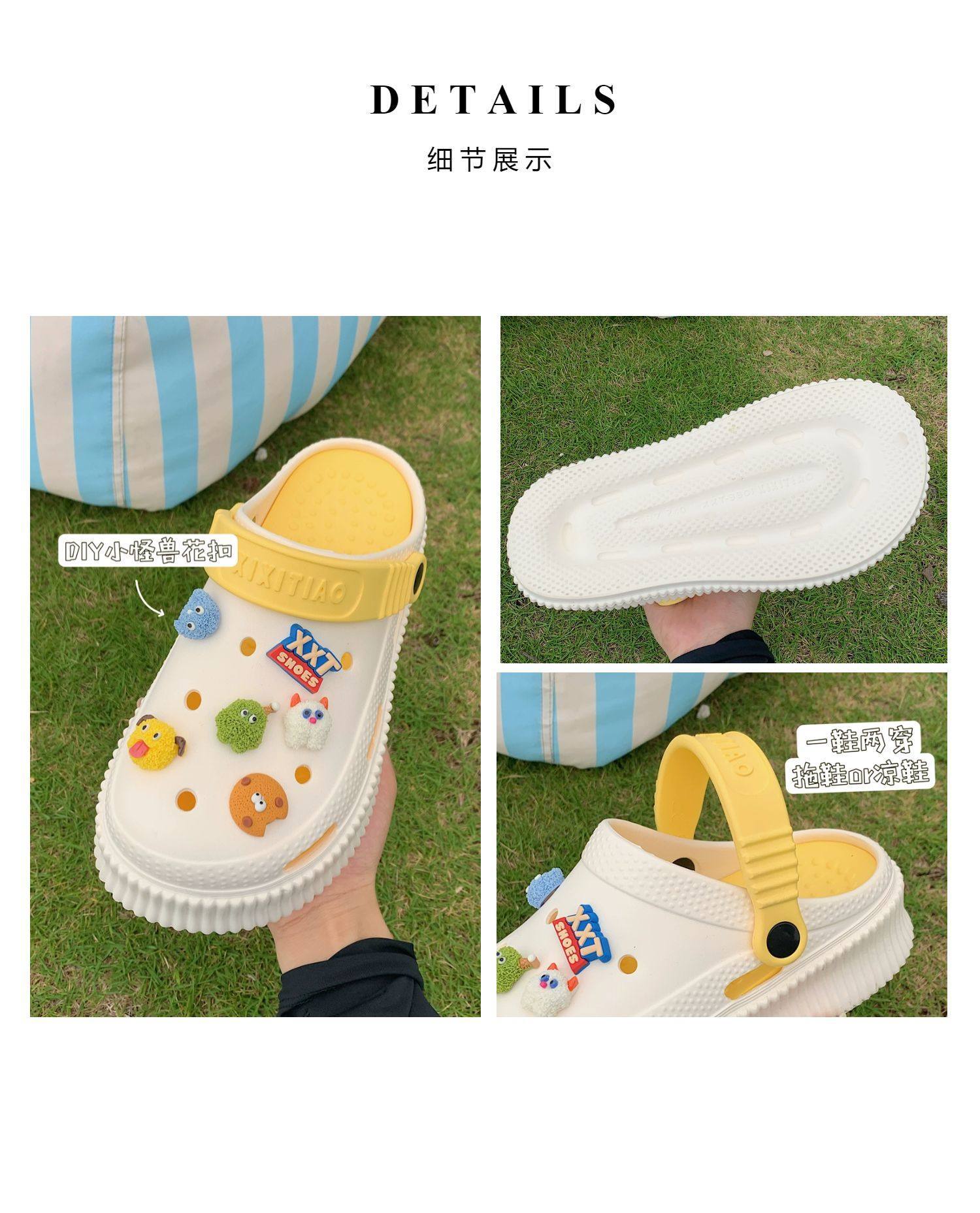【DIY小怪兽花扣,一鞋两穿,凉鞋or拖鞋~~】时尚立体卡通软底包头洞洞鞋 厚底增高户外女士 夏季海边沙滩凉鞋拖鞋-QQ