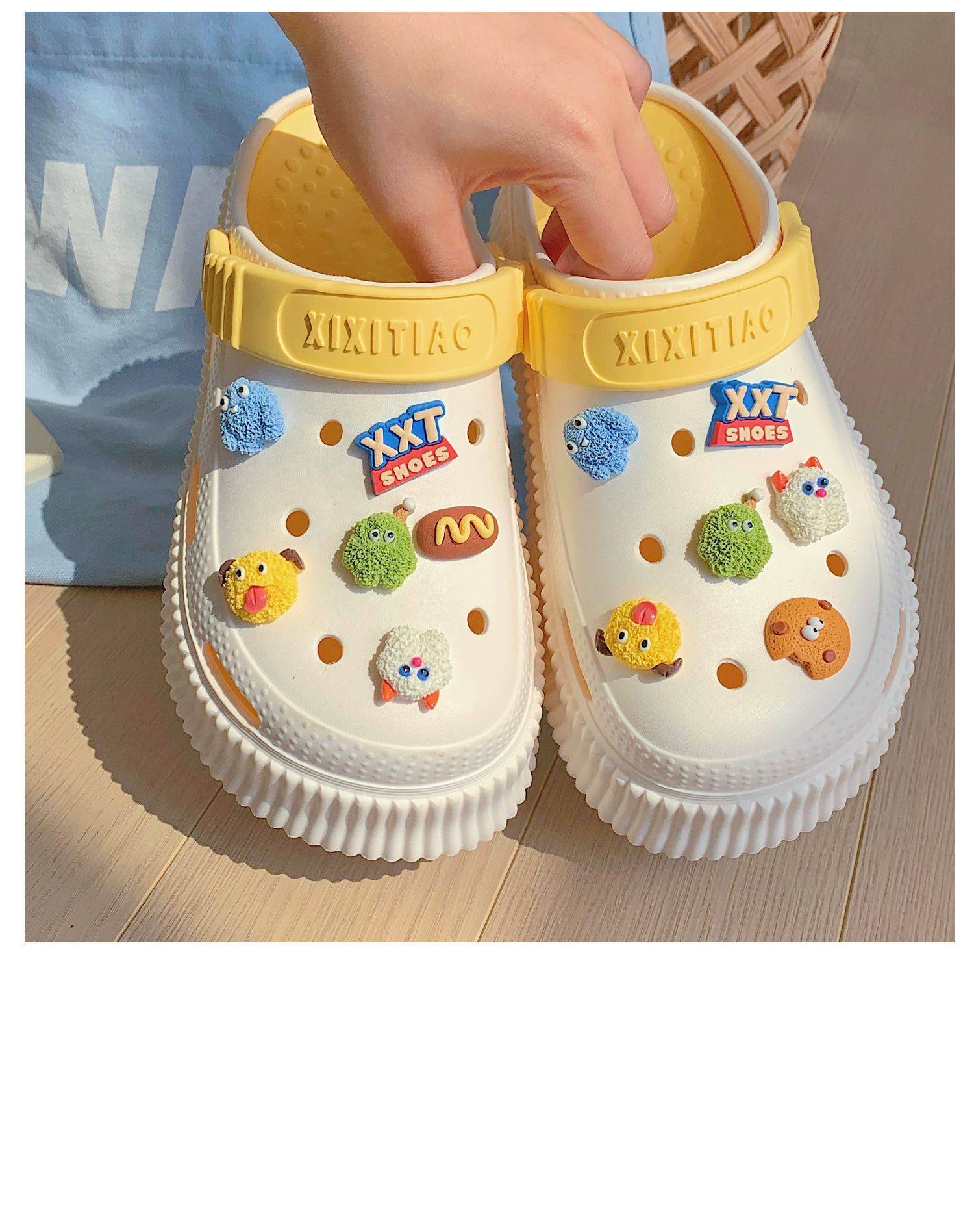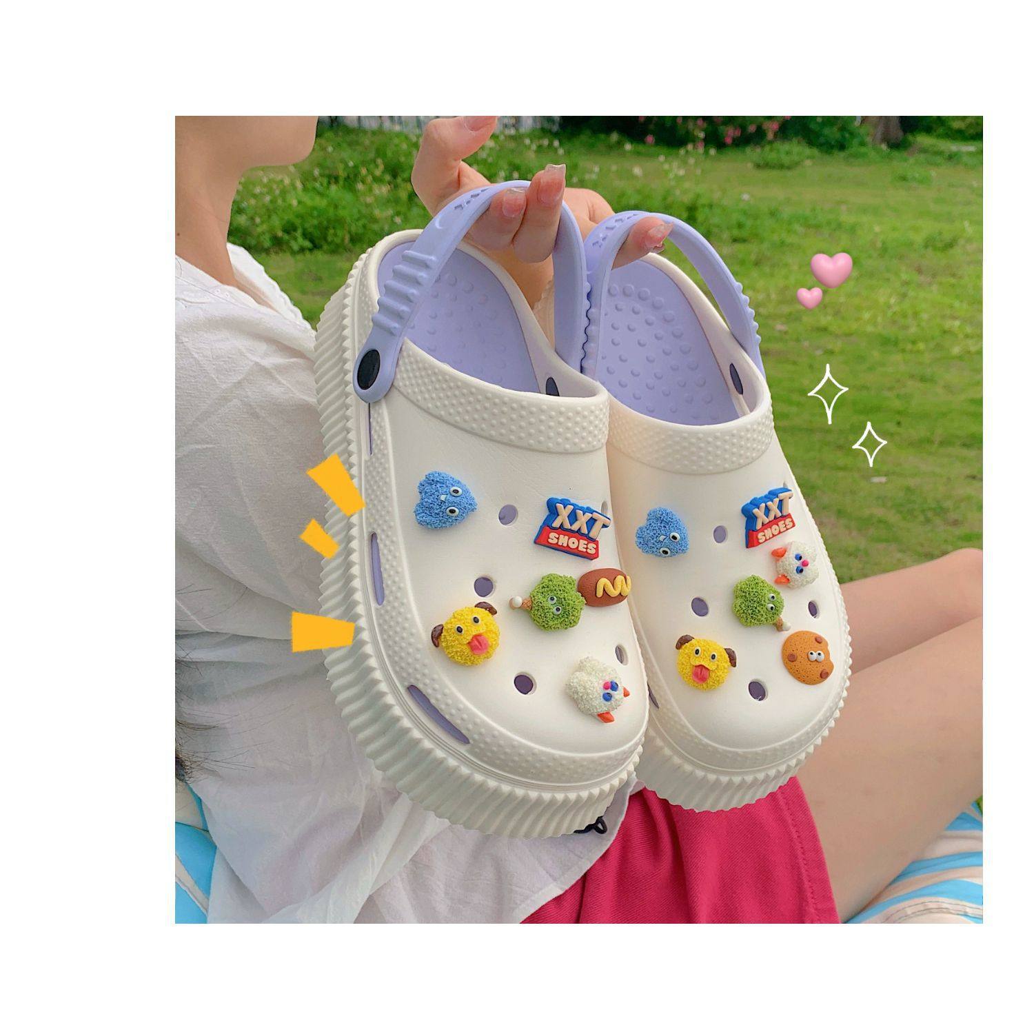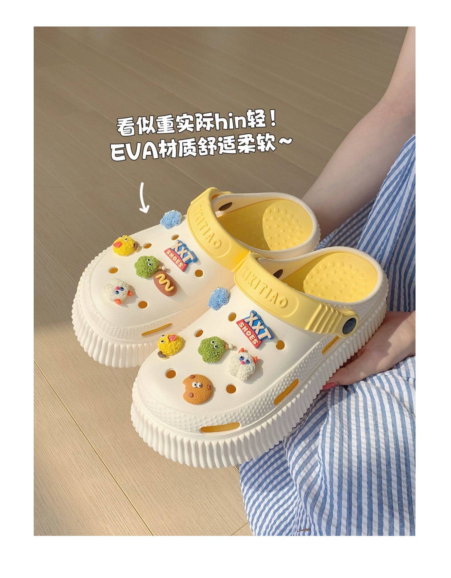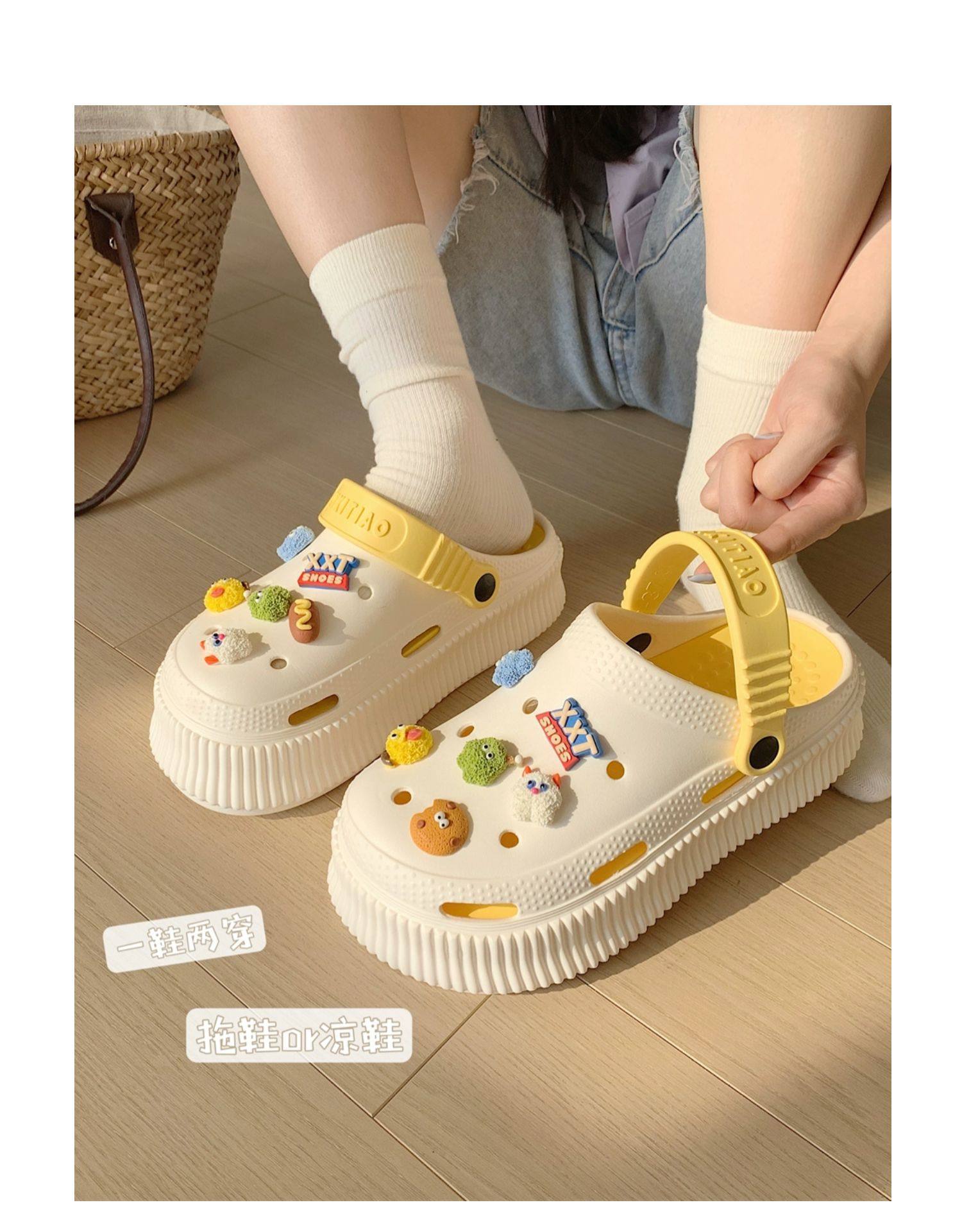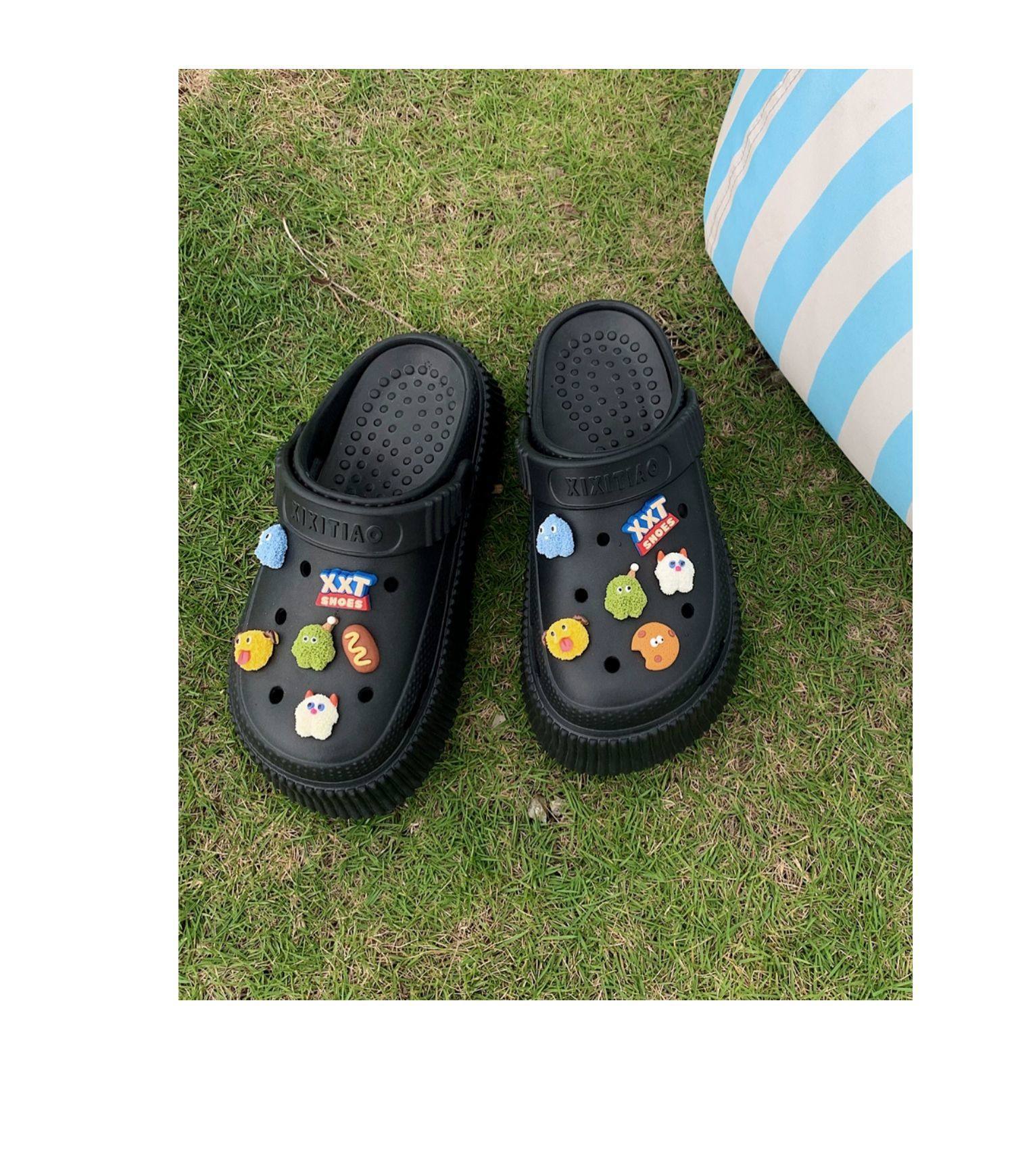 【DIY小怪兽花扣,一鞋两穿,凉鞋or拖鞋~~】时尚立体卡通软底包头洞洞鞋 厚底增高户外女士 夏季海边沙滩凉鞋拖鞋-QQ
