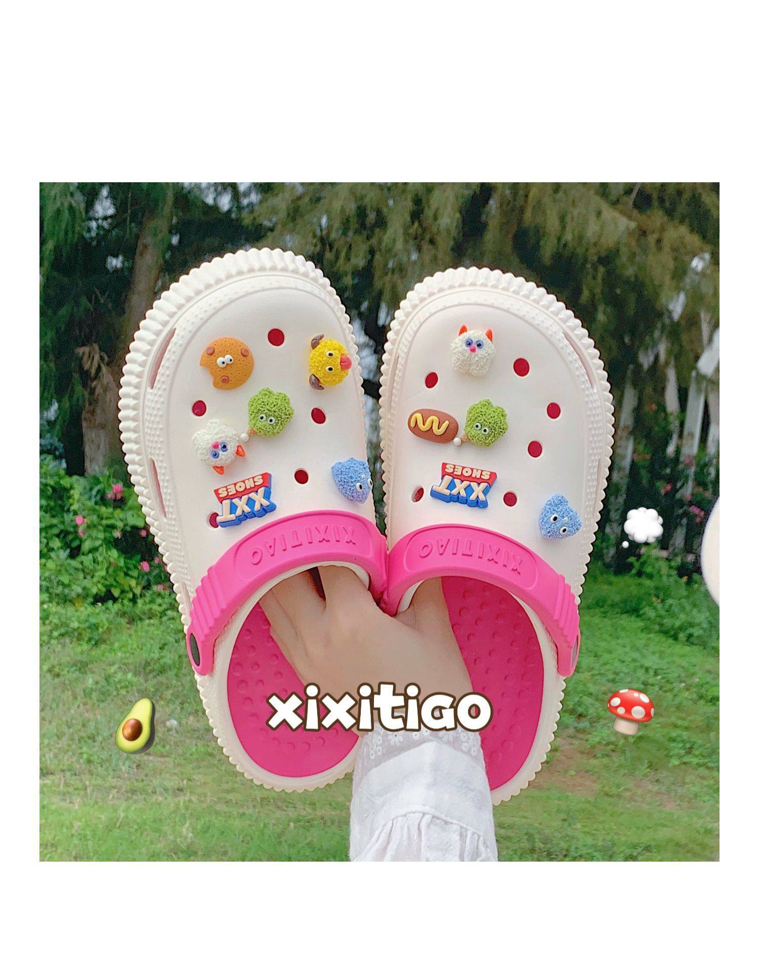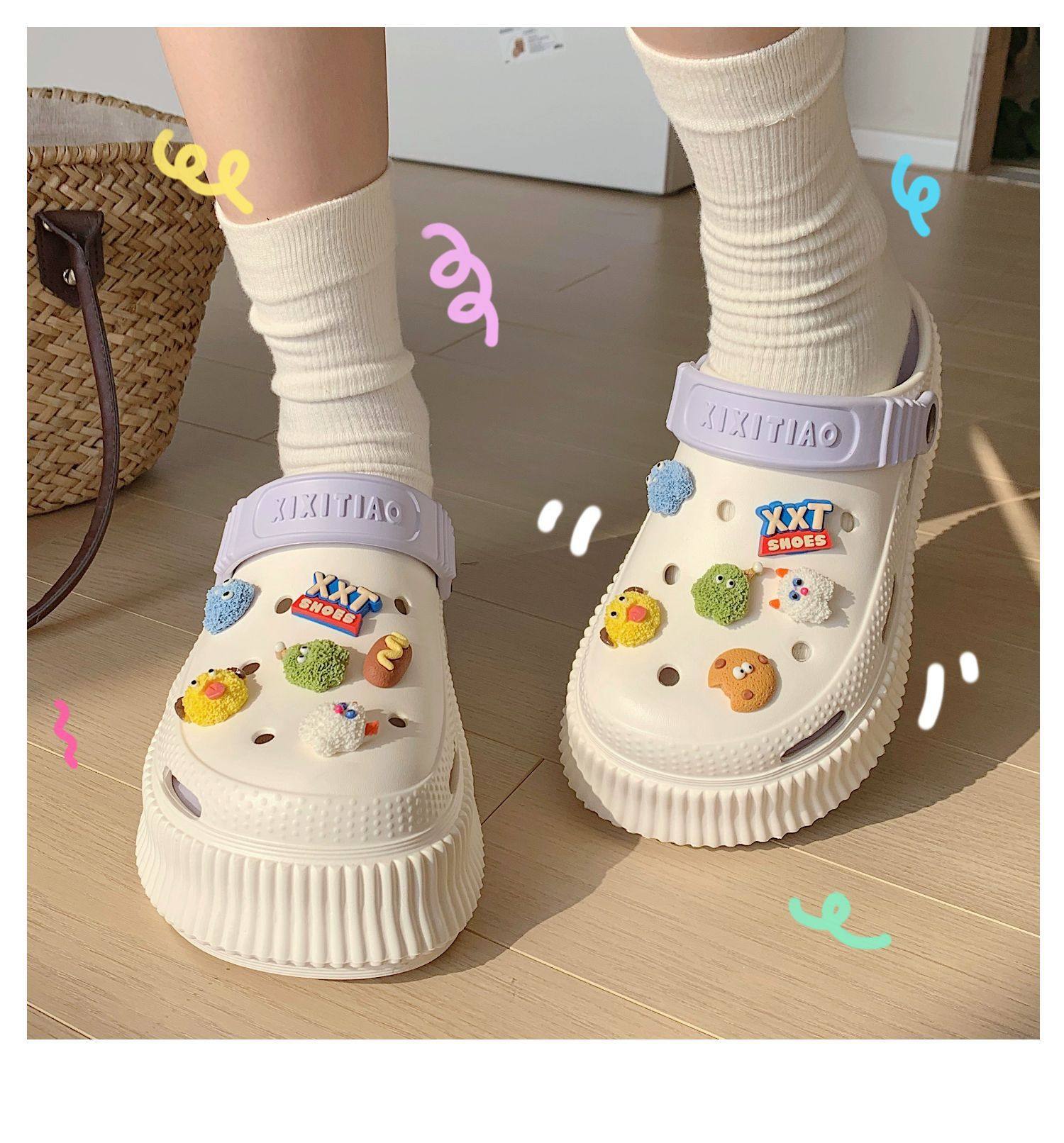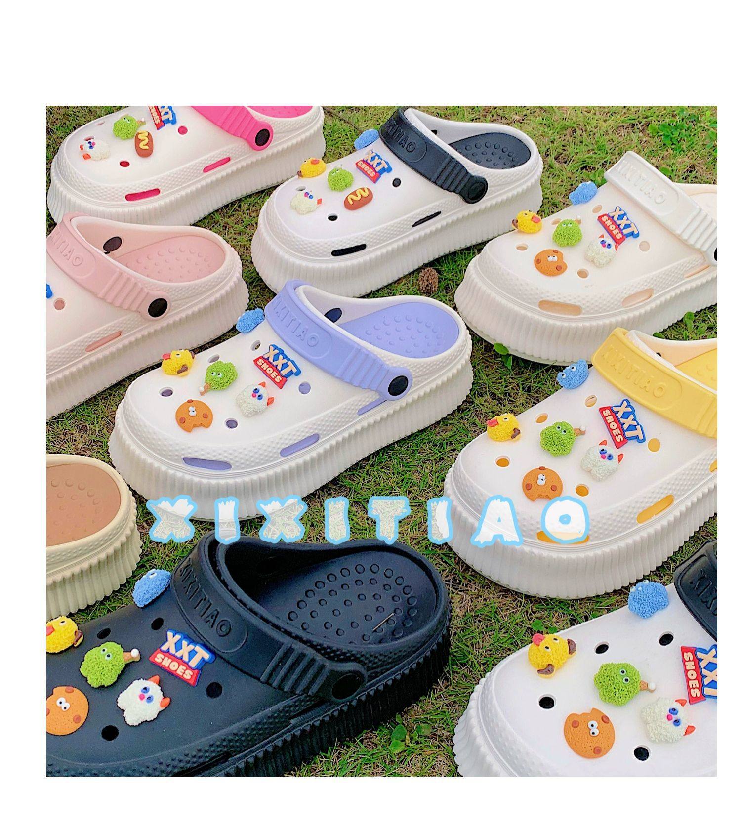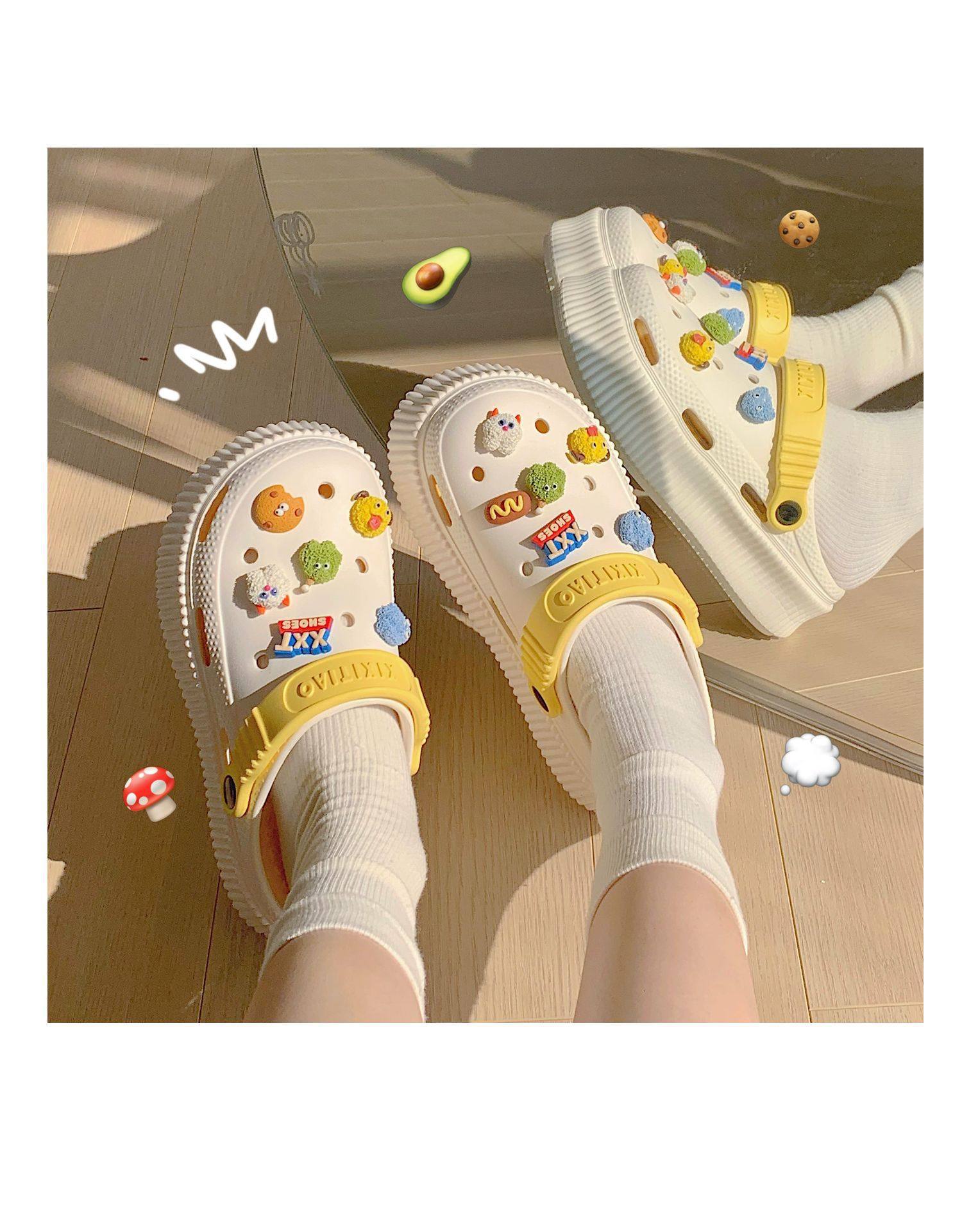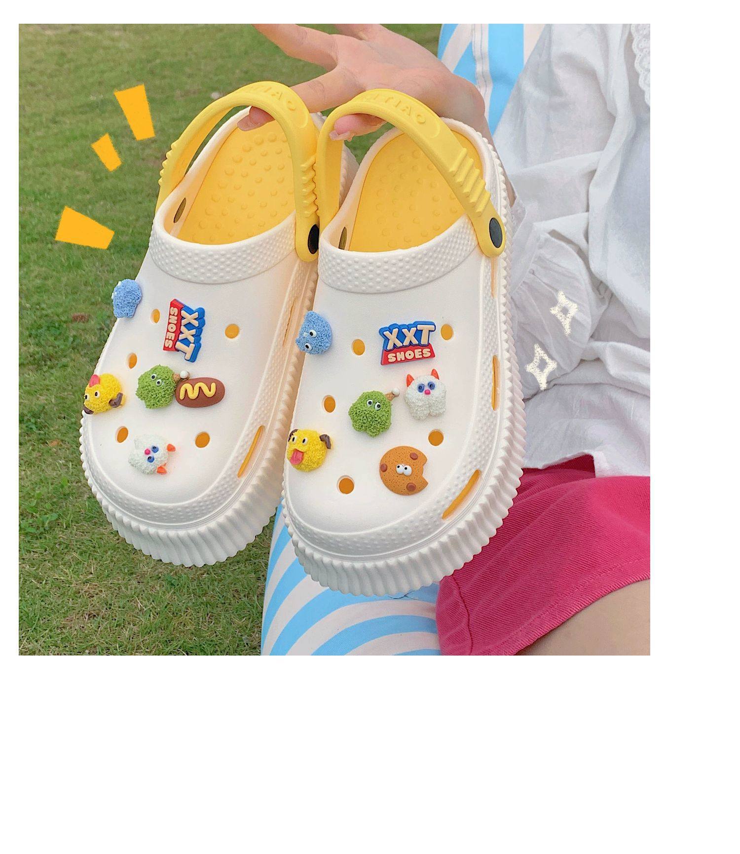 【DIY小怪兽花扣,一鞋两穿,凉鞋or拖鞋~~】时尚立体卡通软底包头洞洞鞋 厚底增高户外女士 夏季海边沙滩凉鞋拖鞋-QQ