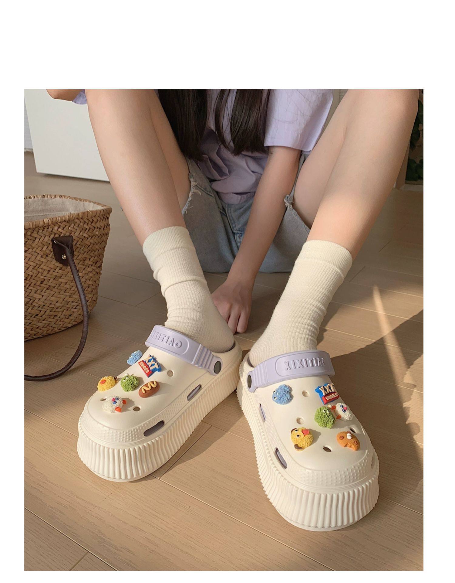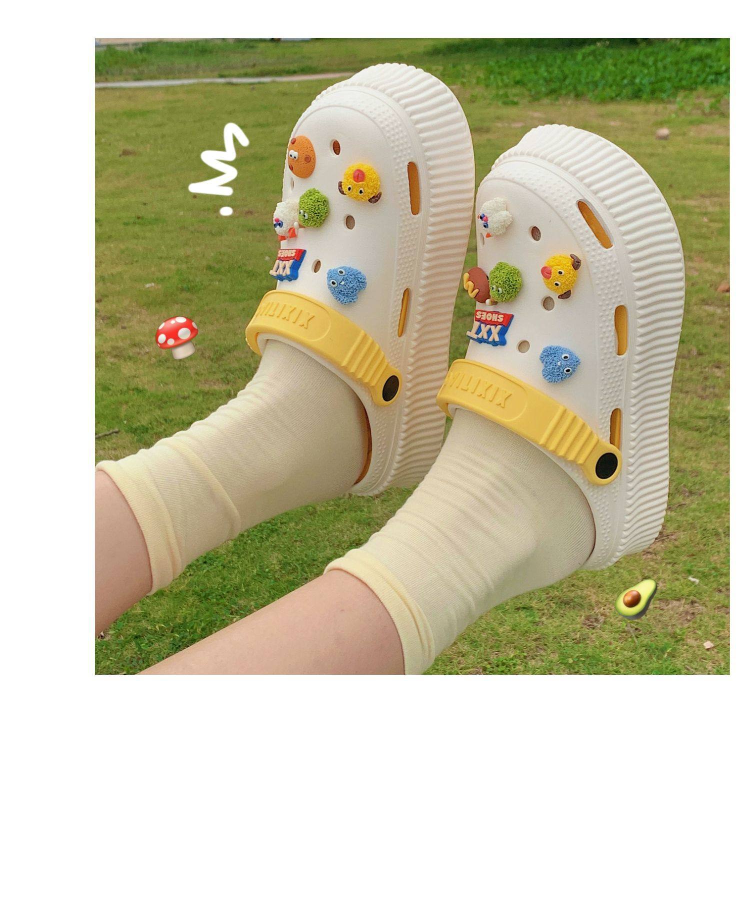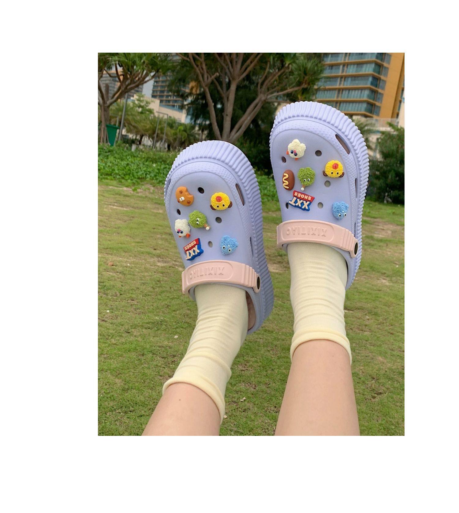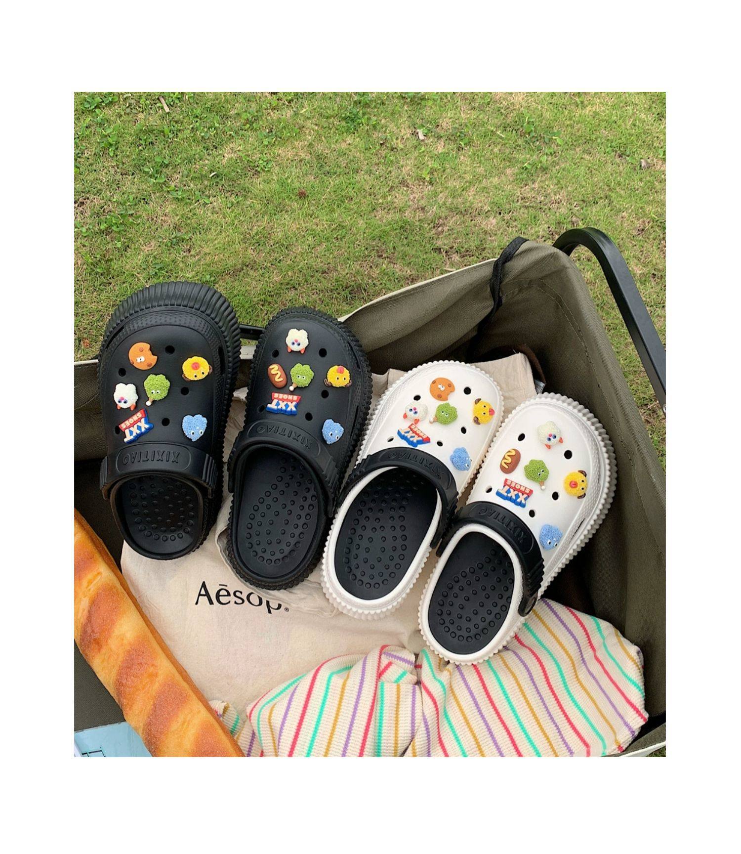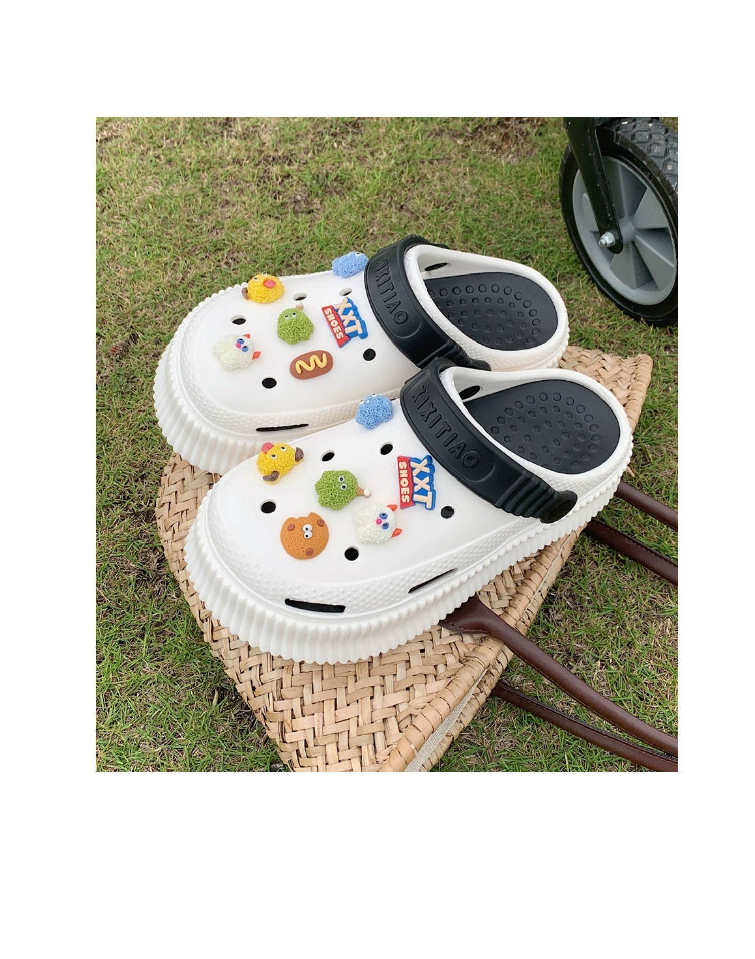 【DIY小怪兽花扣,一鞋两穿,凉鞋or拖鞋~~】时尚立体卡通软底包头洞洞鞋 厚底增高户外女士 夏季海边沙滩凉鞋拖鞋-QQ