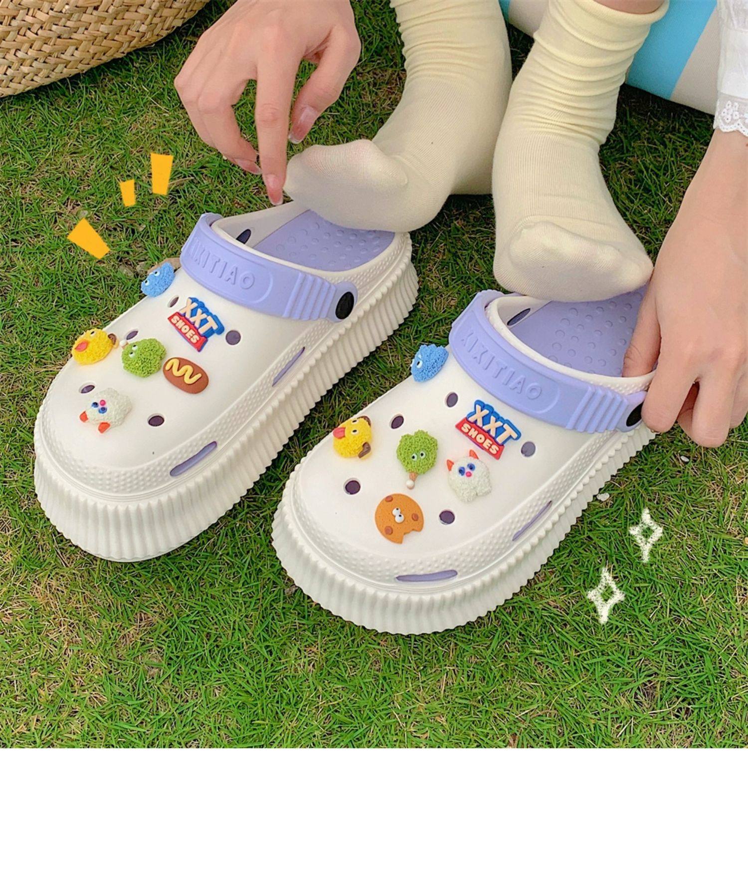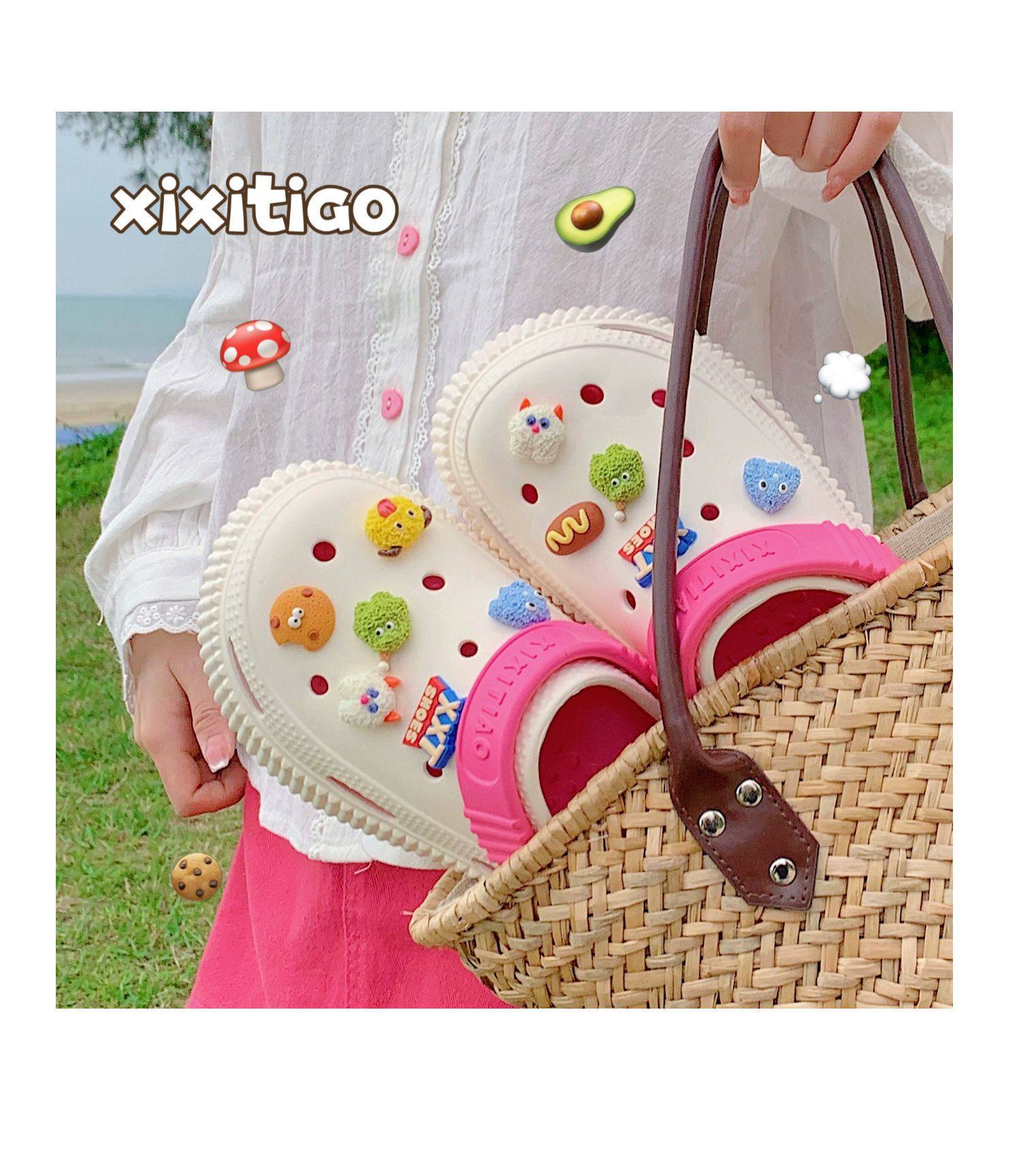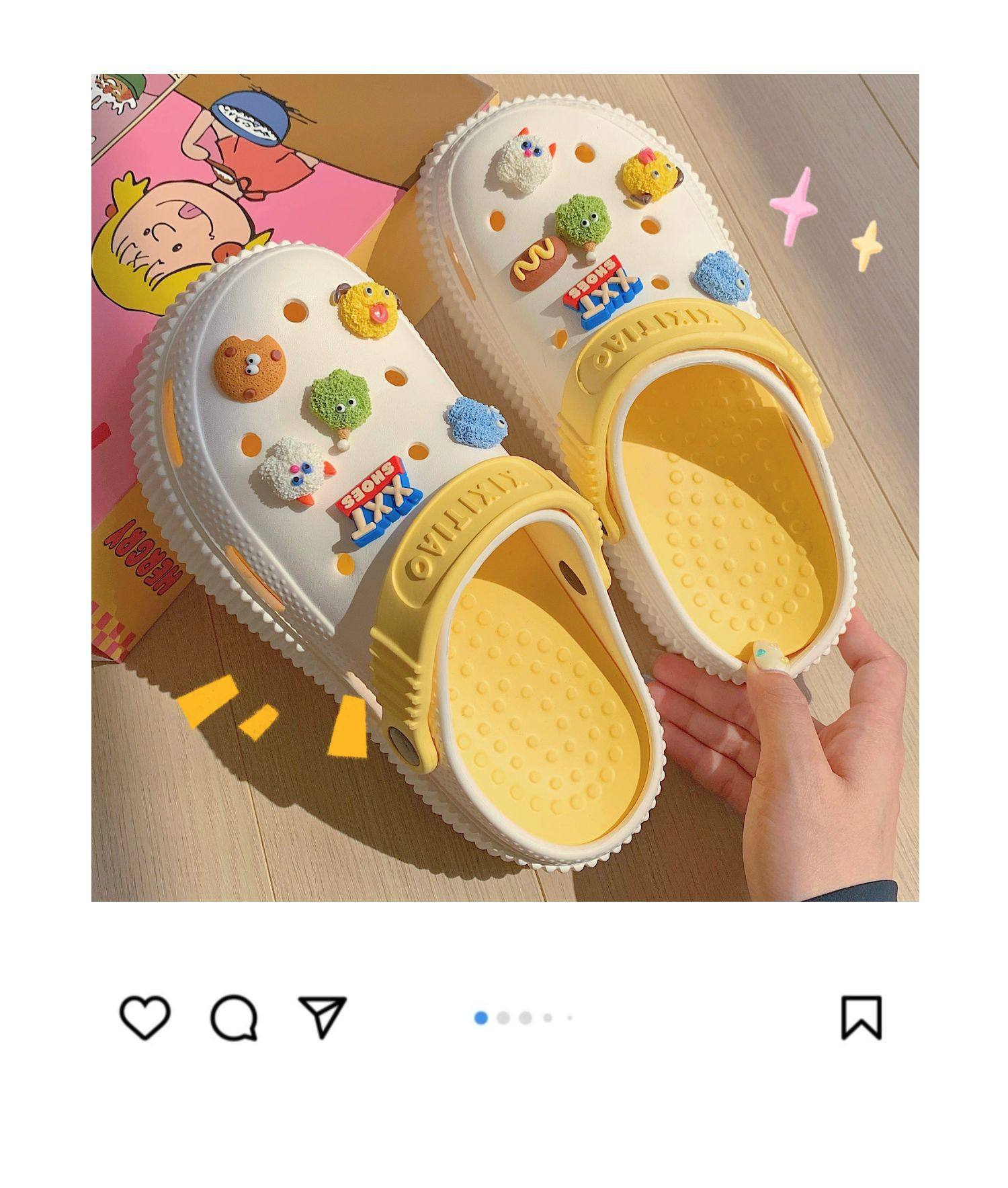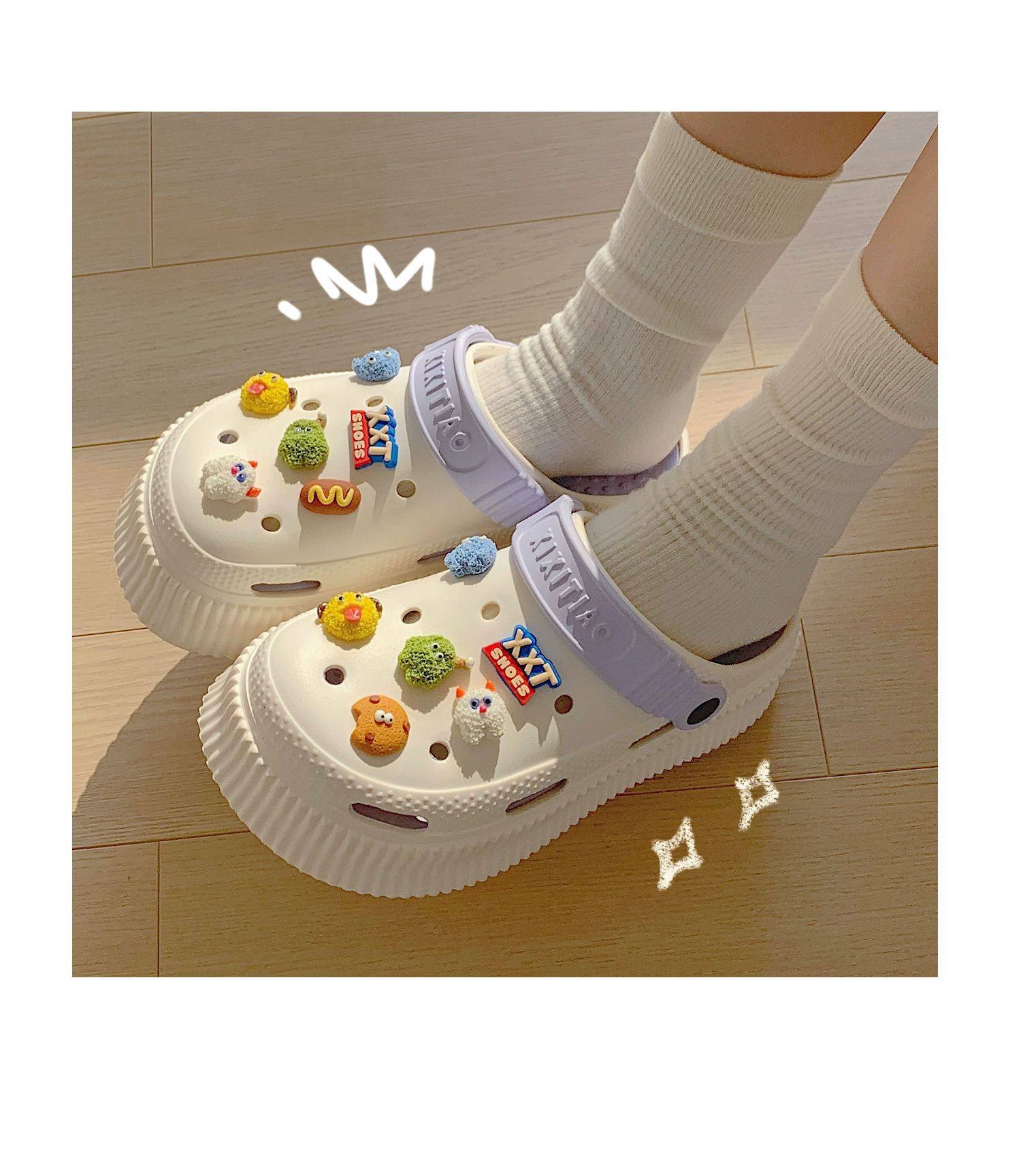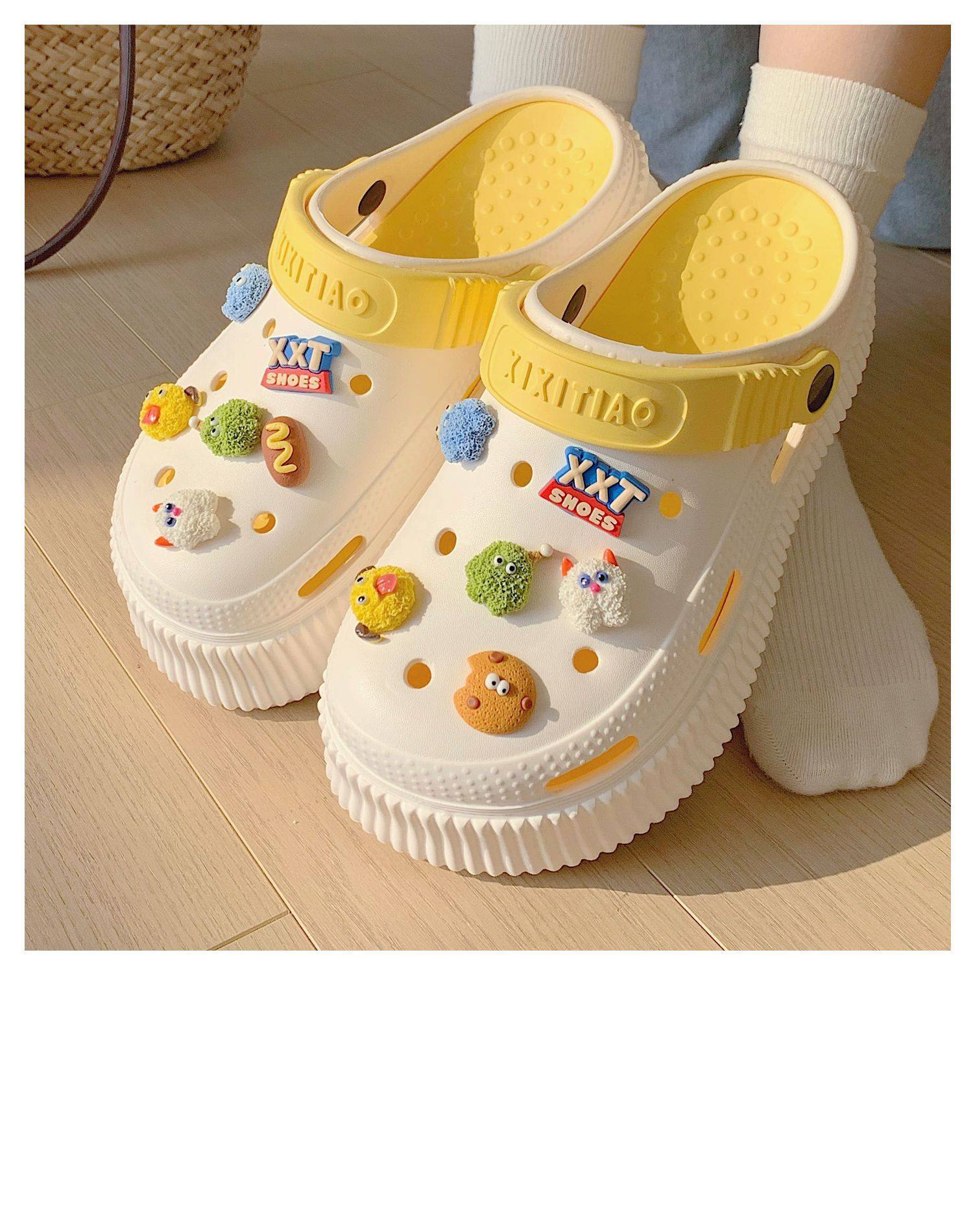 【DIY小怪兽花扣,一鞋两穿,凉鞋or拖鞋~~】时尚立体卡通软底包头洞洞鞋 厚底增高户外女士 夏季海边沙滩凉鞋拖鞋-QQ