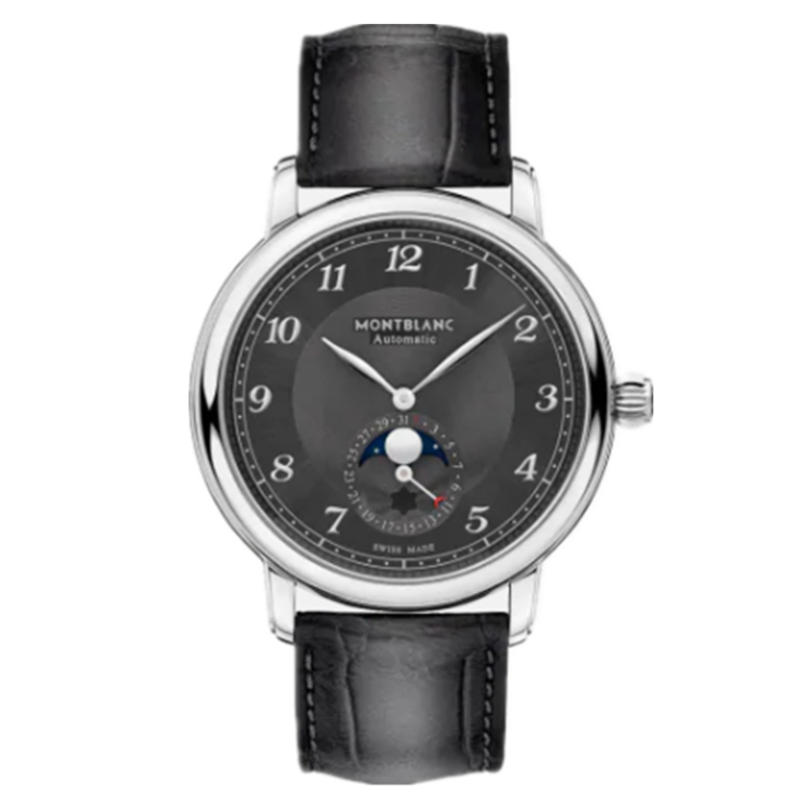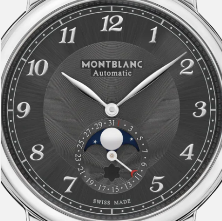 镜面 材质 | 穹形蓝宝石水晶玻璃表镜,防反射涂层 | 表盘 | 精钢表壳 石板灰色表盘,镀铑阿拉伯数字时标;镀铑时针、分针和秒针。 日期 月相显示 精钢非旋入式表冠 |
