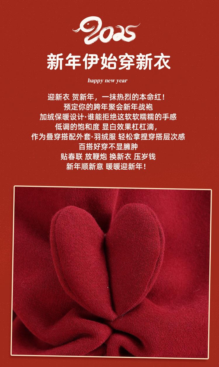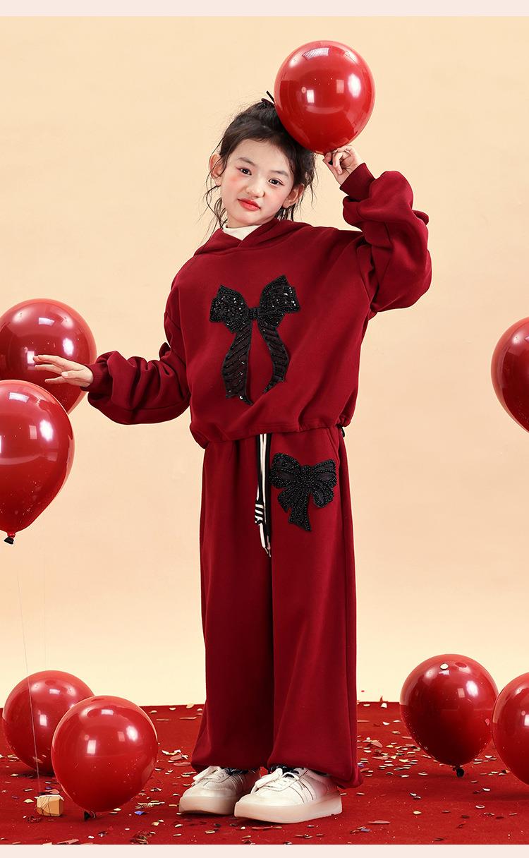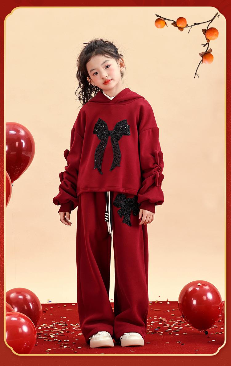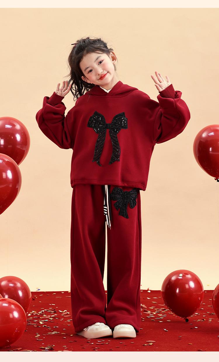 中大儿童新年风红色加绒连帽两件套女童秋冬季新款时髦拜年服套装
