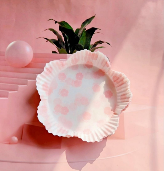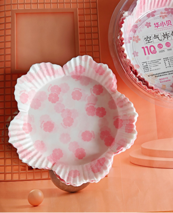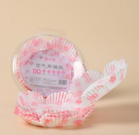 拆开包装先被颜值惊艳。 不是千篇一律的圆或方,是一朵朵灵动的樱花花瓣形状 粉白印花用的是食品级大豆油墨,凑近只有纸浆香,没有半点异味 往炸锅里一铺,黑乎乎的锅胆瞬间亮了 烤个蛋挞、薯条,连等待都成了享受~ 孩子总说“妈妈,炸锅里开了小樱花”。