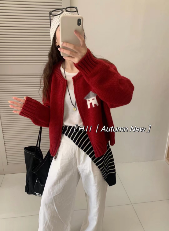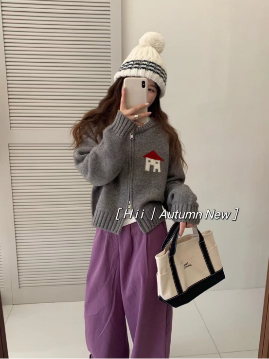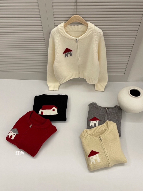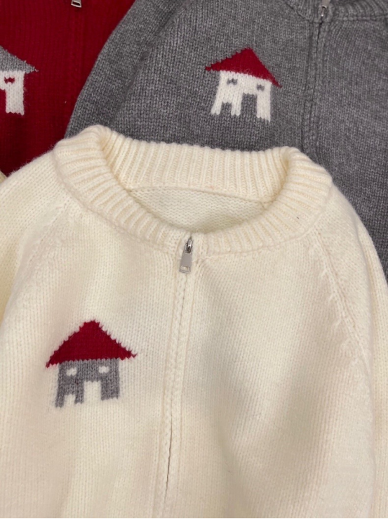 设计显得温柔大方,拉链既实用又增添时尚感。 小房子提花图案充满童趣与艺术气息,让这件开衫与众不同。