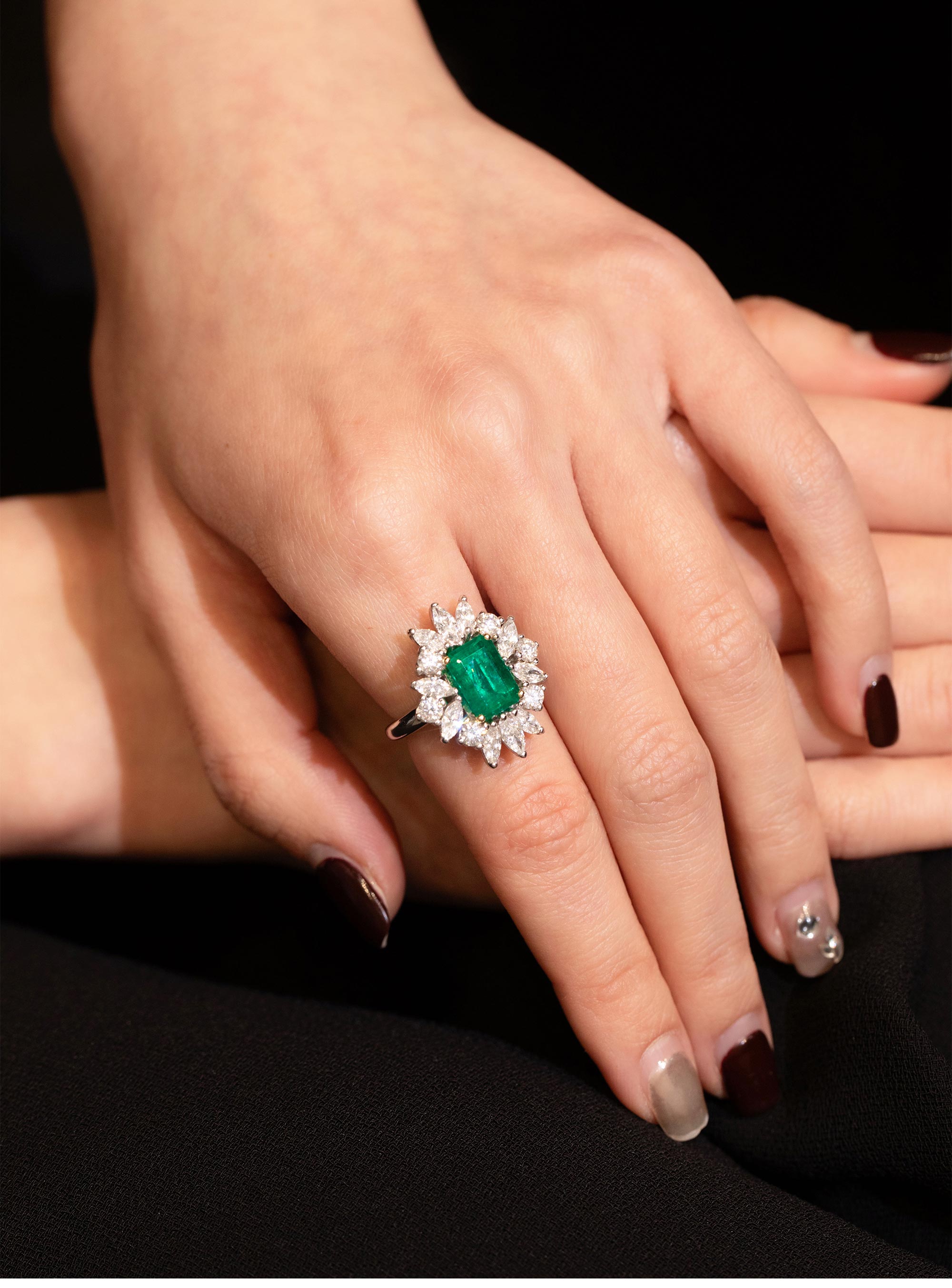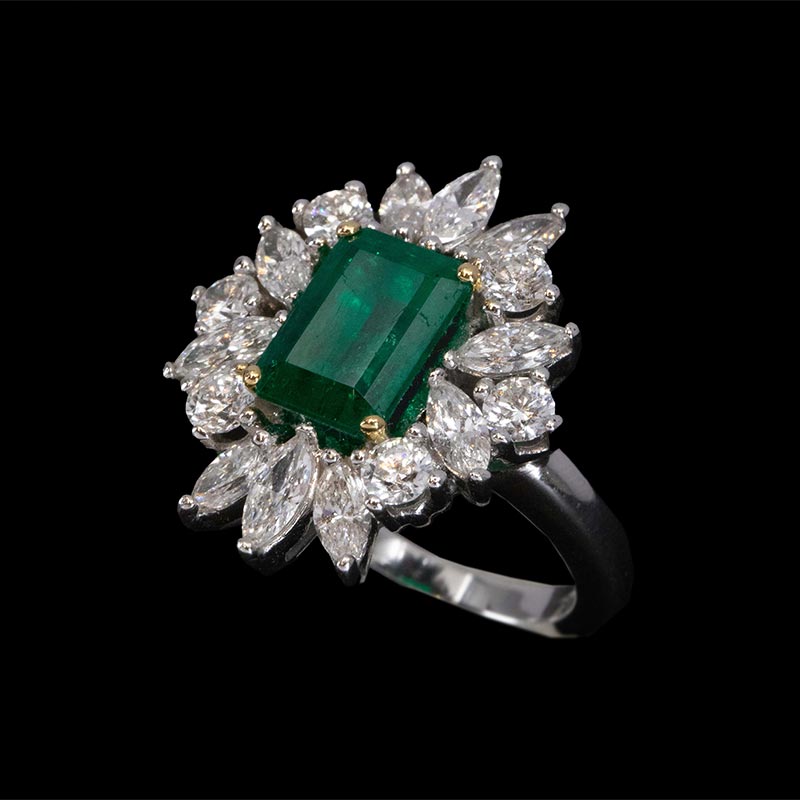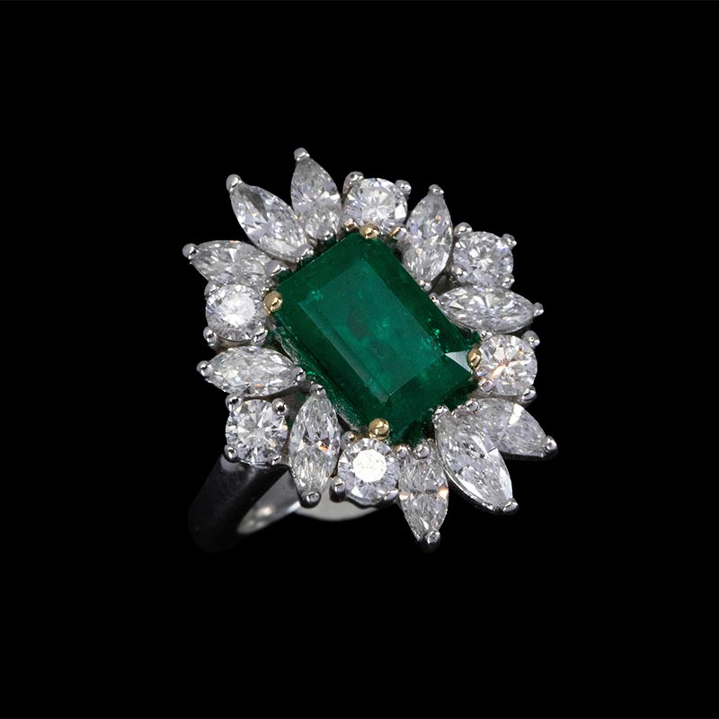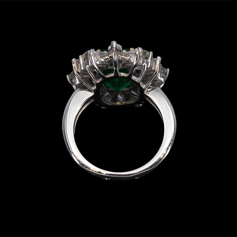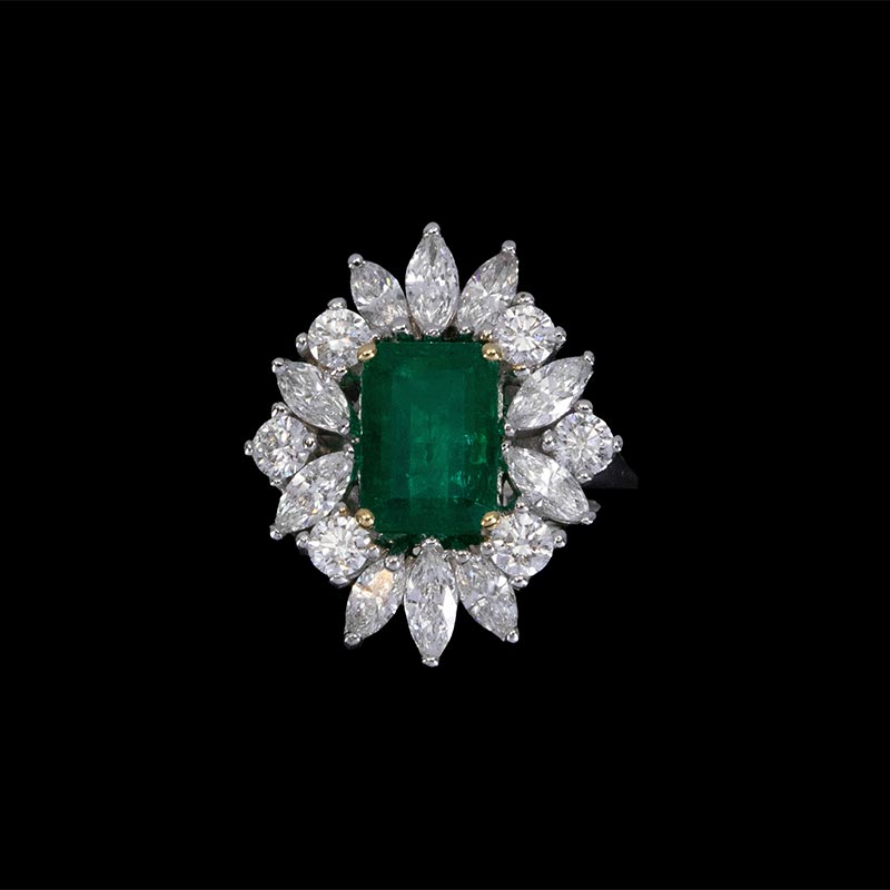 1970年代法国出品玛格丽特款花叶造型白金镶嵌钻石及祖母绿戒指