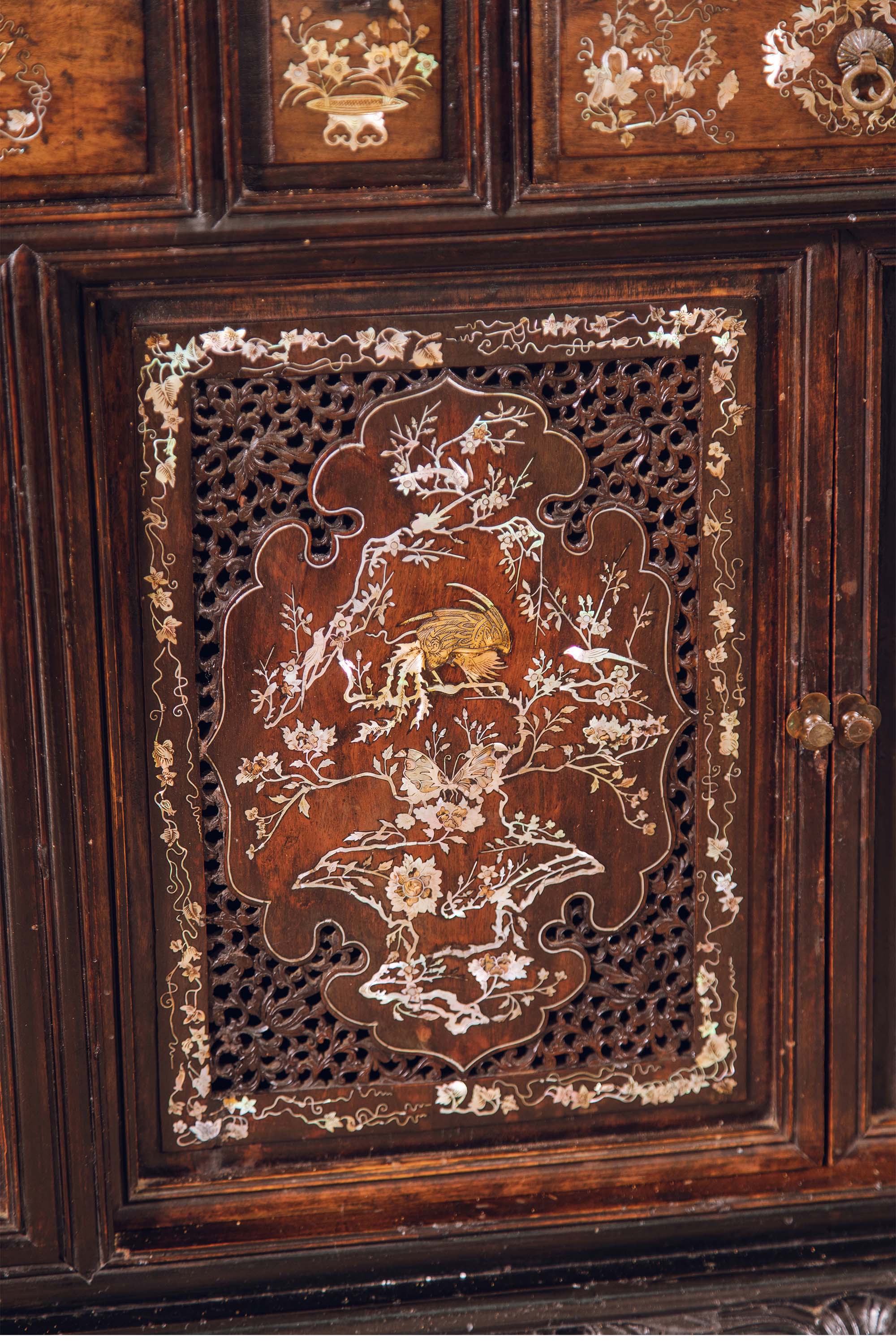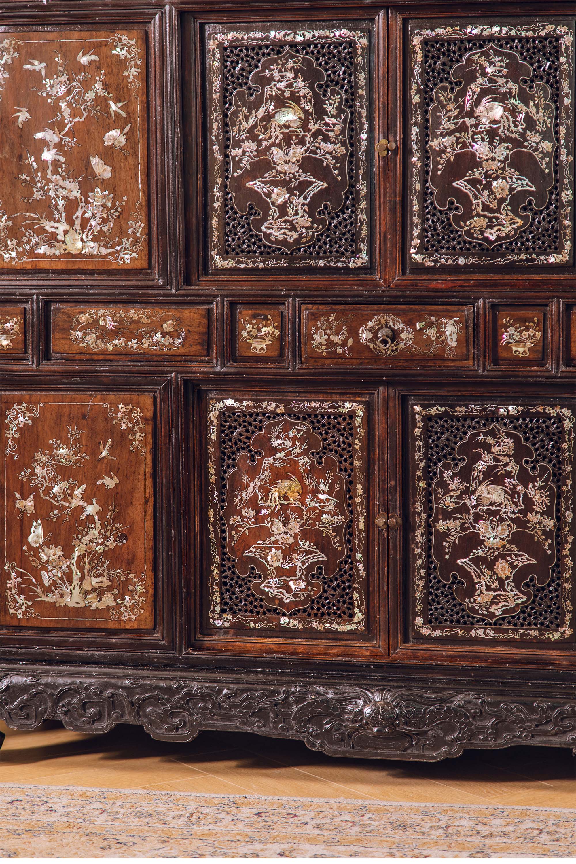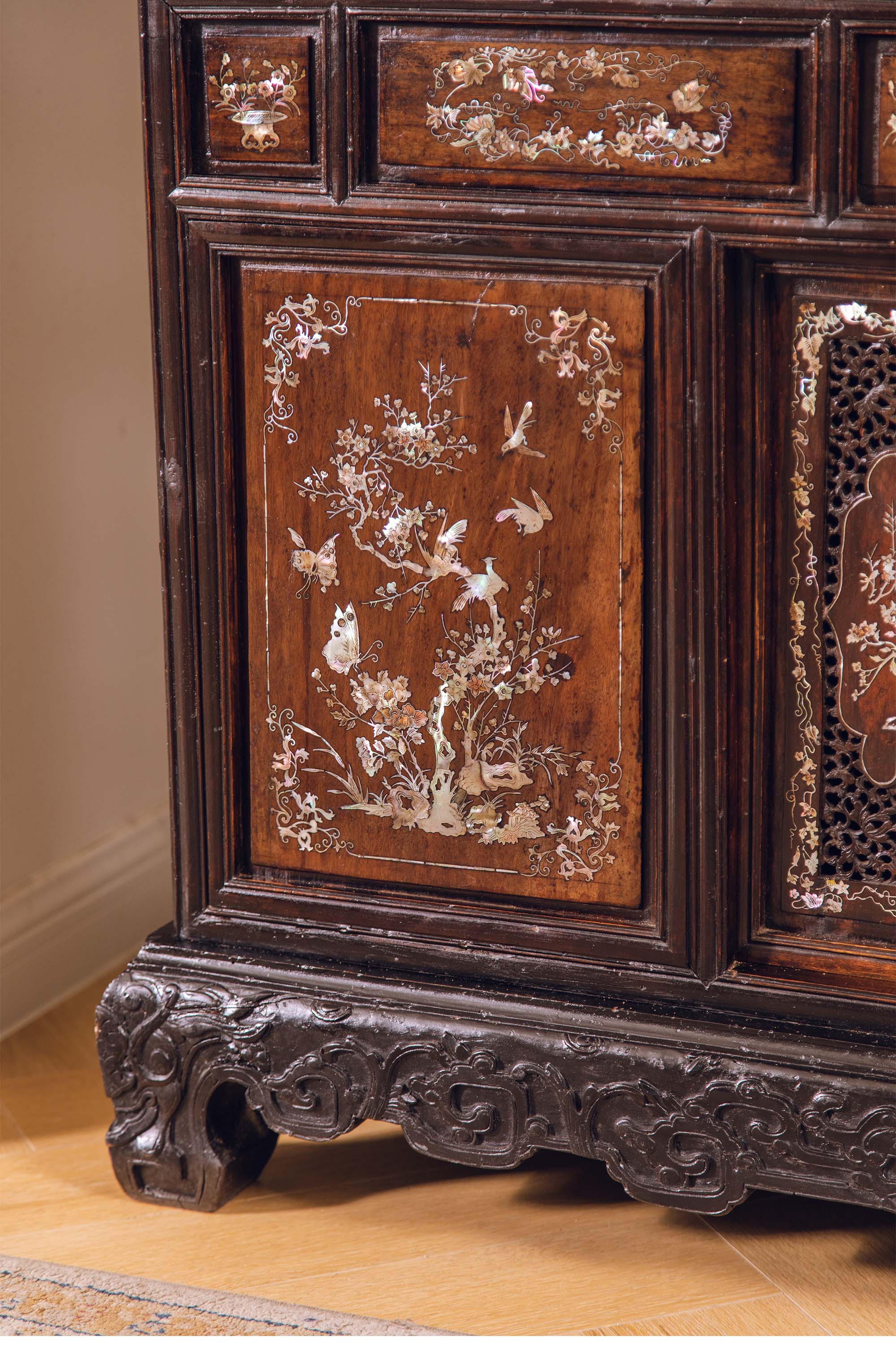 19世纪末中国出品花梨木精雕装饰鸟蝶繁花主题螺钿镶嵌边柜
