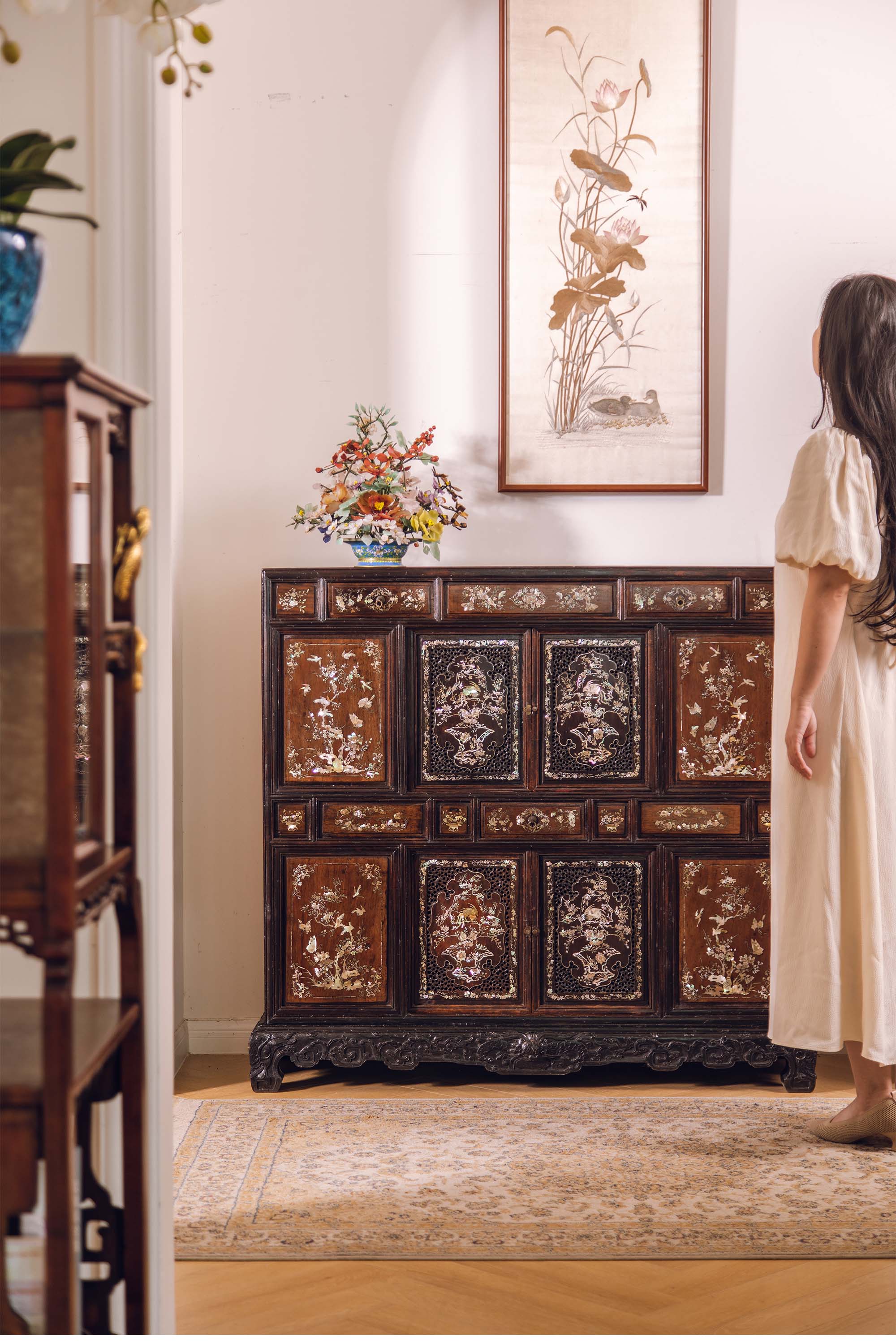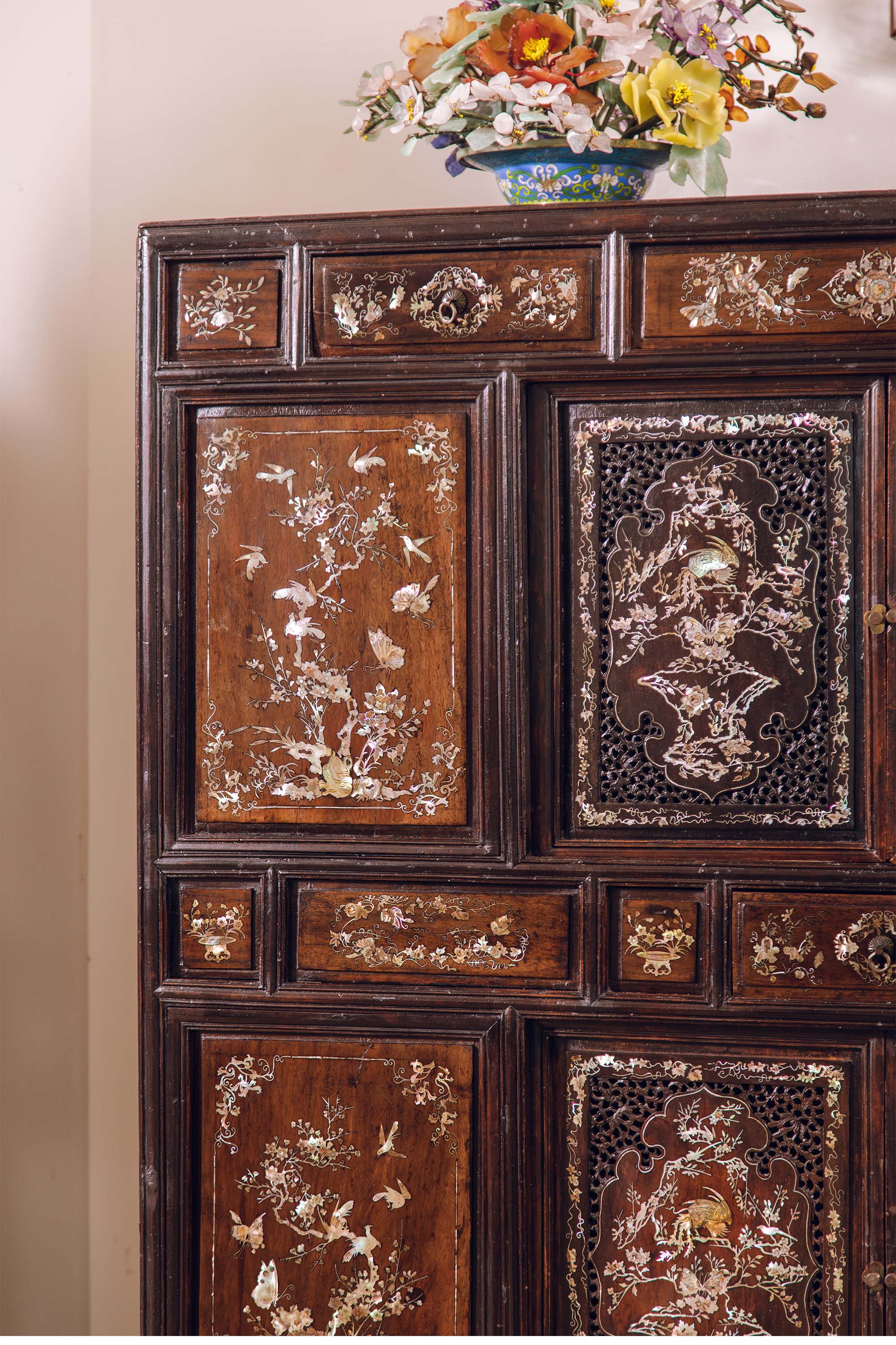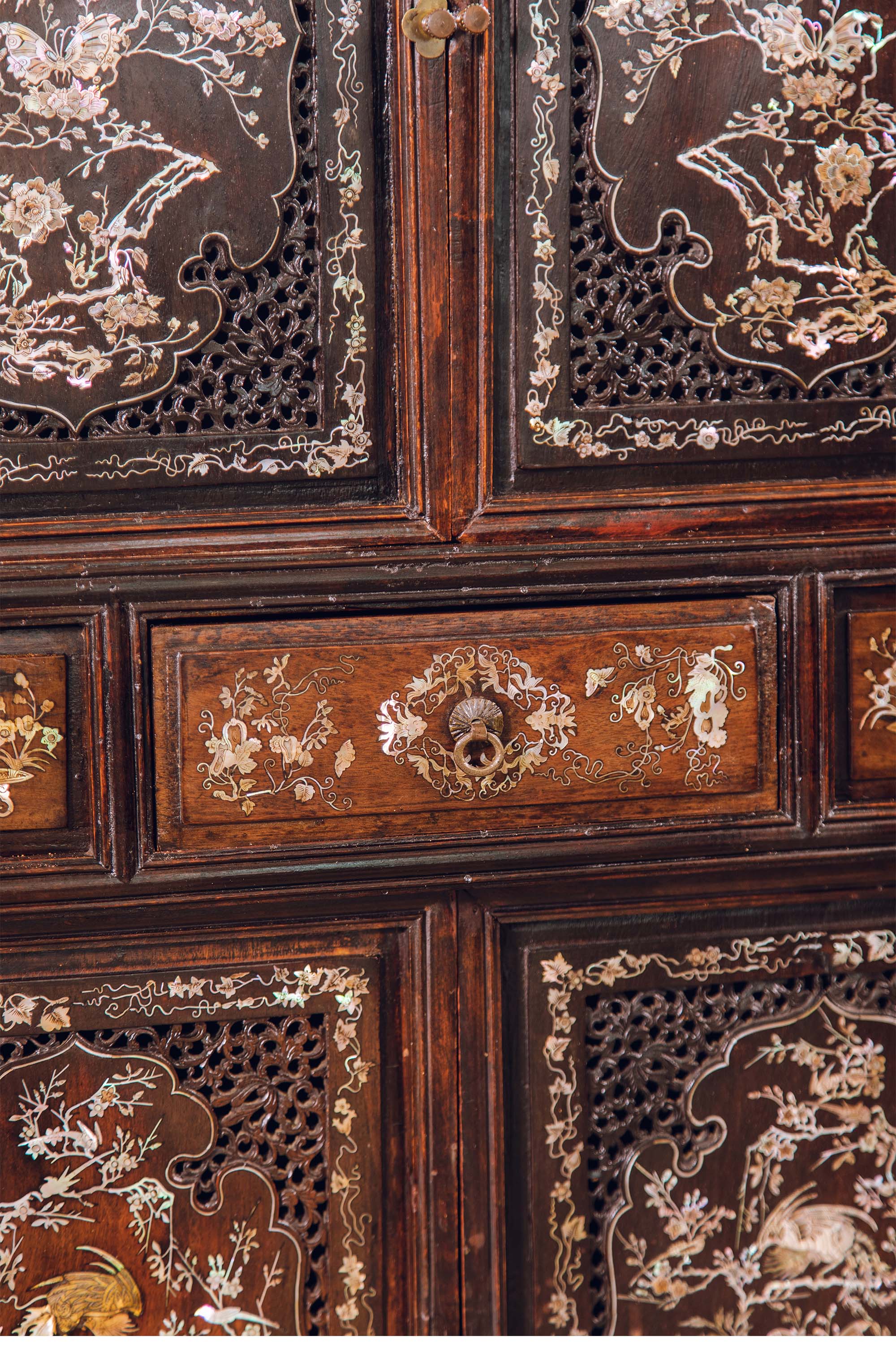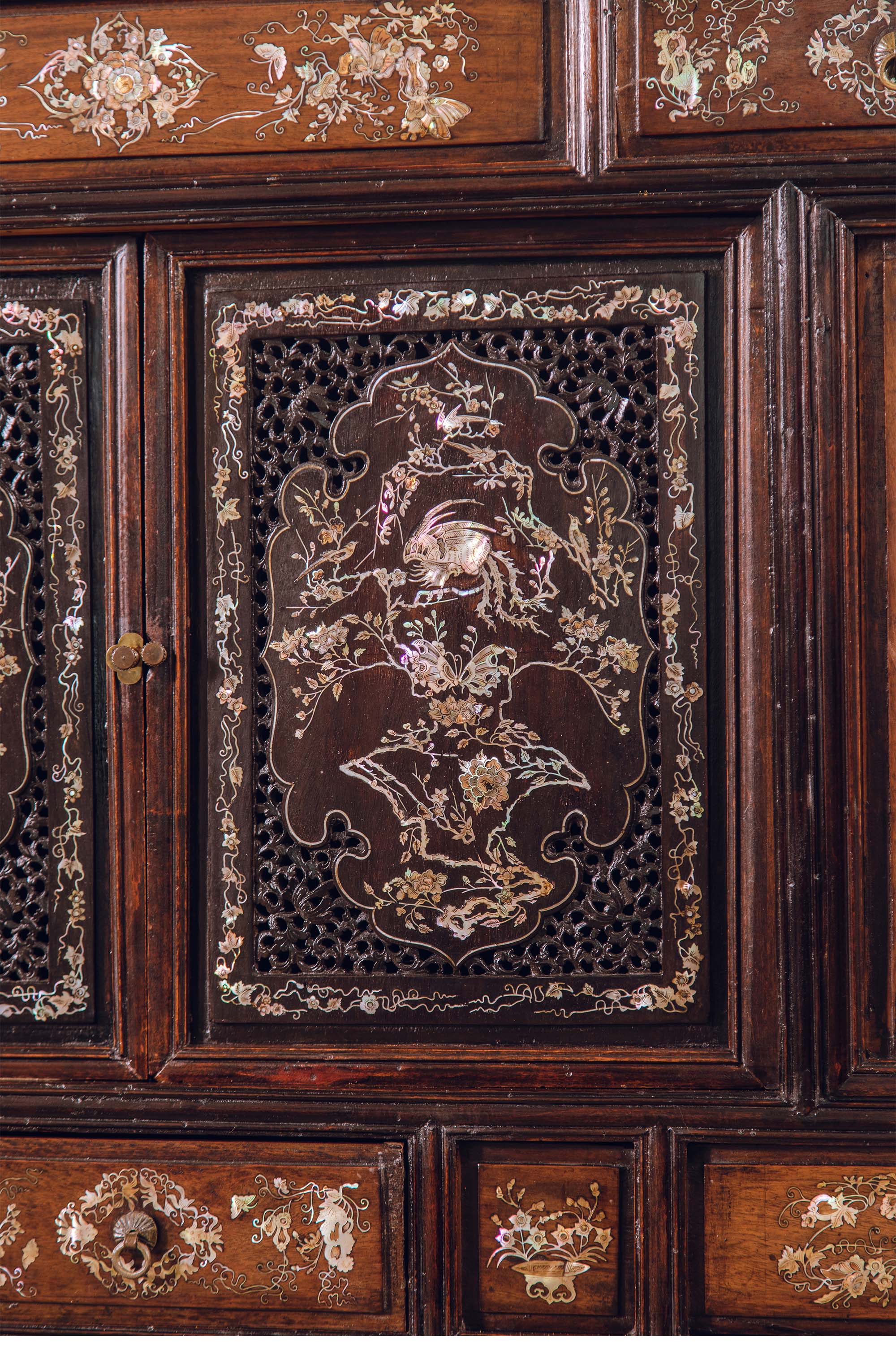 19世纪末中国出品花梨木精雕装饰鸟蝶繁花主题螺钿镶嵌边柜