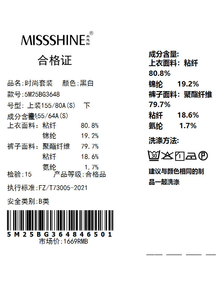 裤子面料:聚酯纤维79.7% 粘纤18.6% 氨纶1.7%