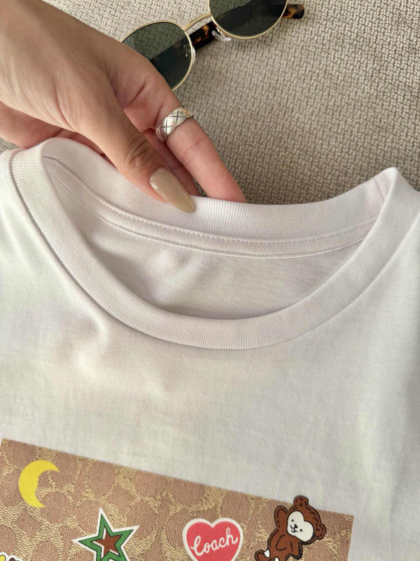不用担心印花太大,会很硬不透气,这款采用的是水浆多重工艺,很轻透~