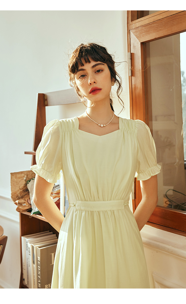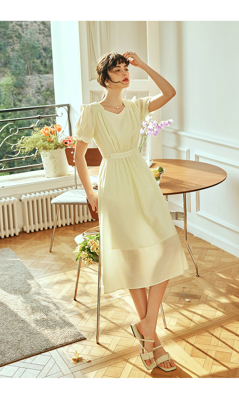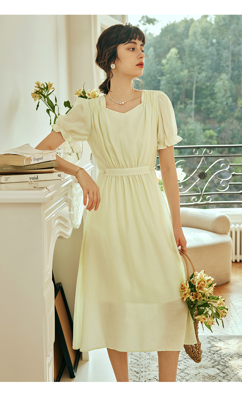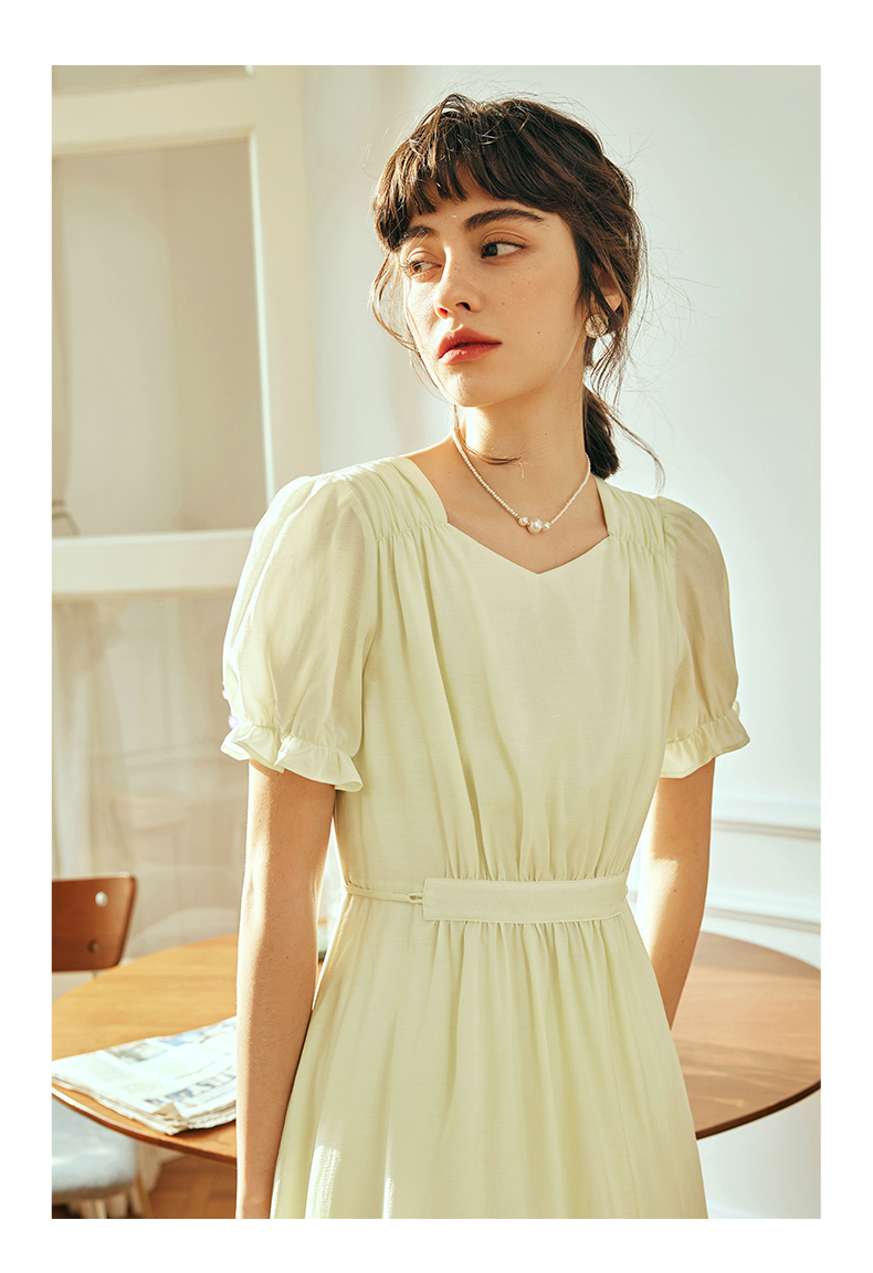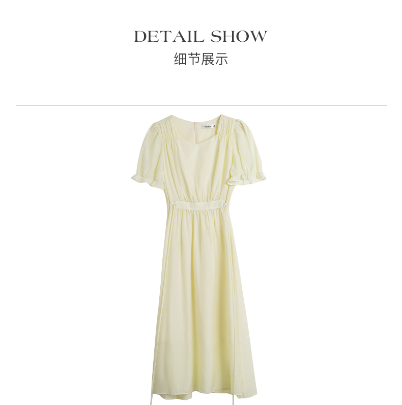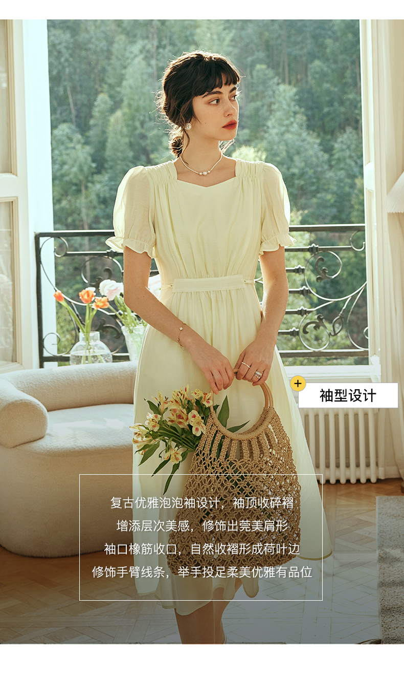 OLrain欧芮儿法式浅黄色连衣裙女夏季2023年新款收腰泡泡袖茶歇裙
