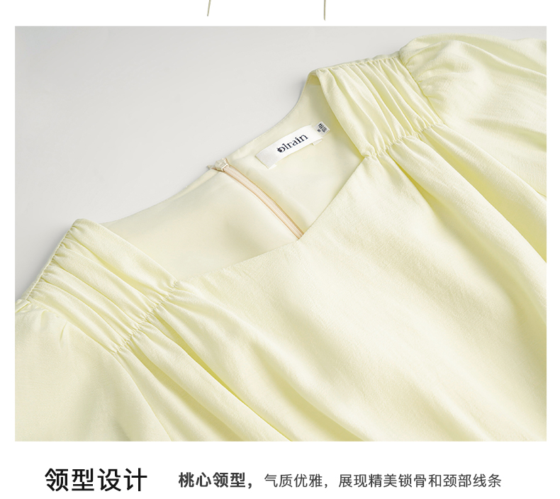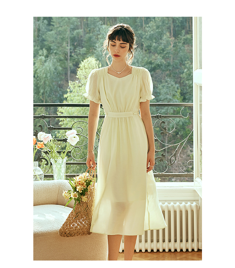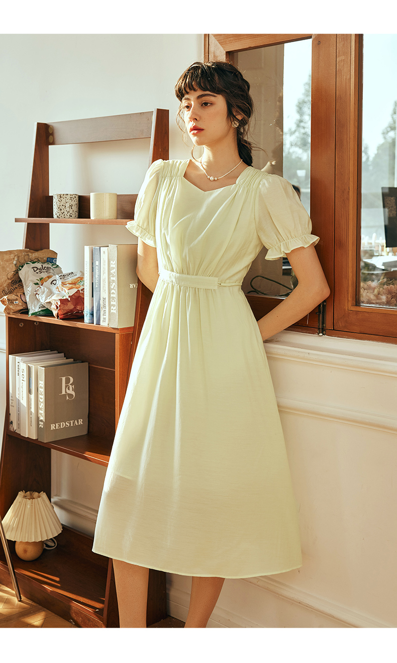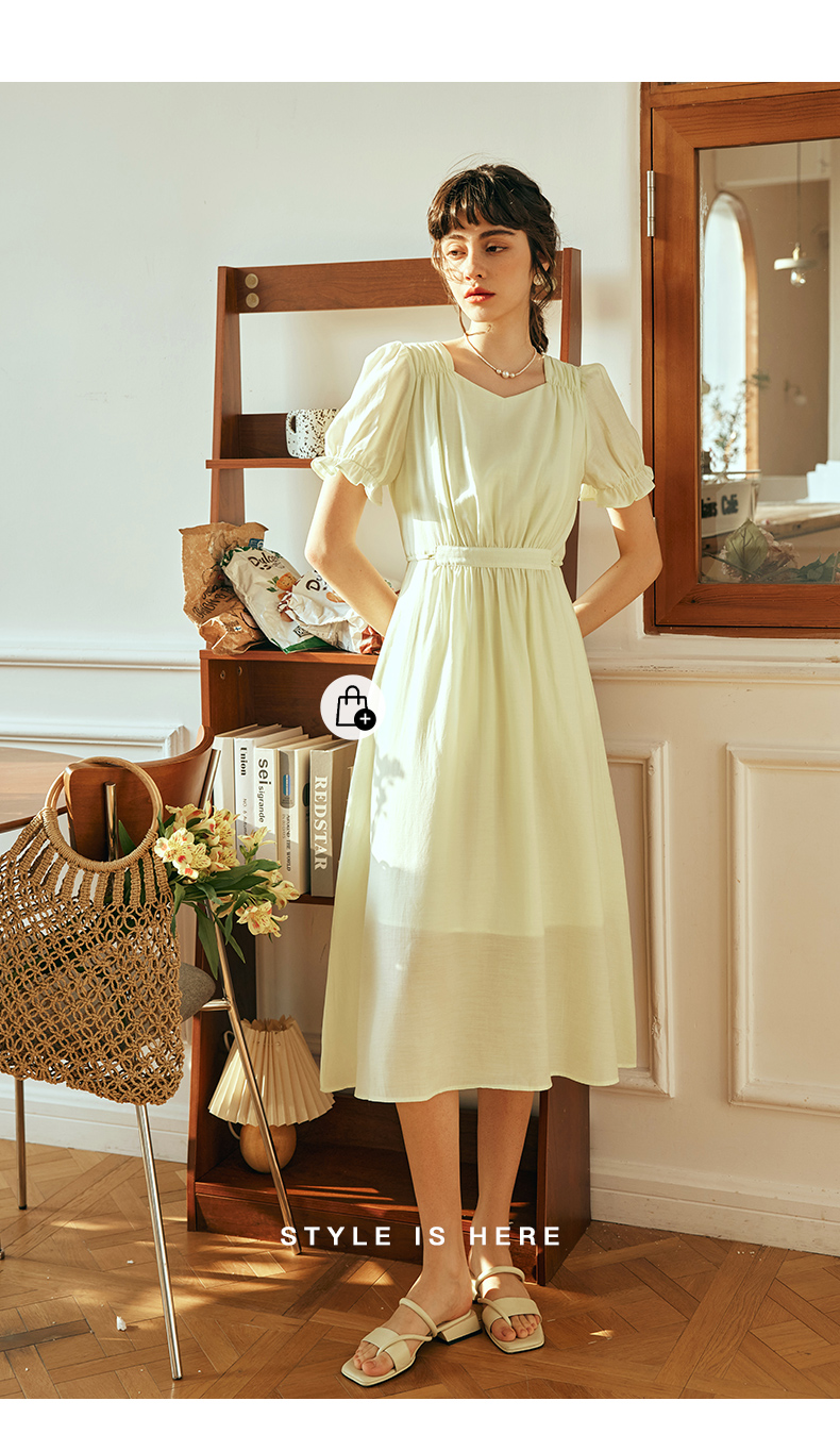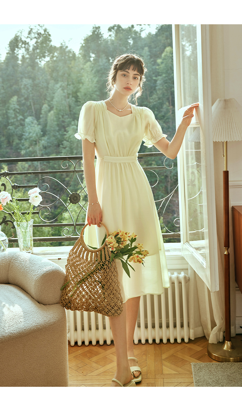 OLrain欧芮儿法式浅黄色连衣裙女夏季2023年新款收腰泡泡袖茶歇裙