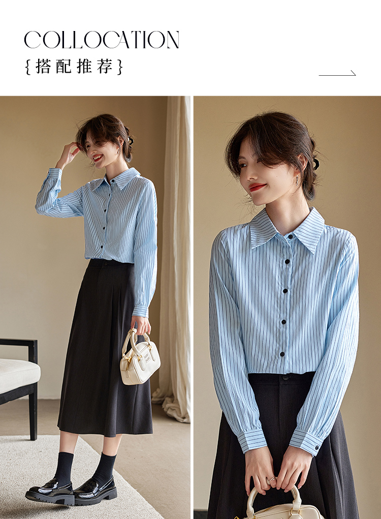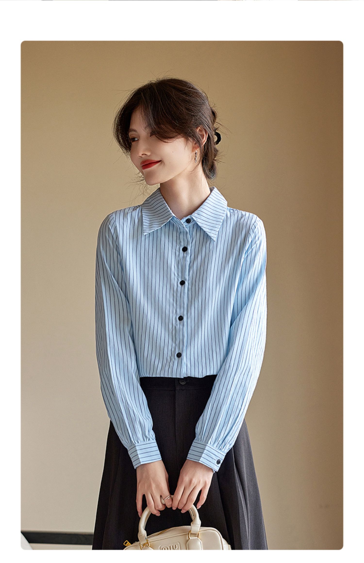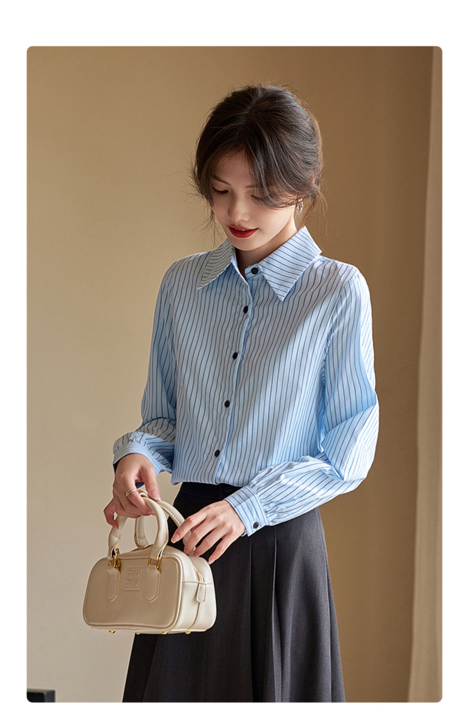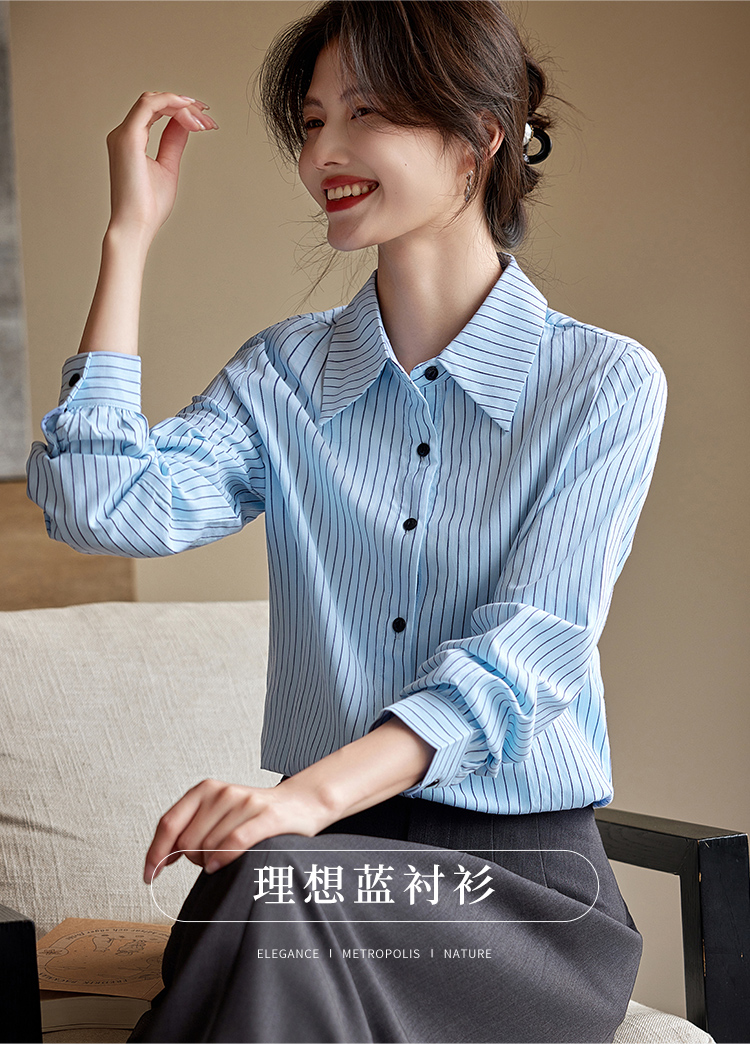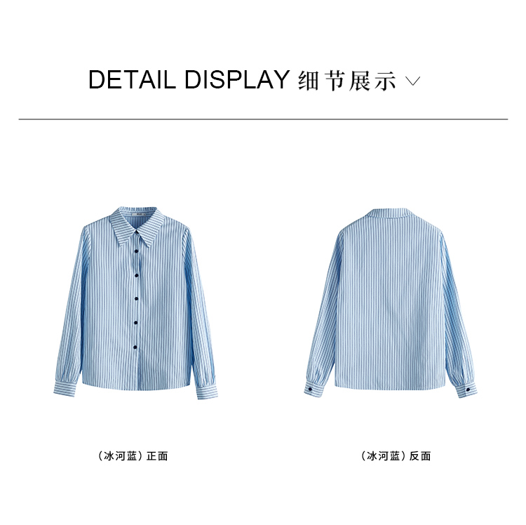【专属特价】熙世界设计感蓝色竖条纹衬衫女春秋2025年新款法式通勤长袖气质衬衣