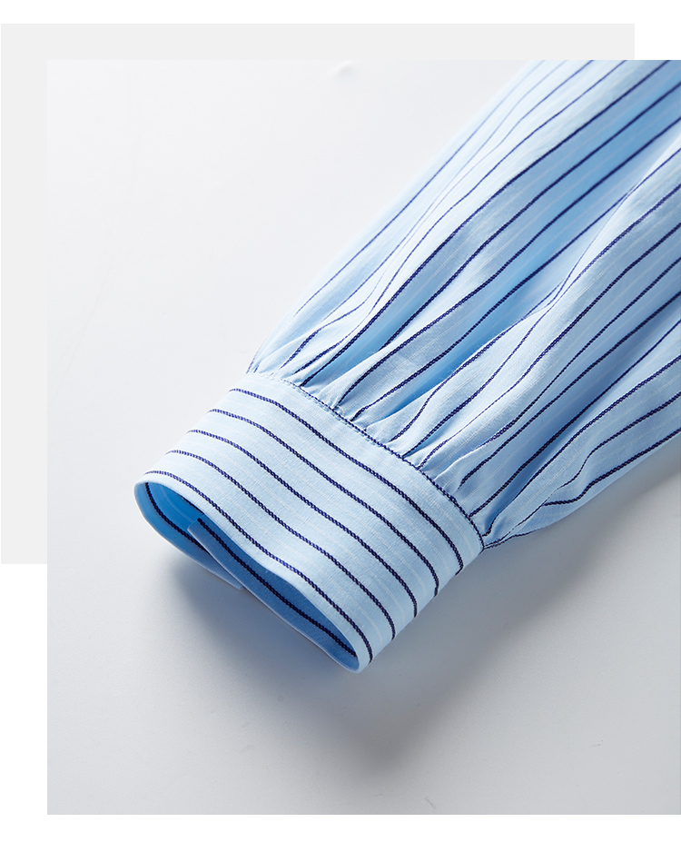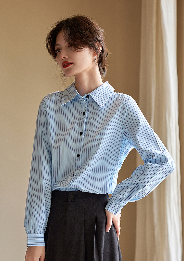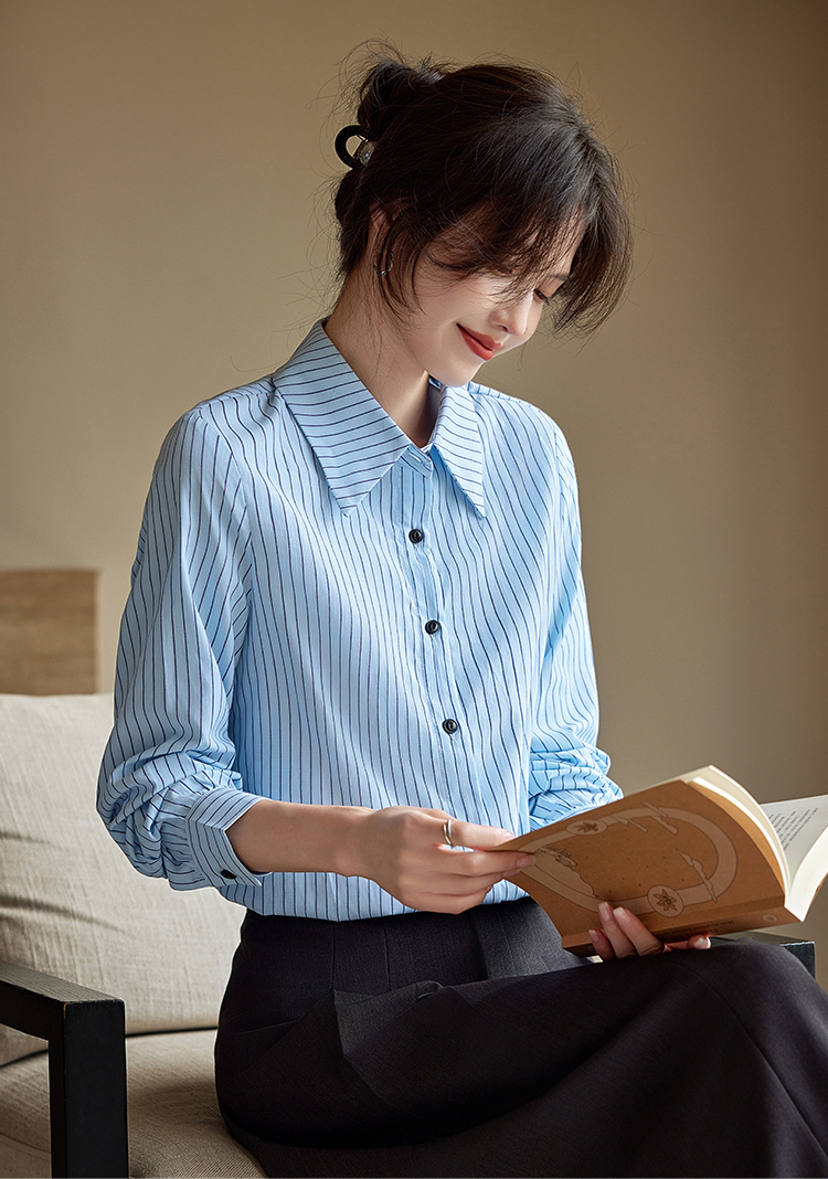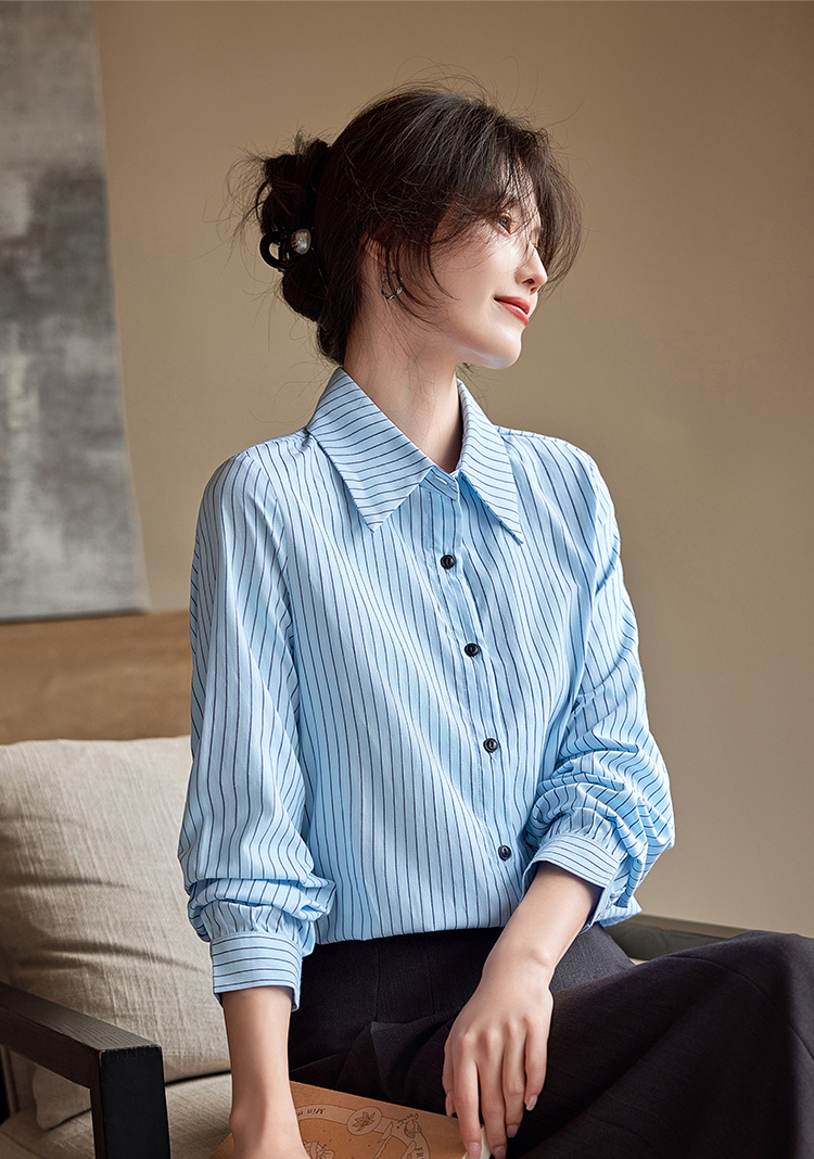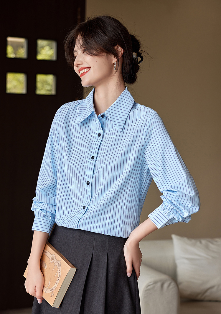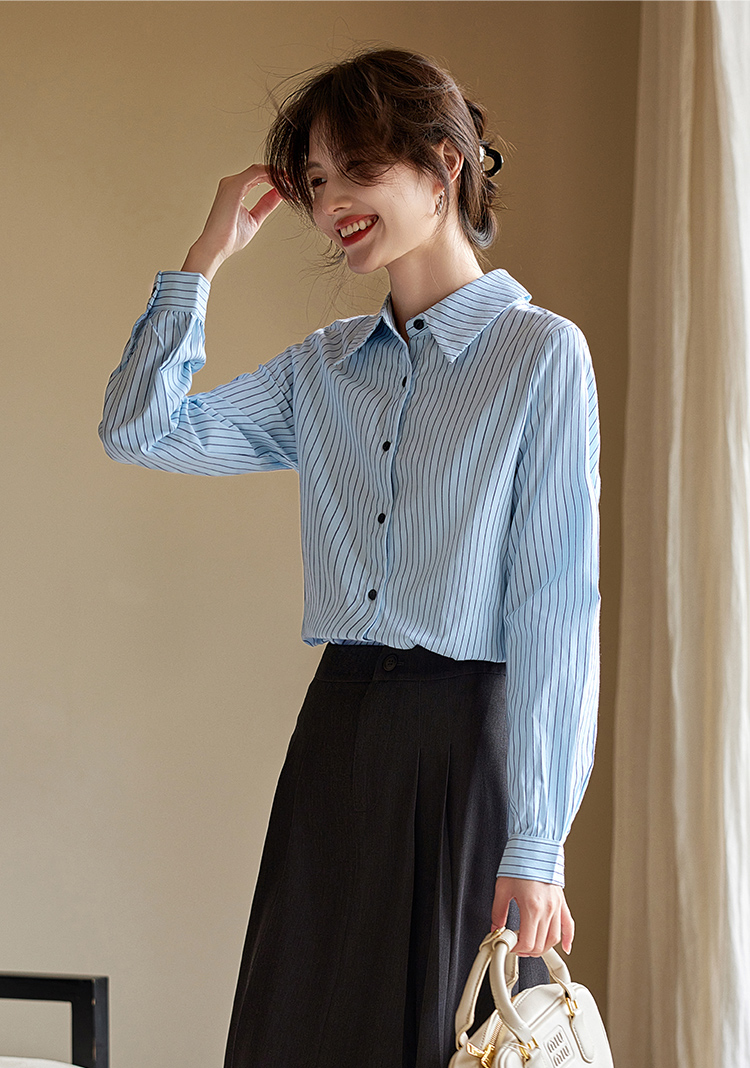 【专属特价】熙世界设计感蓝色竖条纹衬衫女春秋2025年新款法式通勤长袖气质衬衣