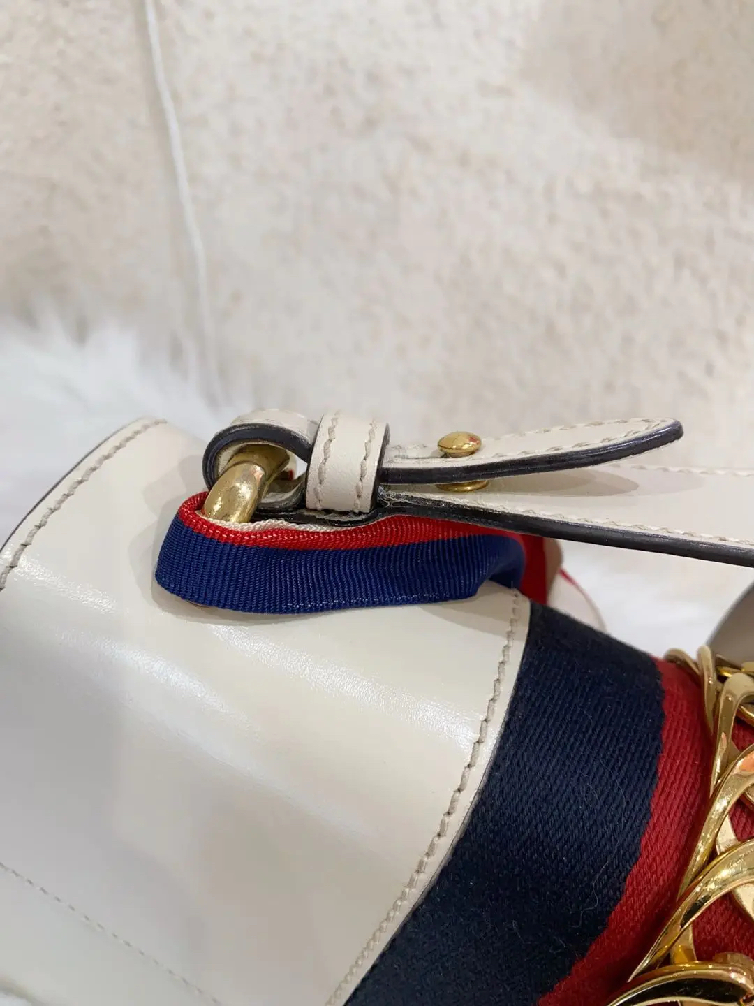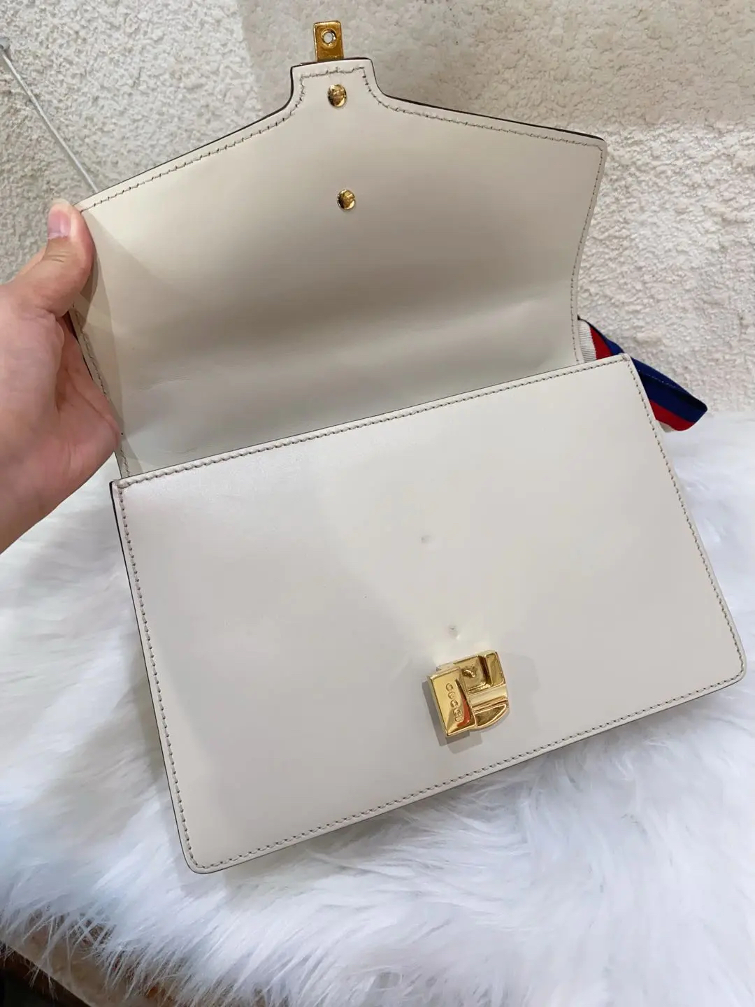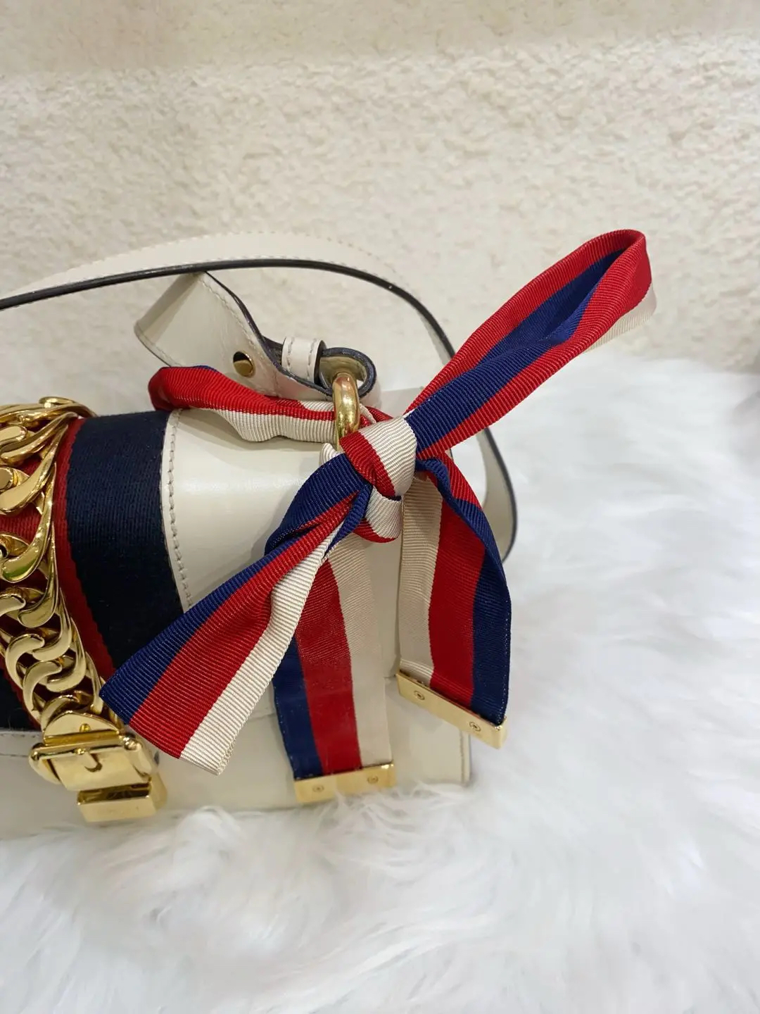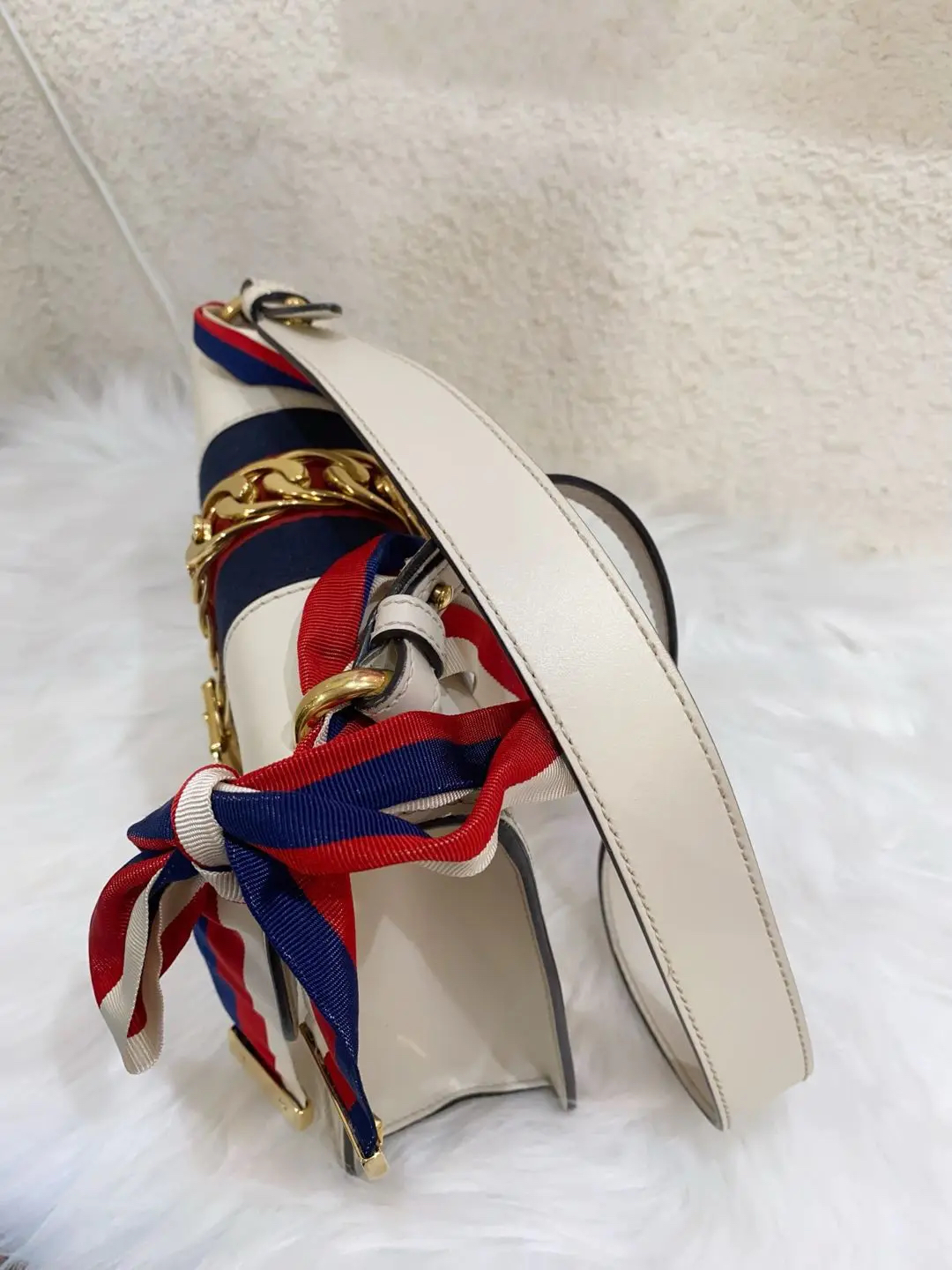 【商品详情】正品二手 Gucci 塞尔维亚 白色 box牛皮 中号 丝巾包🤭95新 26×17 配件:丝带 肩带。金属正常使用感。优雅lady款