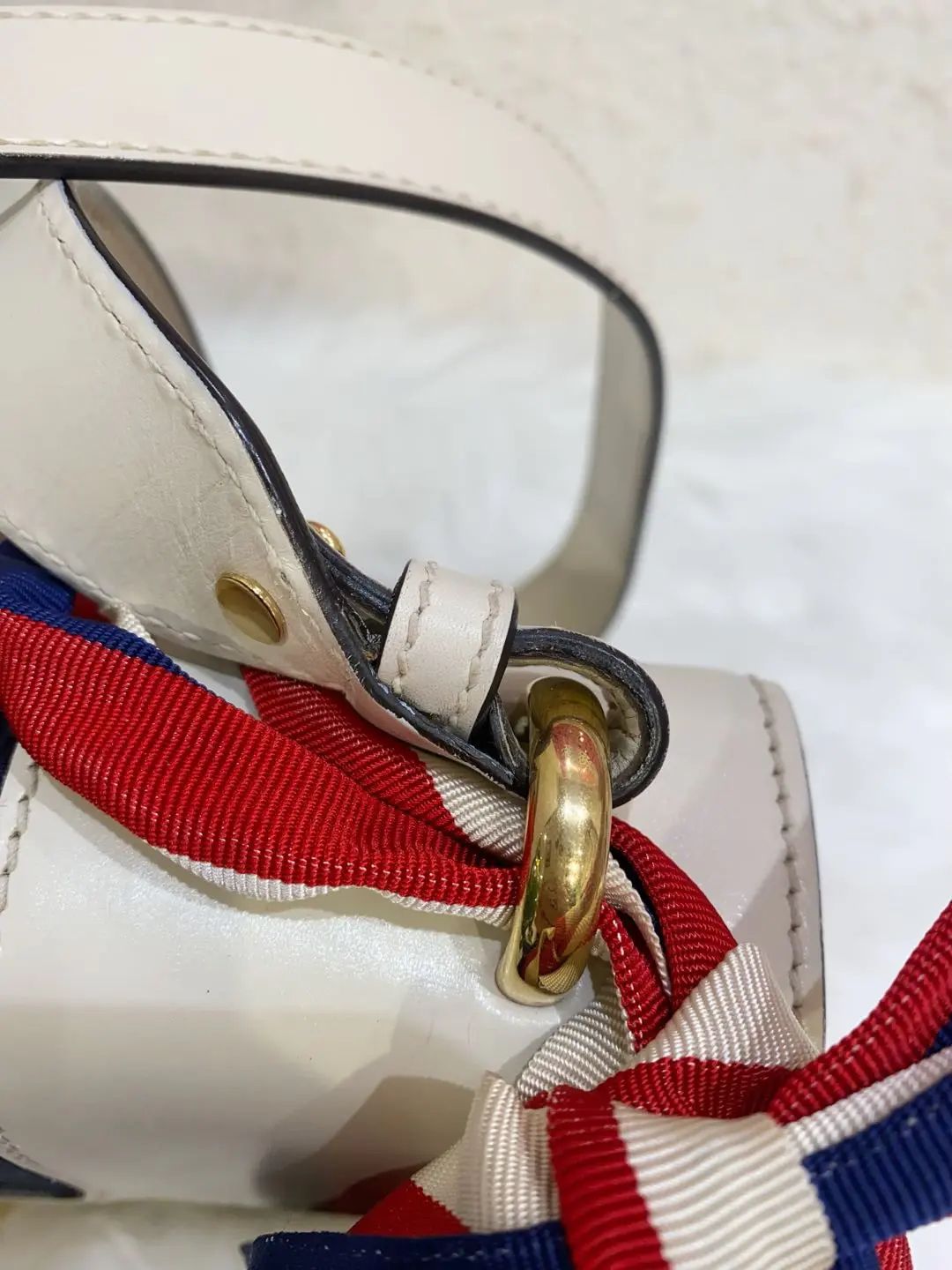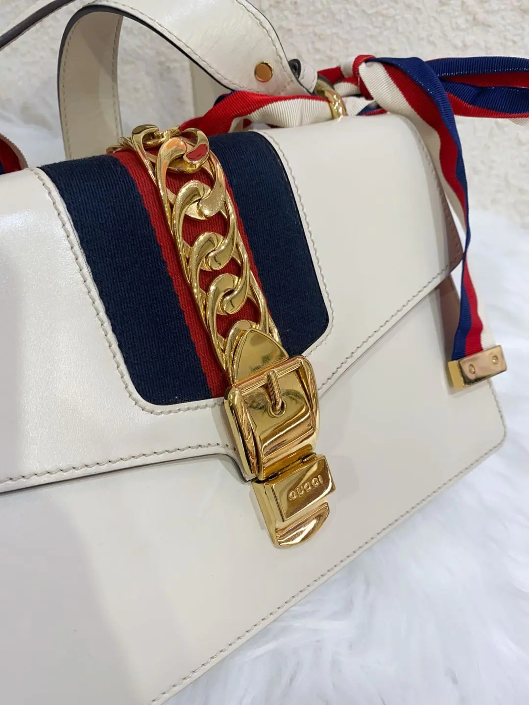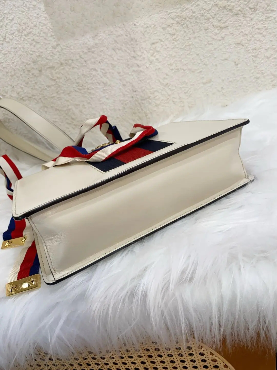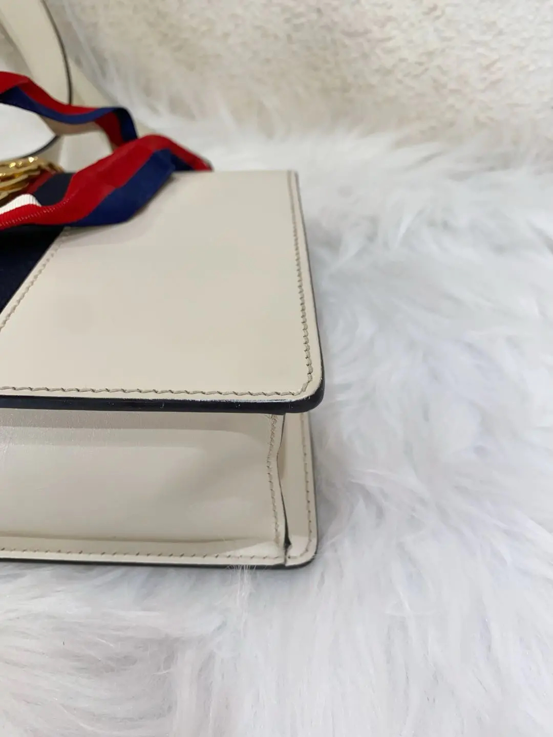 【商品详情】正品二手 Gucci 塞尔维亚 白色 box牛皮 中号 丝巾包🤭95新 26×17 配件:丝带 肩带。金属正常使用感。优雅lady款