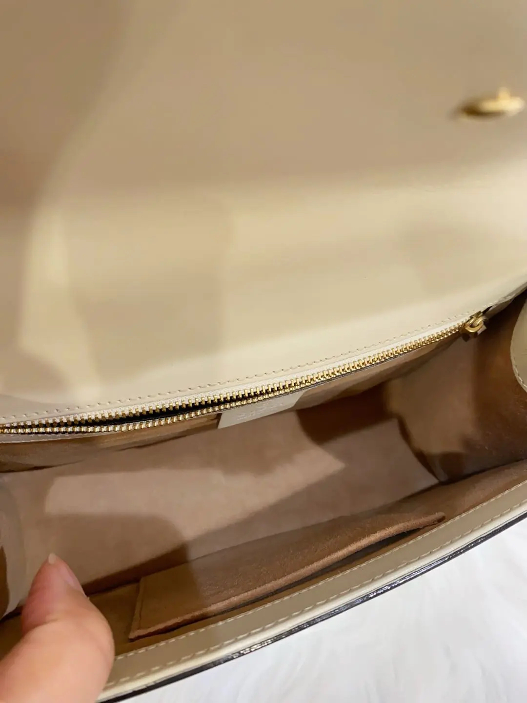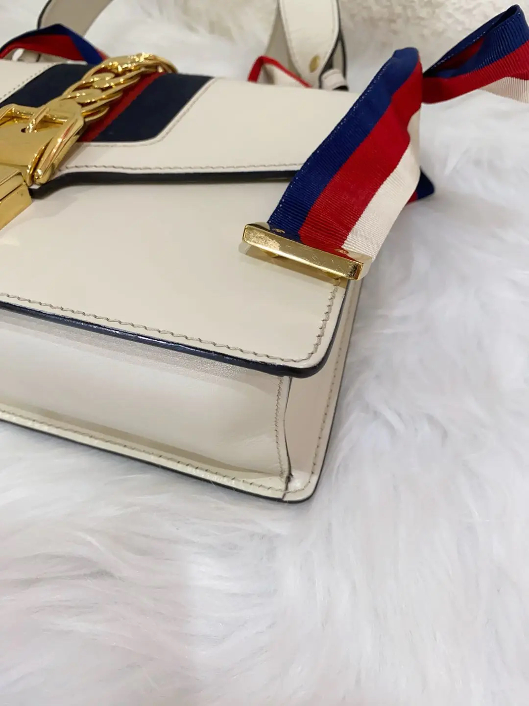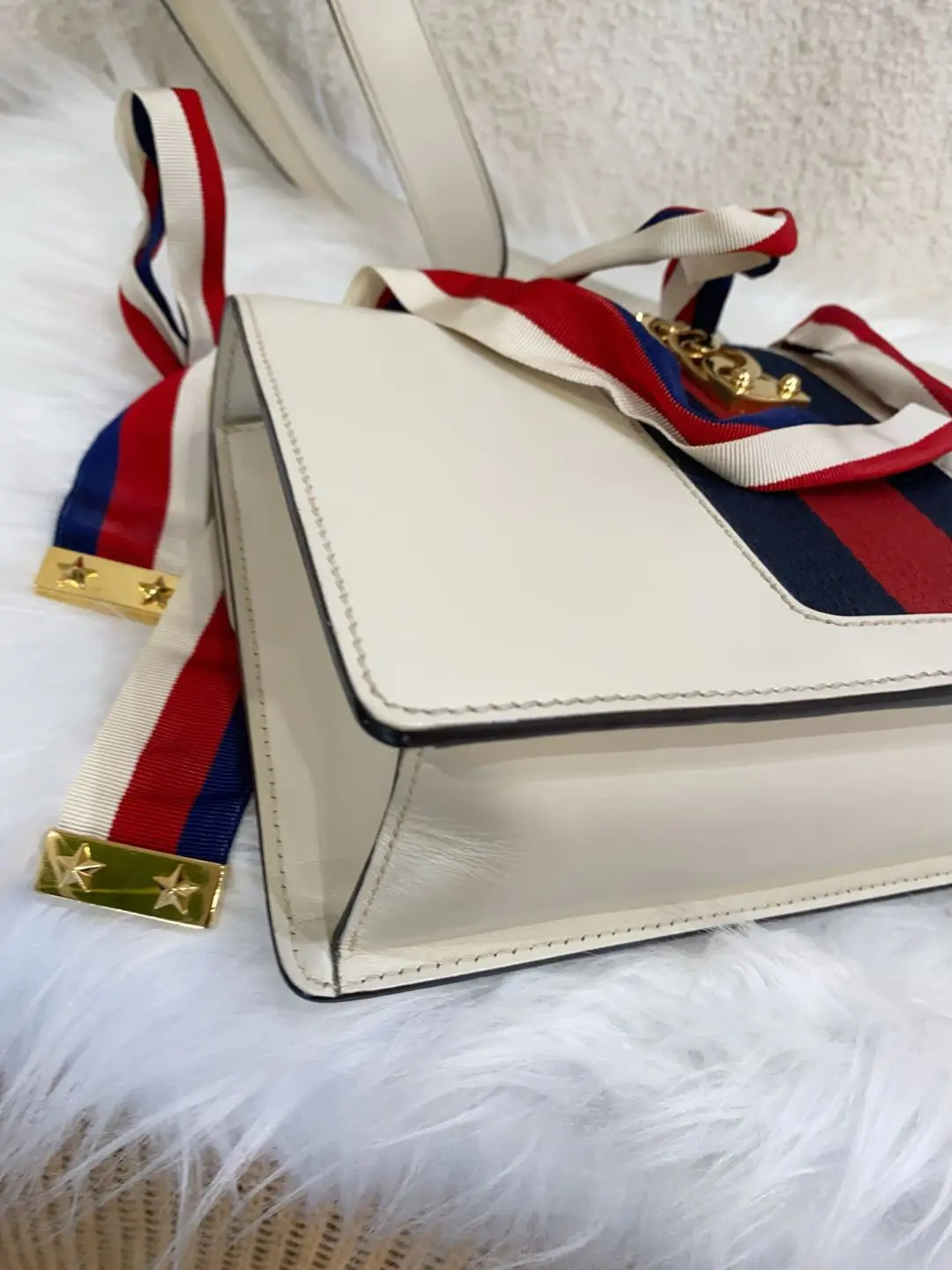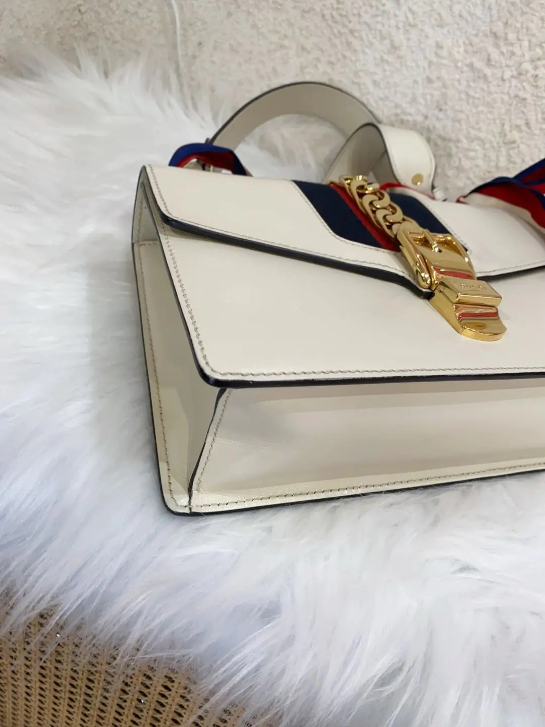 【商品详情】正品二手 Gucci 塞尔维亚 白色 box牛皮 中号 丝巾包🤭95新 26×17 配件:丝带 肩带。金属正常使用感。优雅lady款
